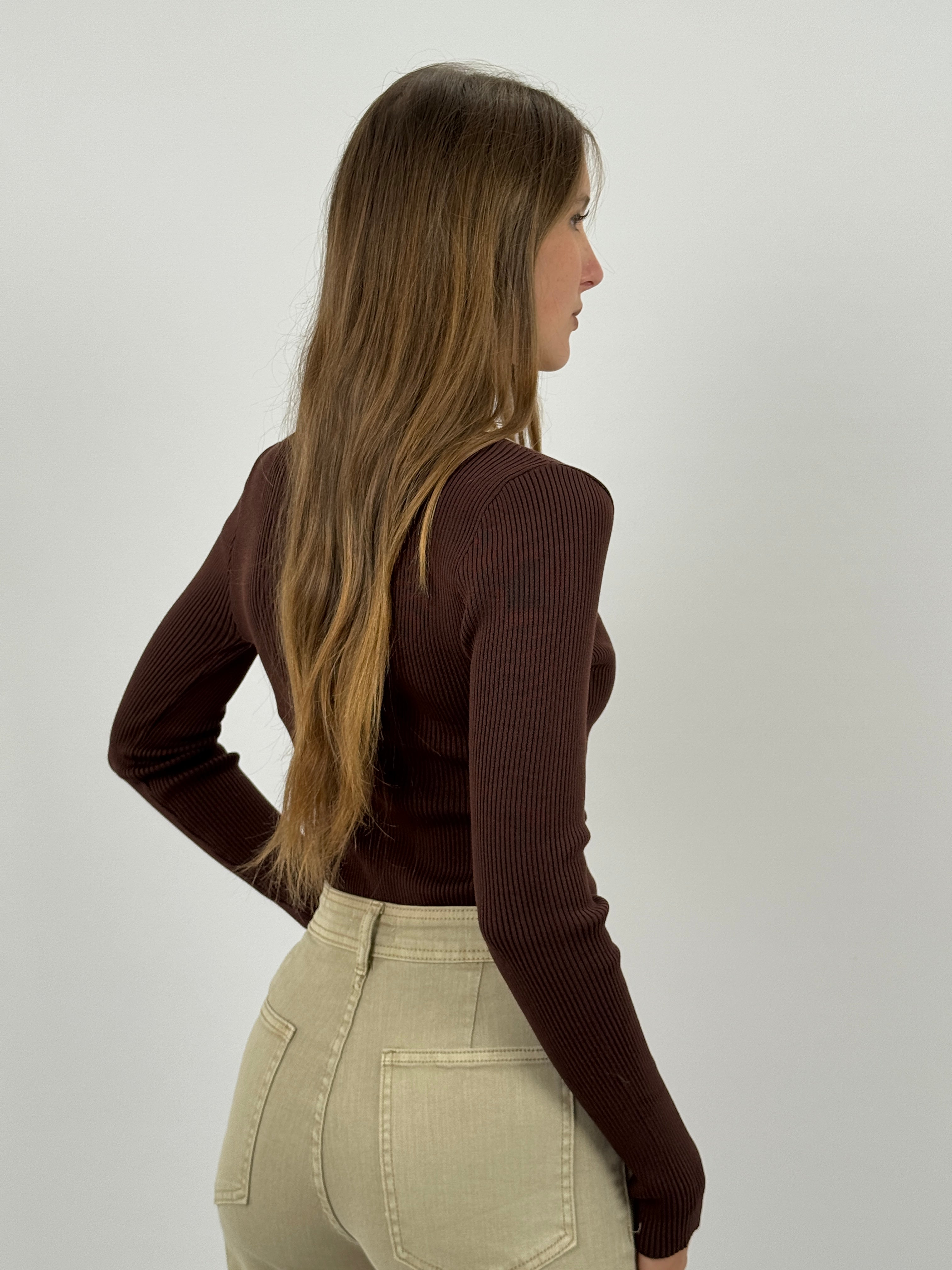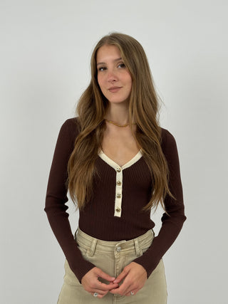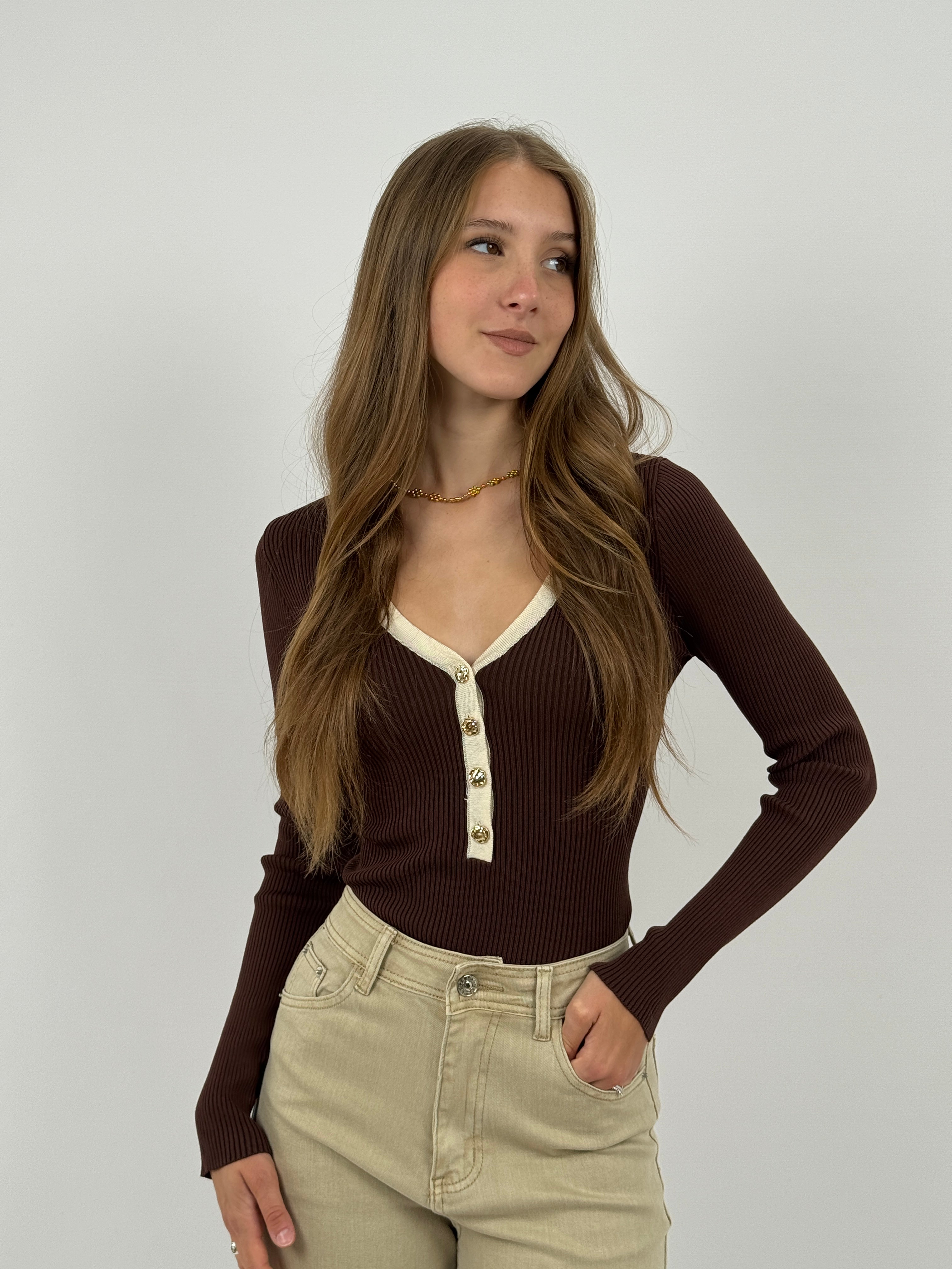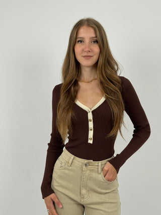 Body in maglia marrone a costine con bordi a contrasto e bottoni dorati sul davanti.