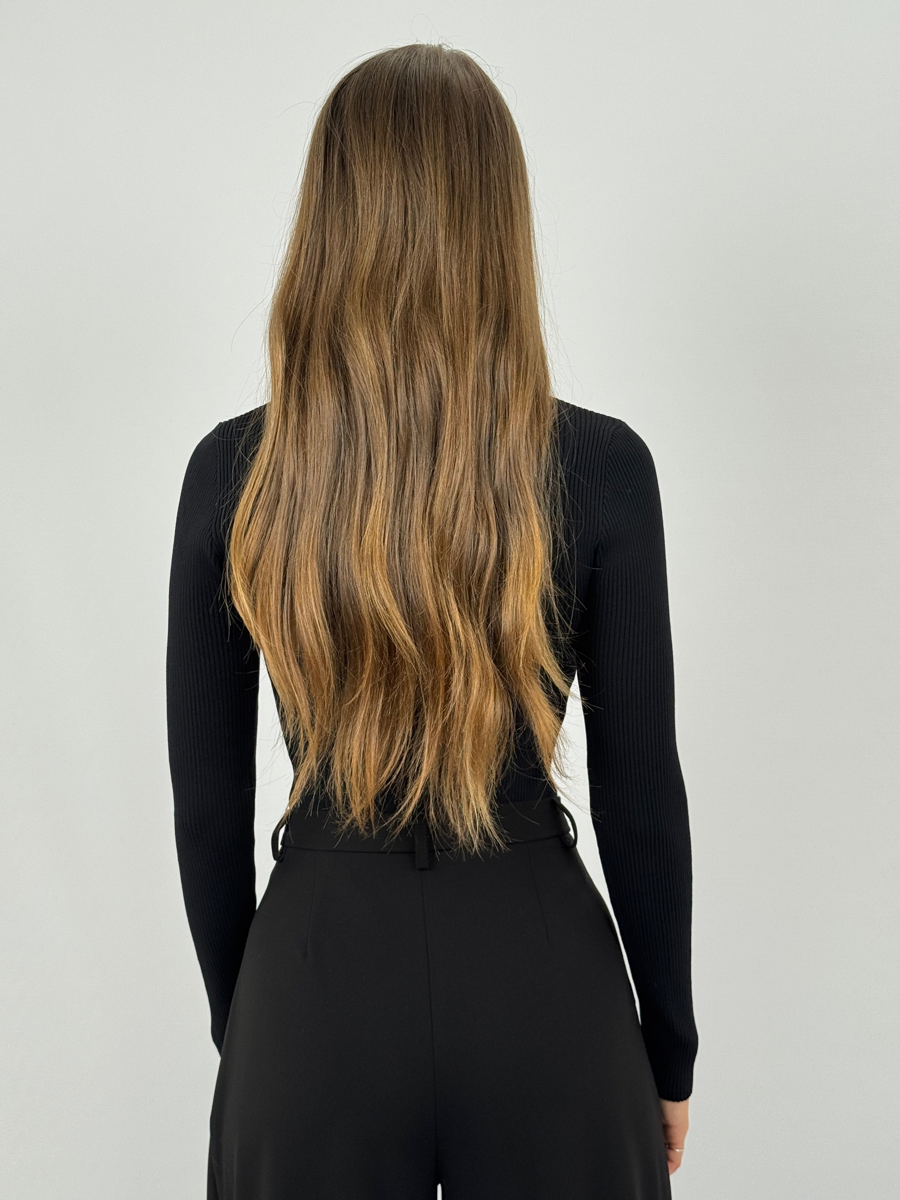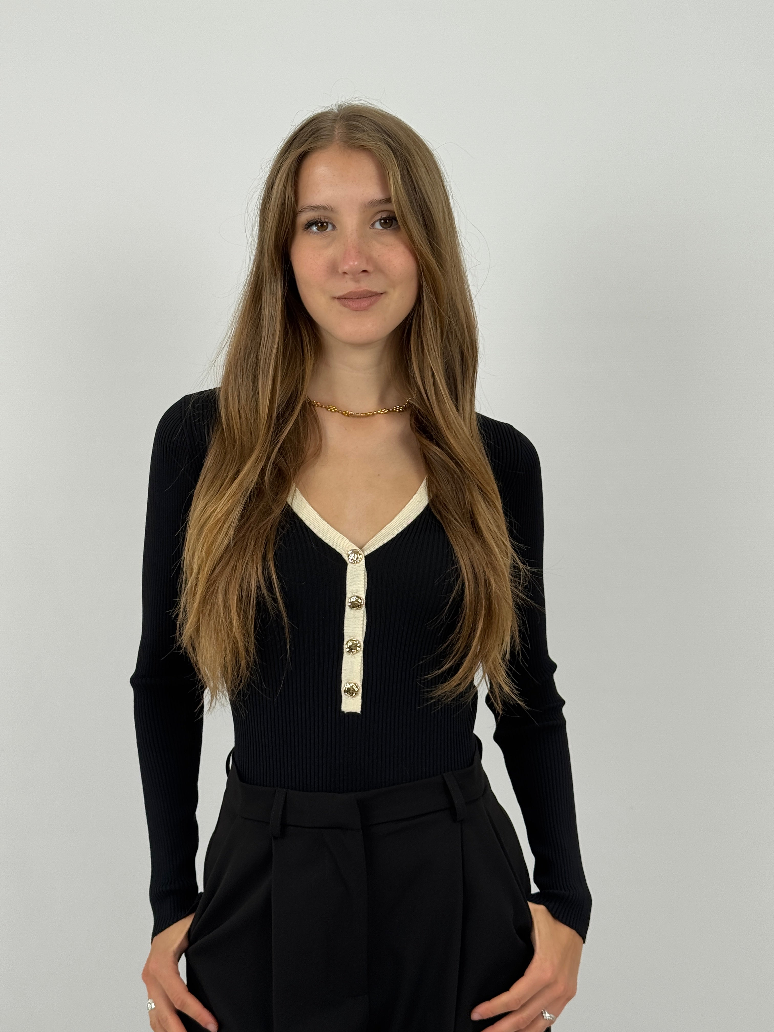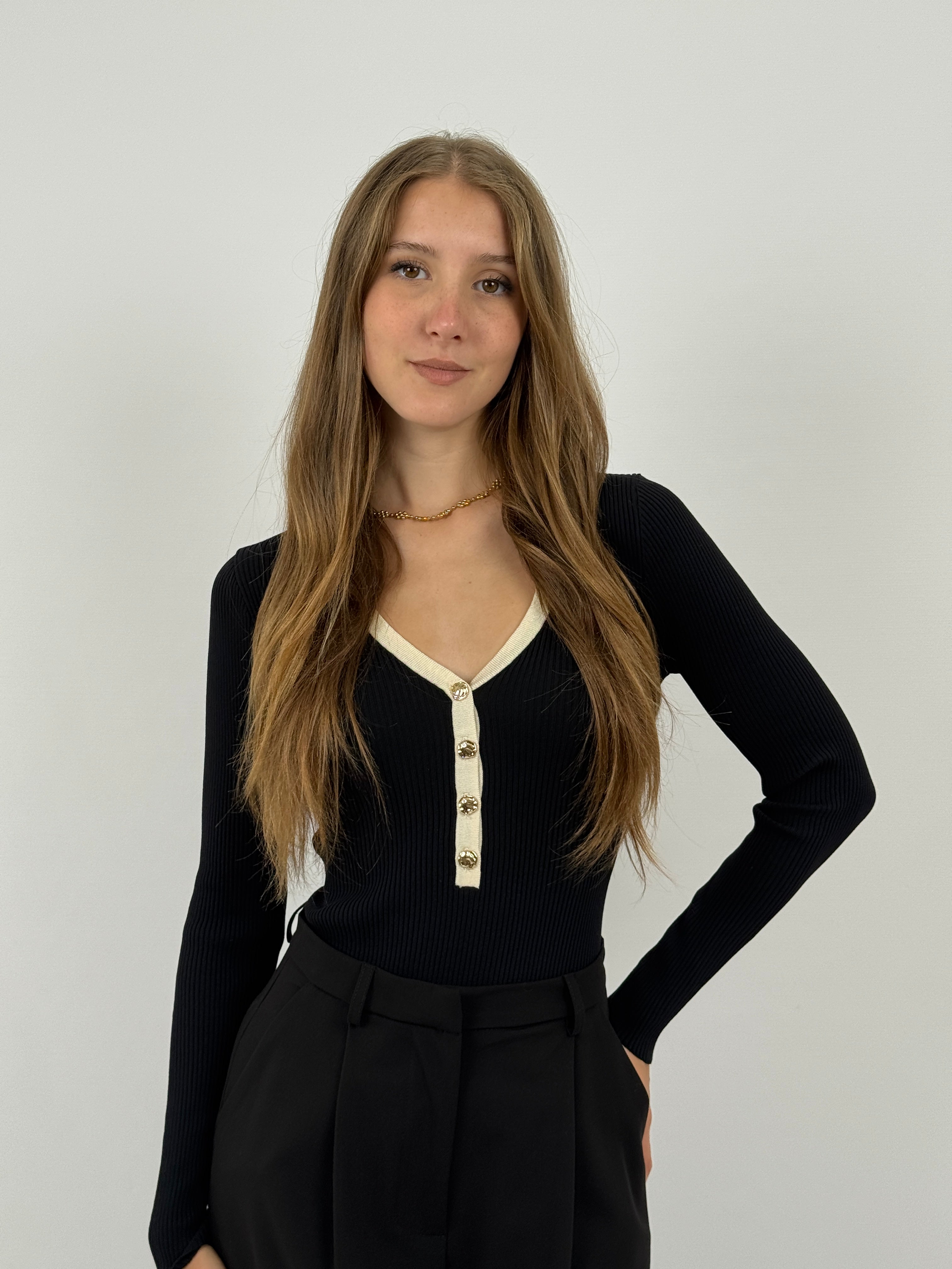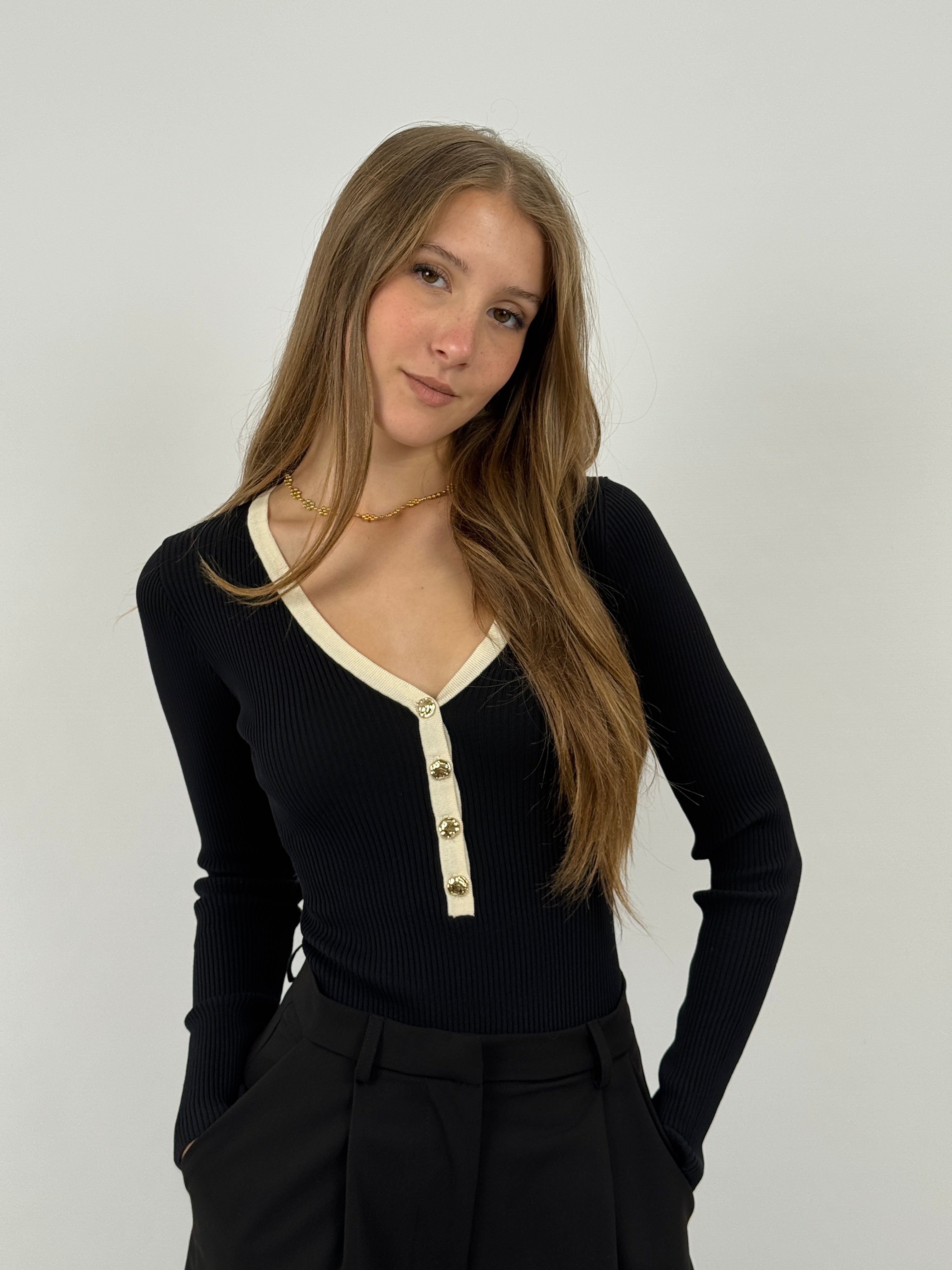 Body in maglia nero a costine con bordi a contrasto e bottoni dorati sul davanti.