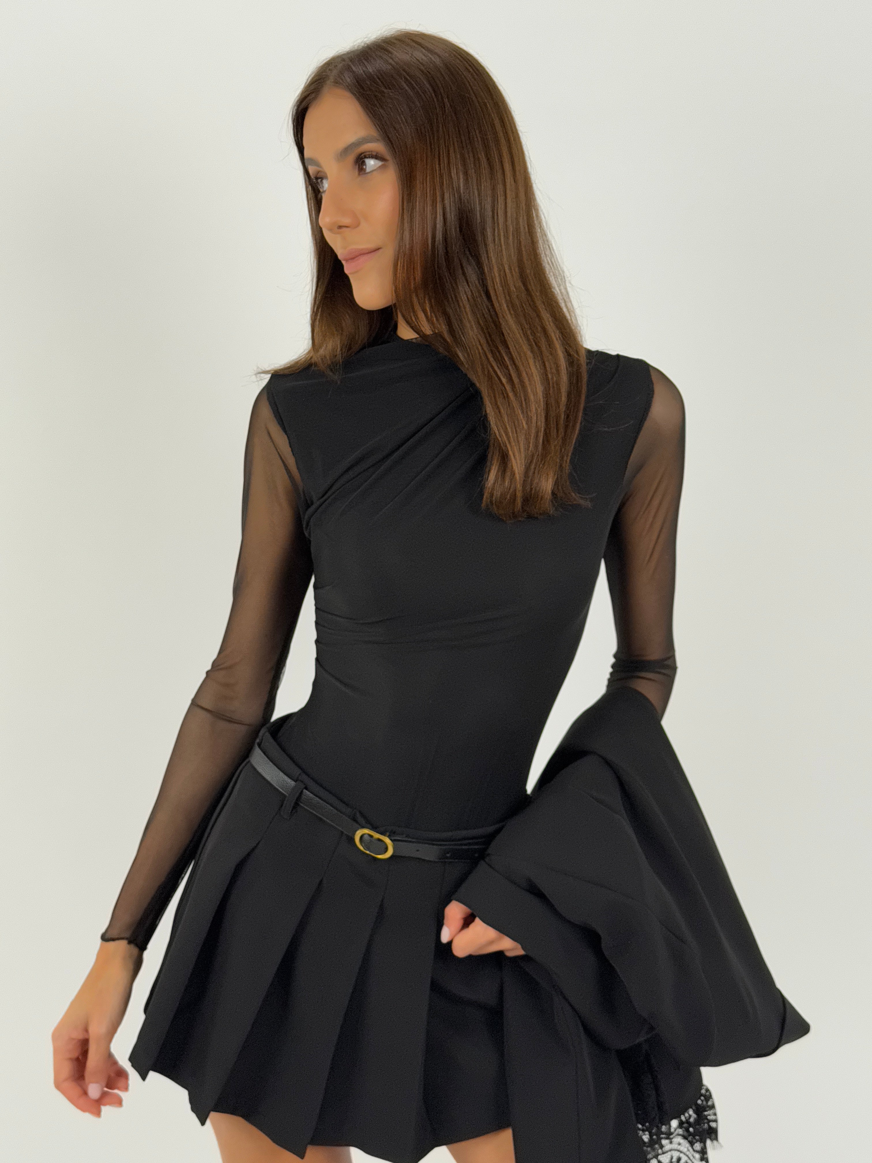 Body nero a manica lunga con maniche in tulle semitrasparente