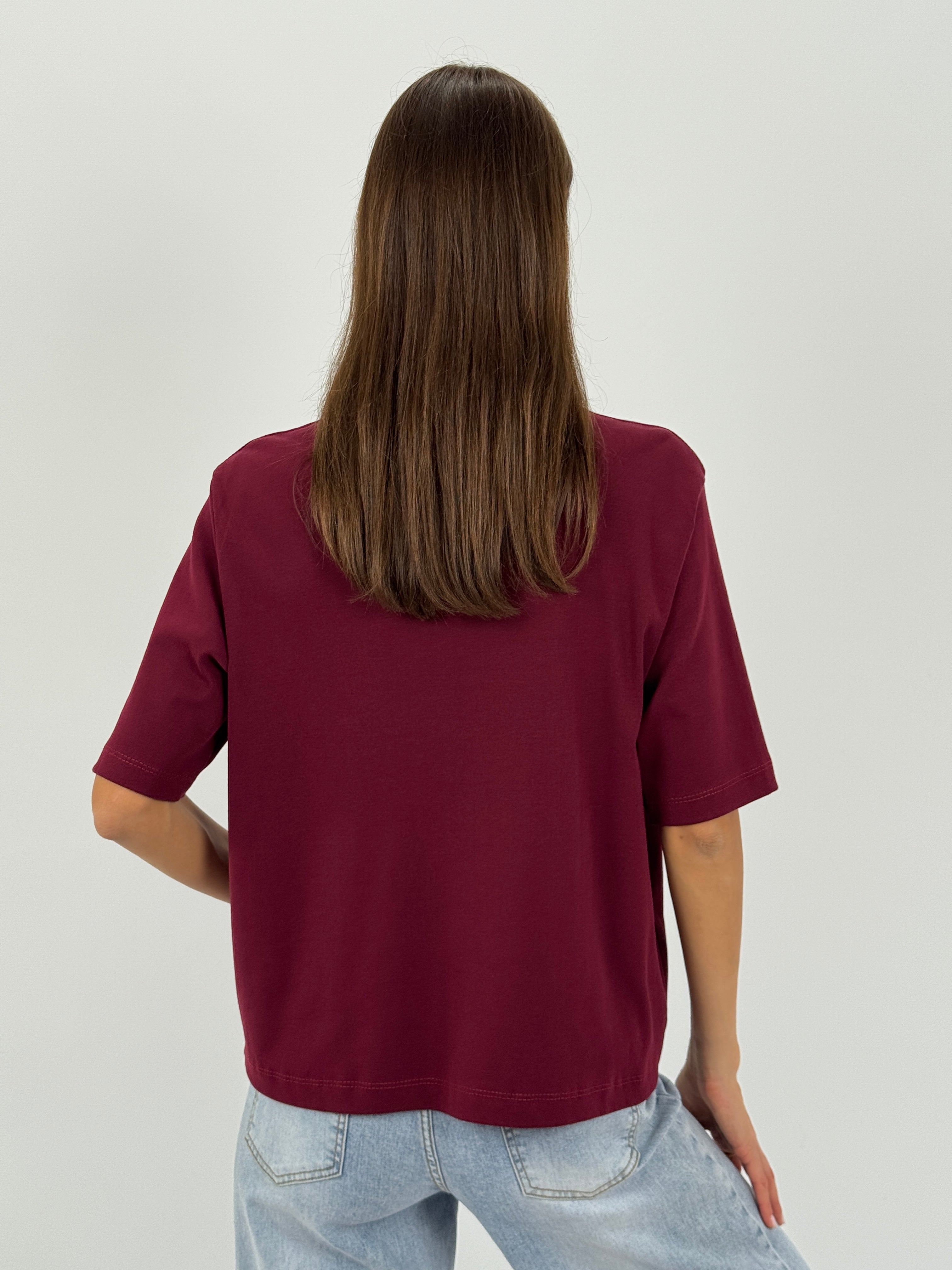 Maglietta bordeaux in cotone con maniche corte ampie e colletto alto.