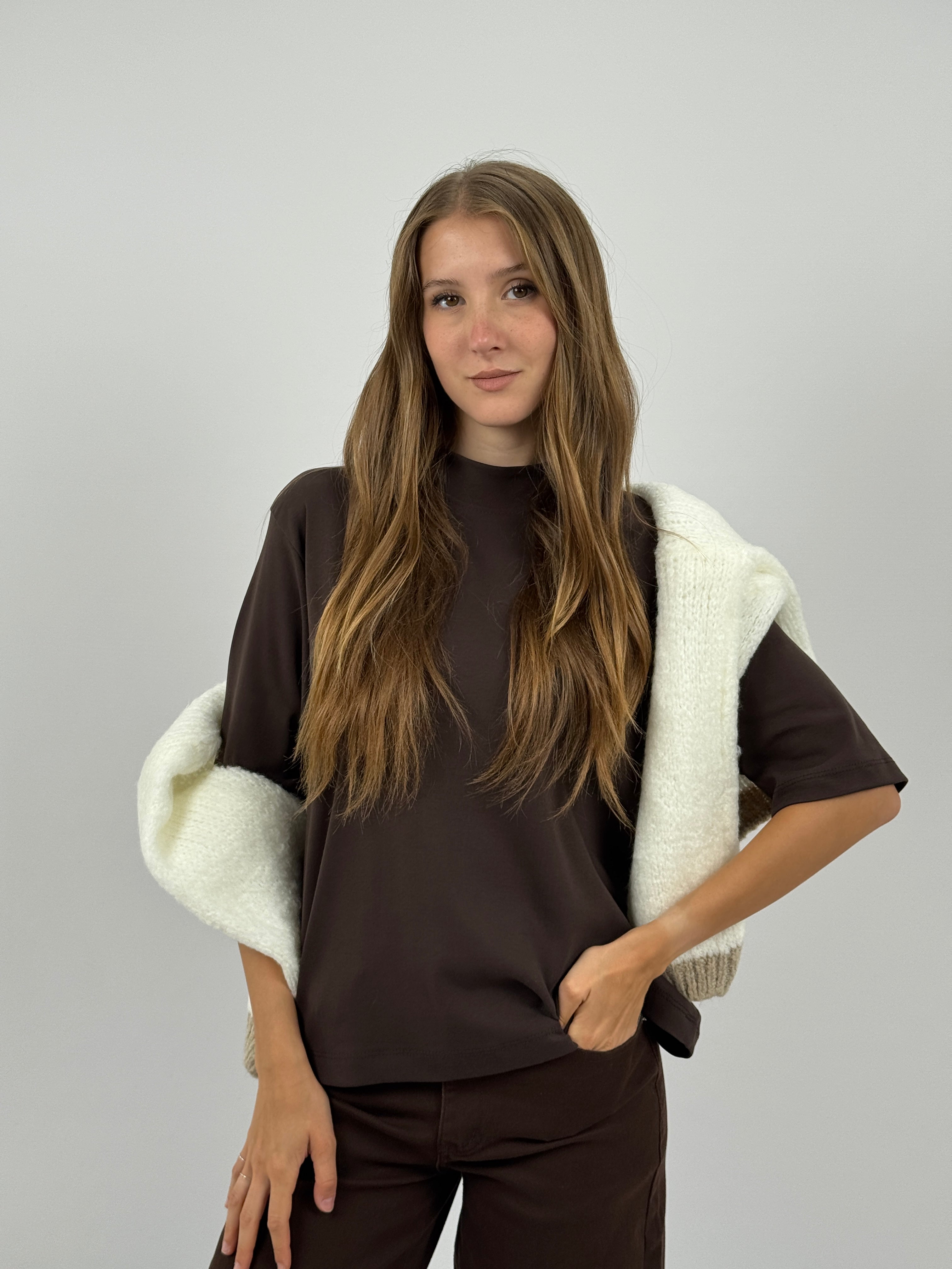 Maglietta marrone in cotone con maniche corte ampie e colletto alto.