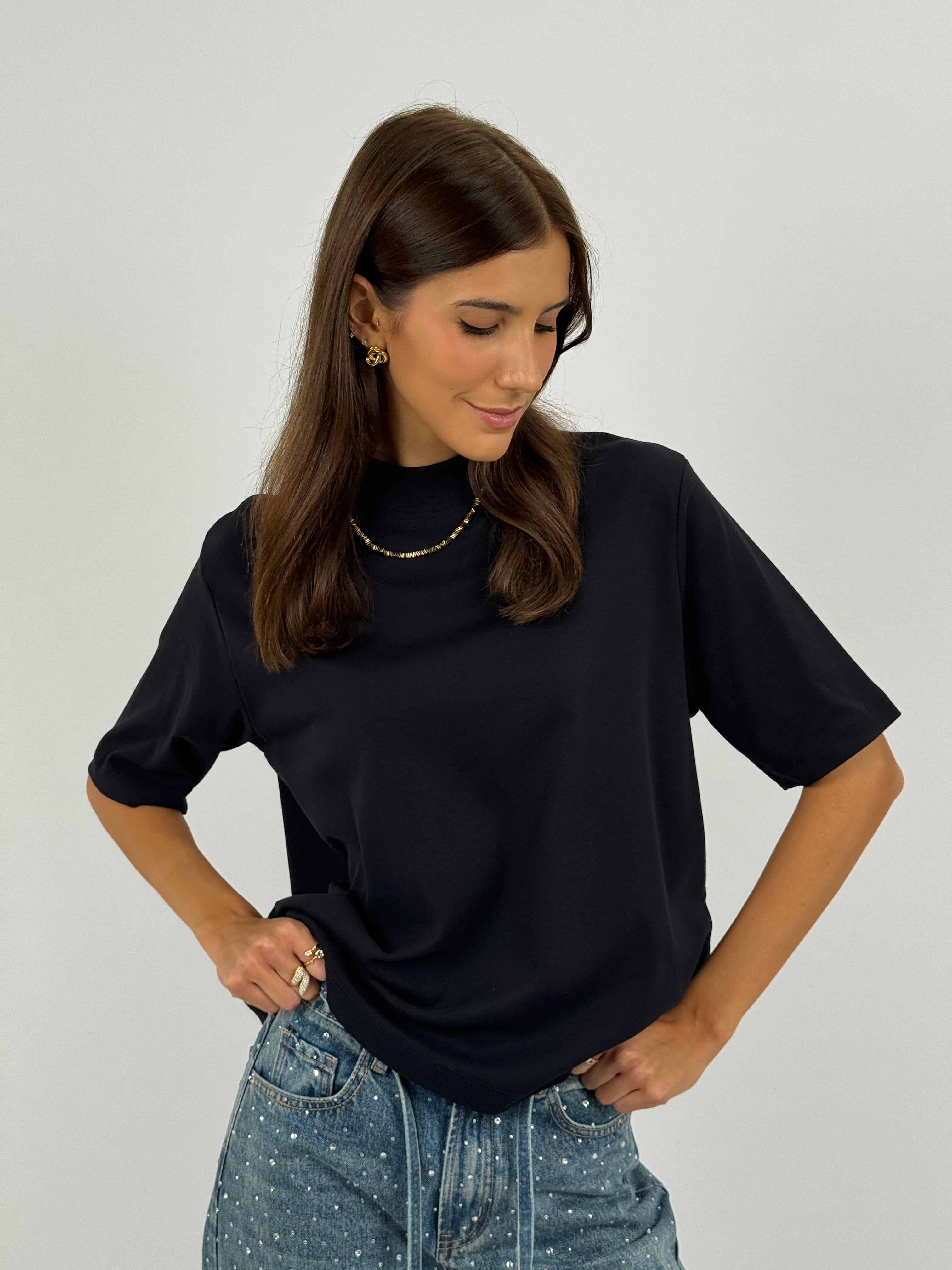 Maglietta nera in cotone con maniche corte ampie e colletto alto.