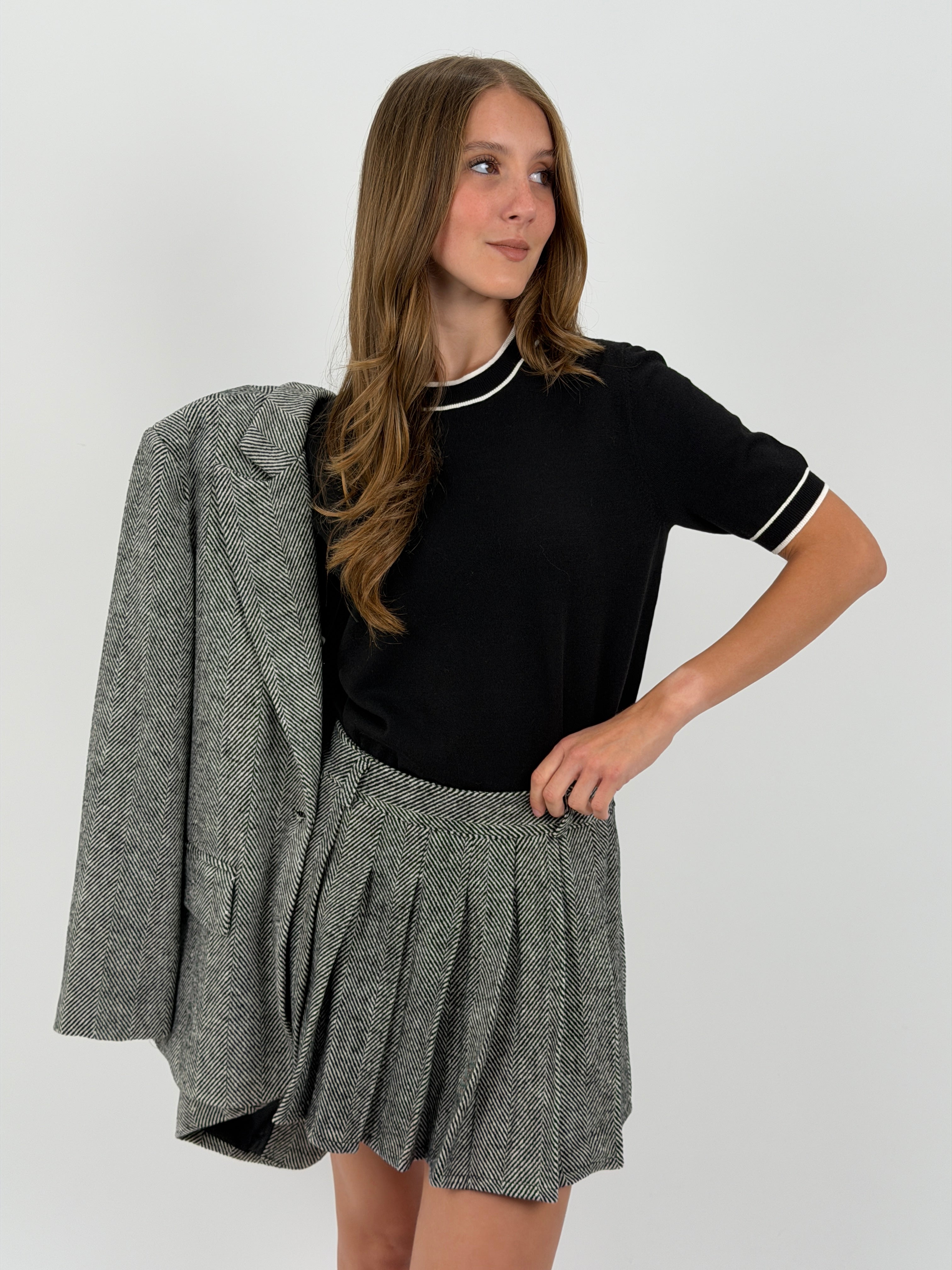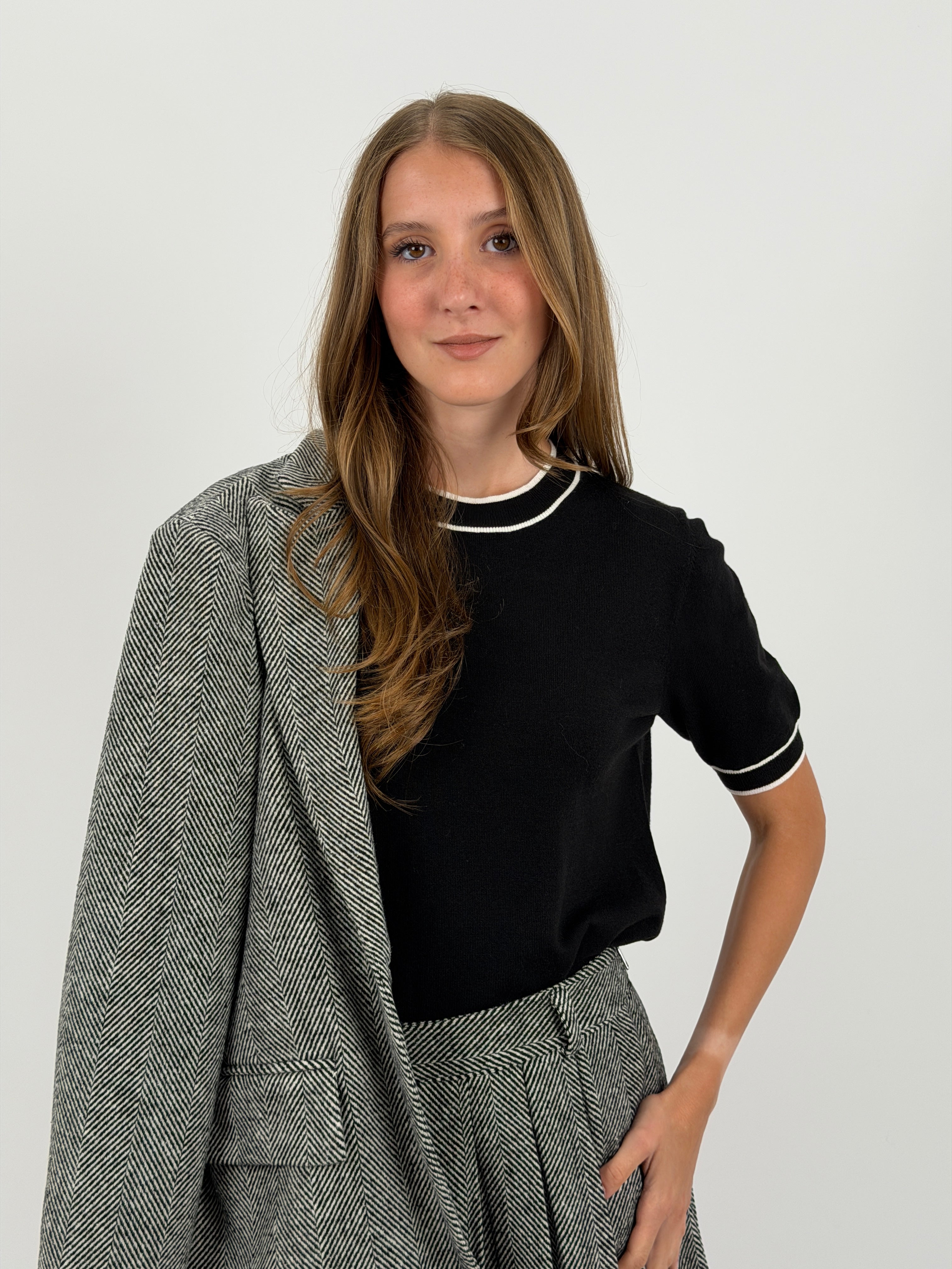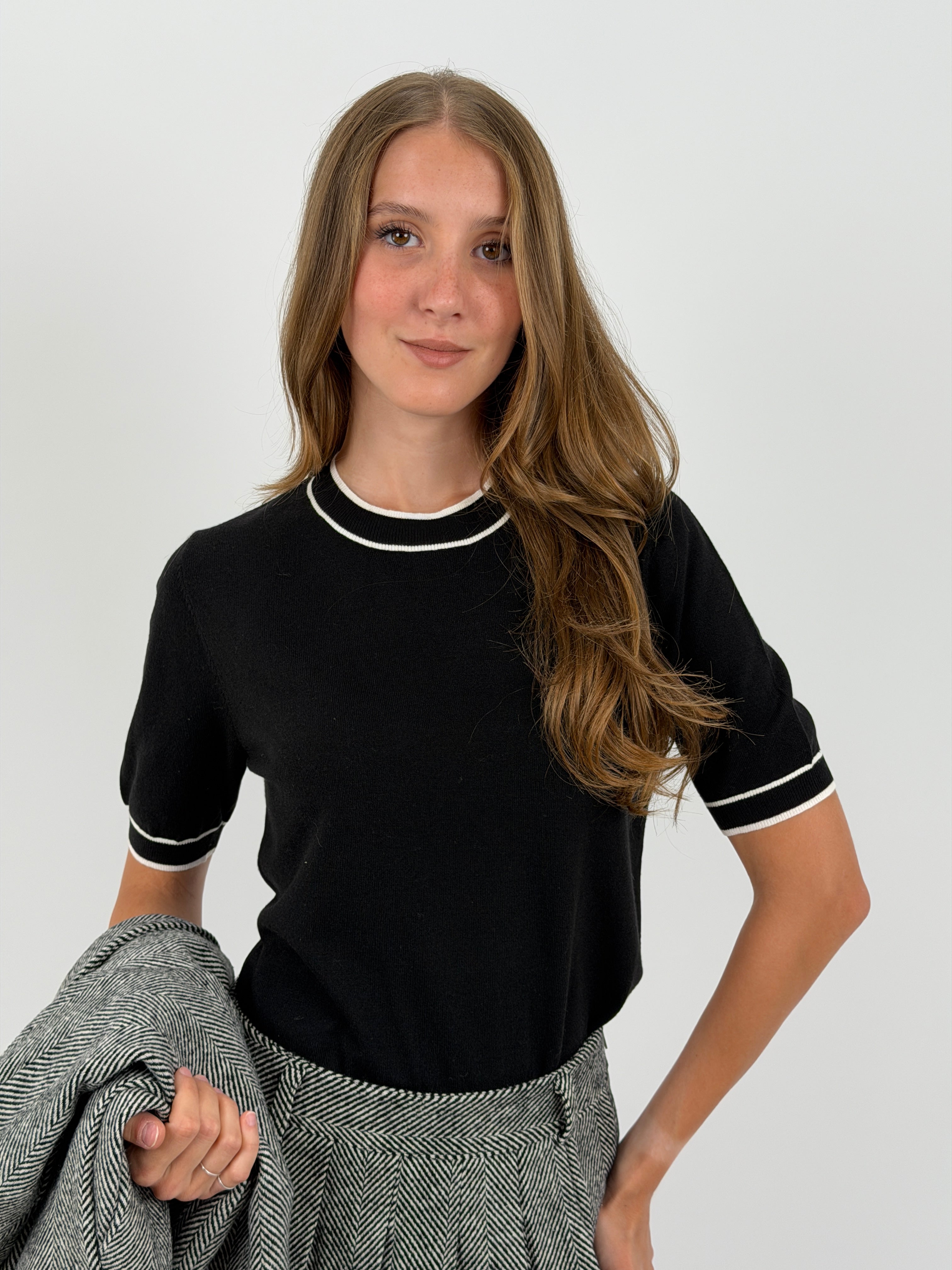 Maglia nera a maniche corte in maglia filata, con bordi a contrasto su collo, fondo e maniche. Rifinita a costine.