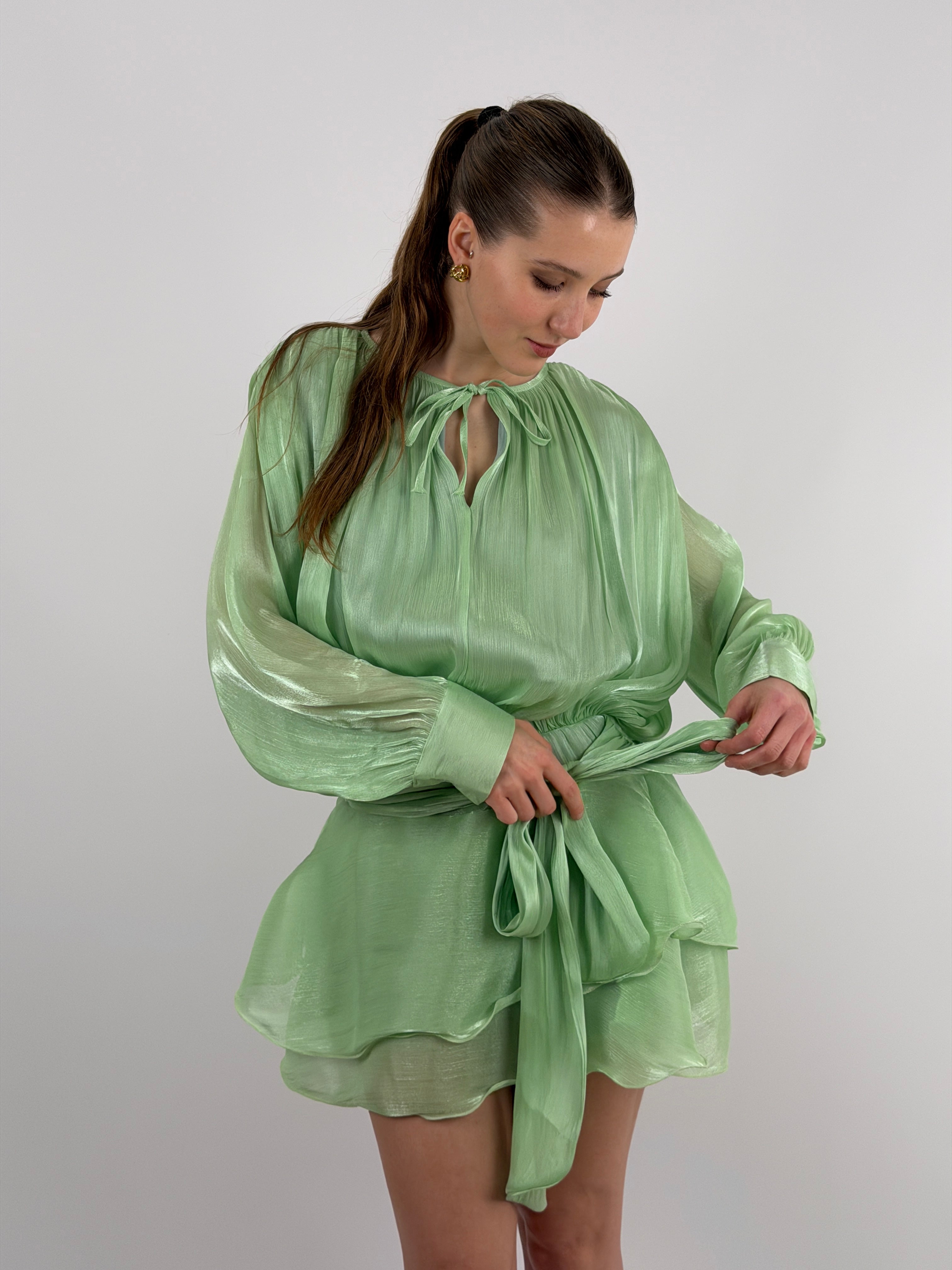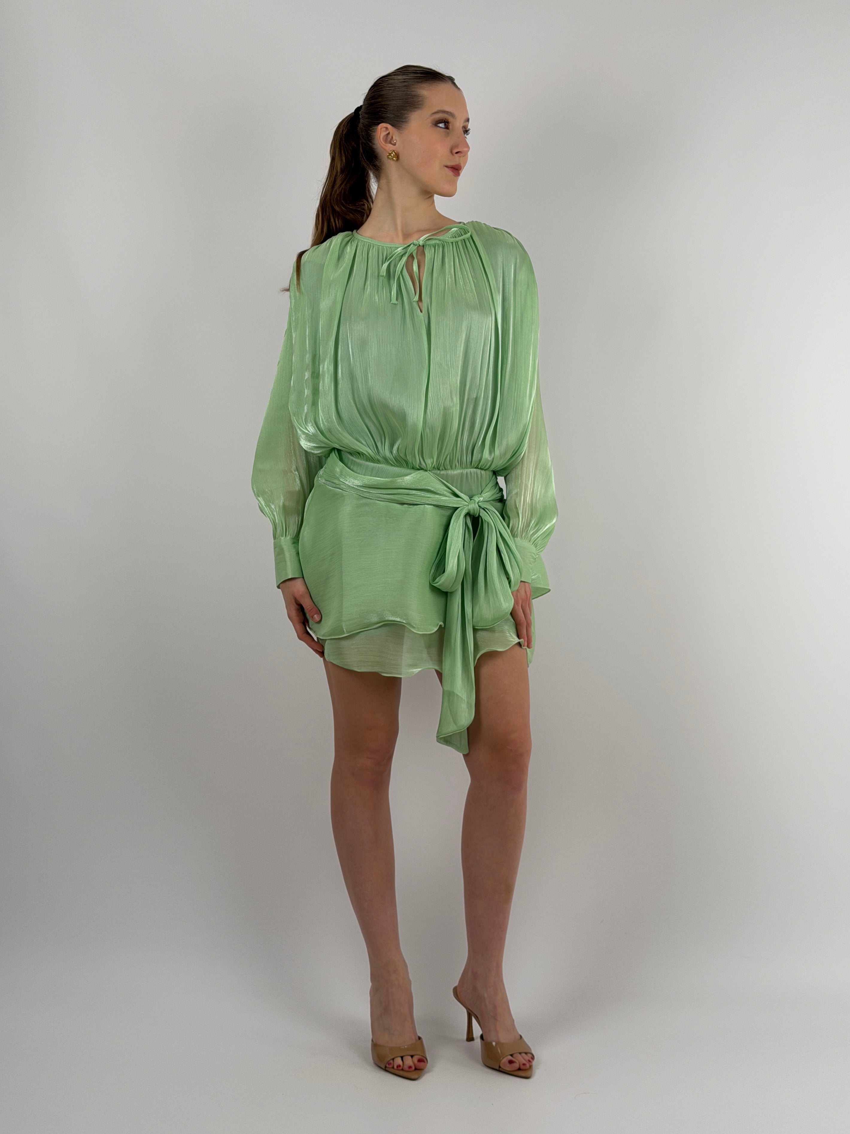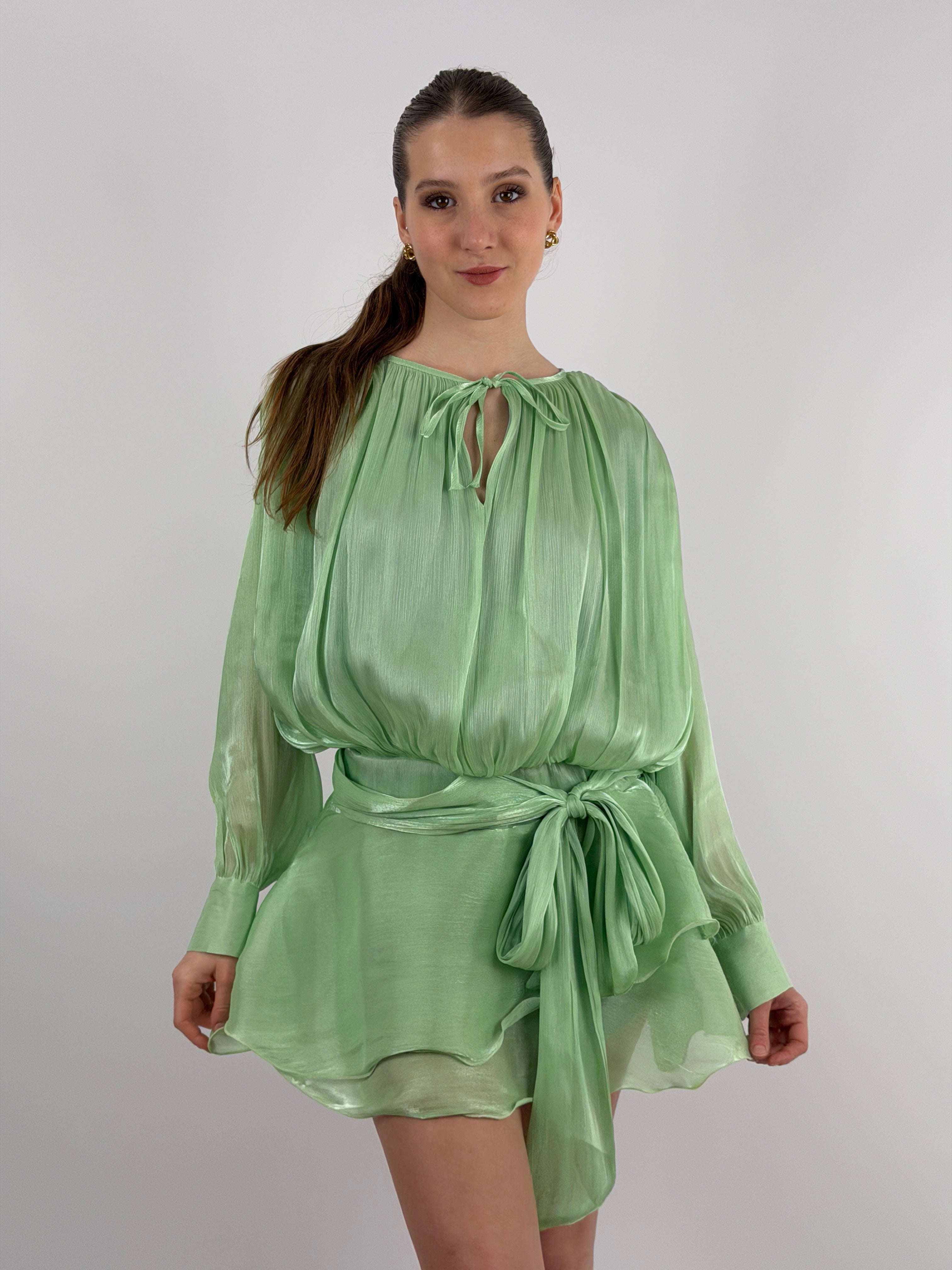 Abito corto in raso verde con tessuto brillante, a maniche lunghe e girocollo con fiocco, elastico in vita con fusciacca e polsini con bottoni