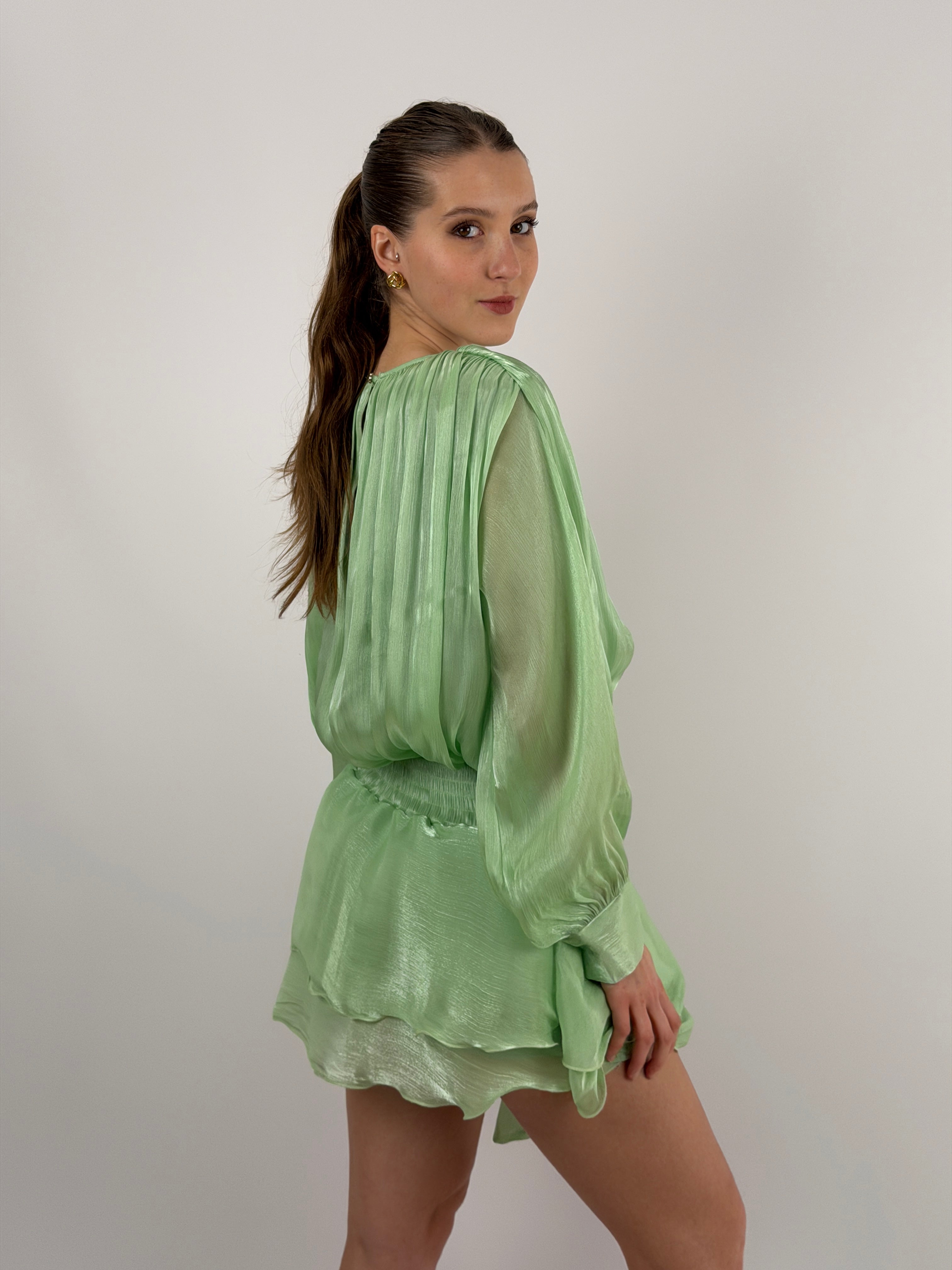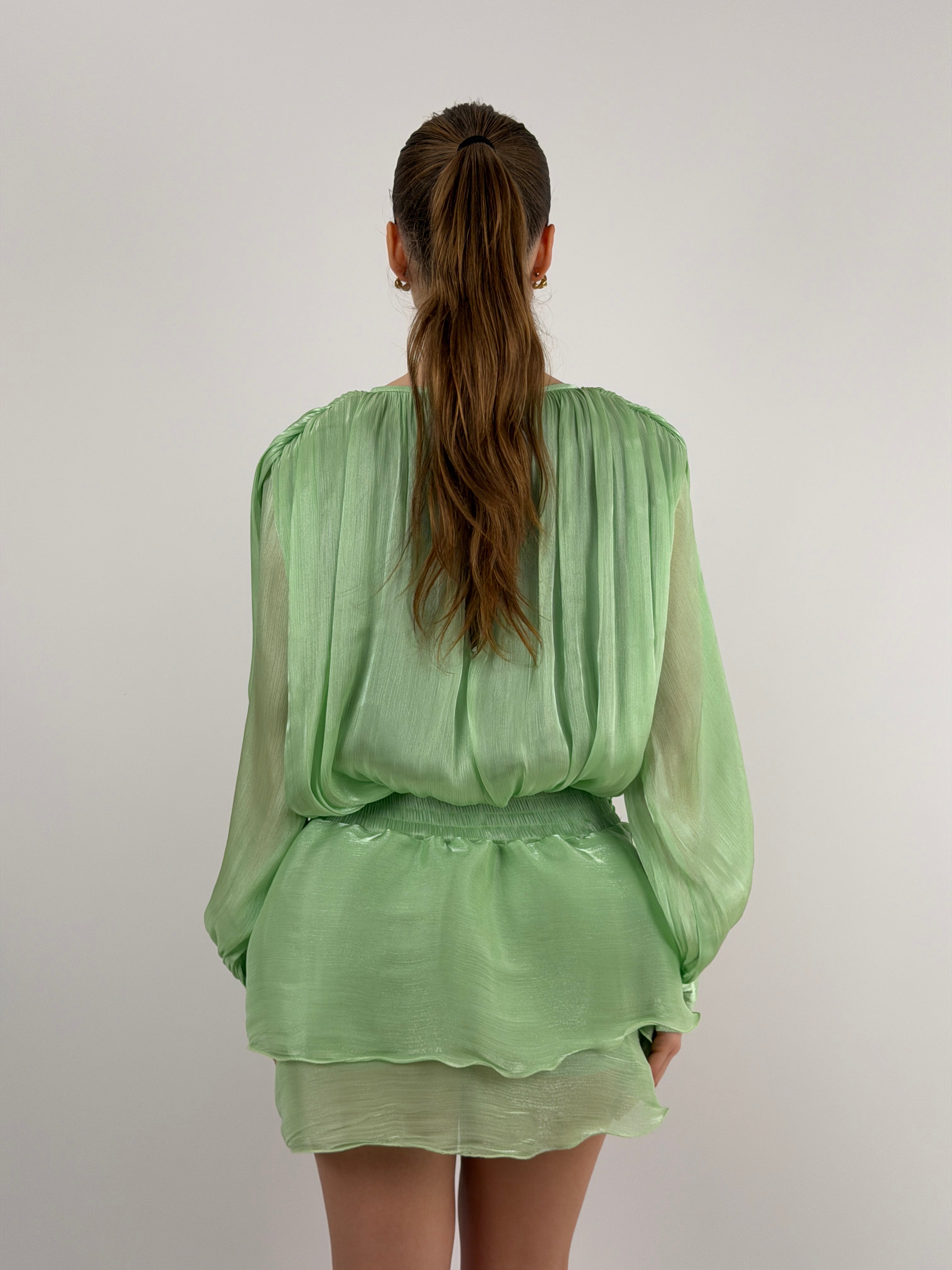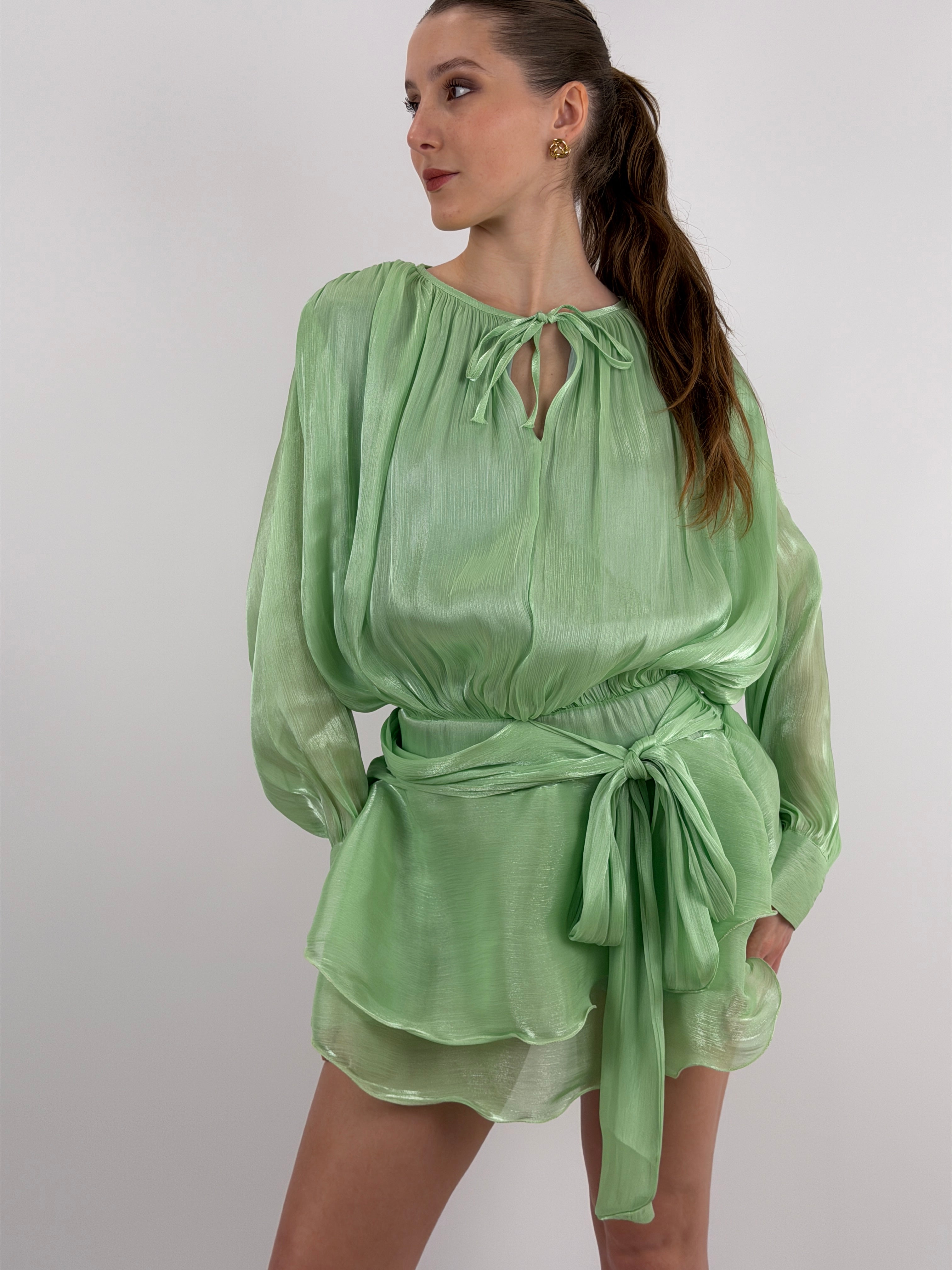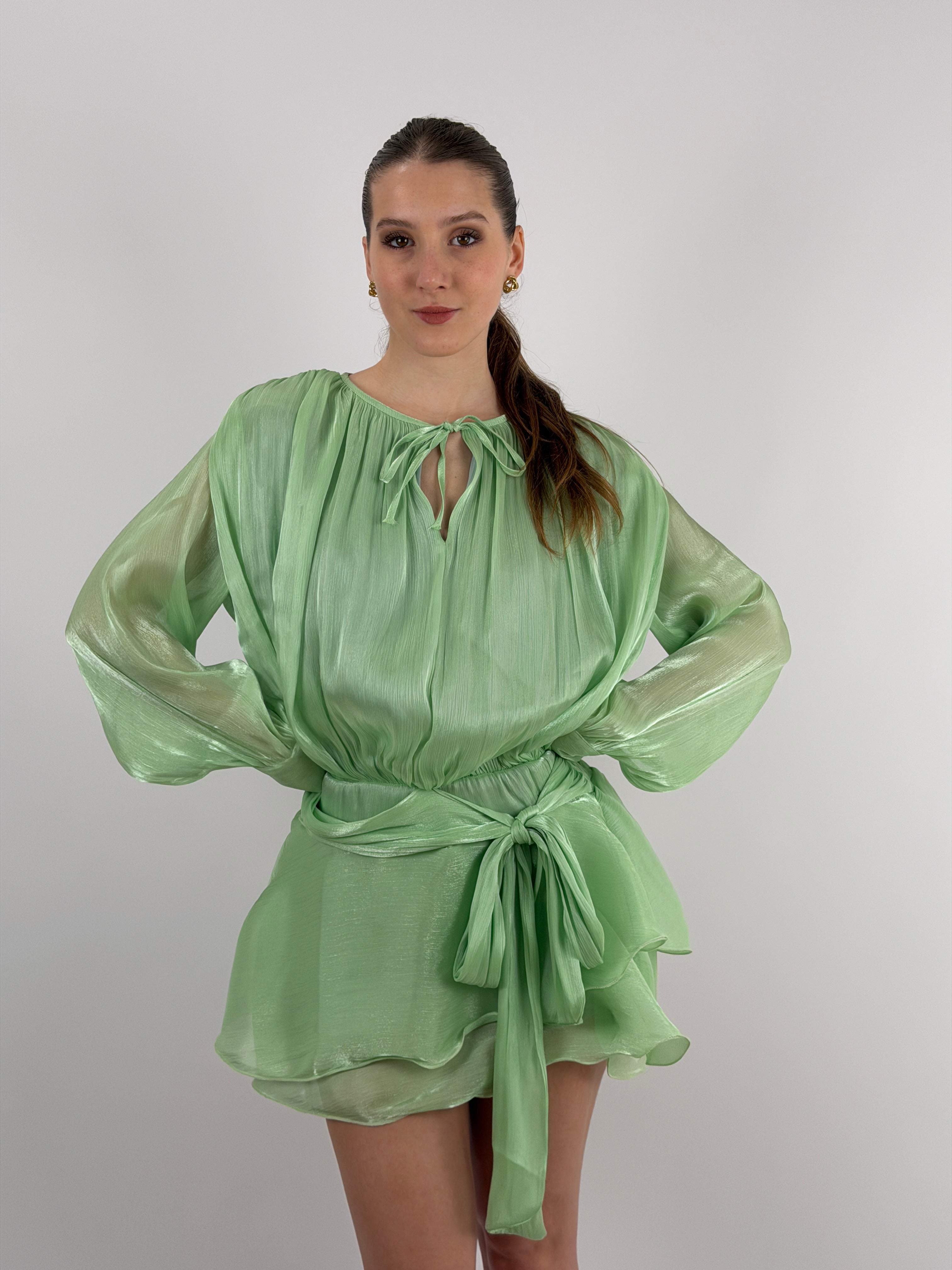 Abito corto in raso verde con tessuto brillante, a maniche lunghe e girocollo con fiocco, elastico in vita con fusciacca e polsini con bottoni