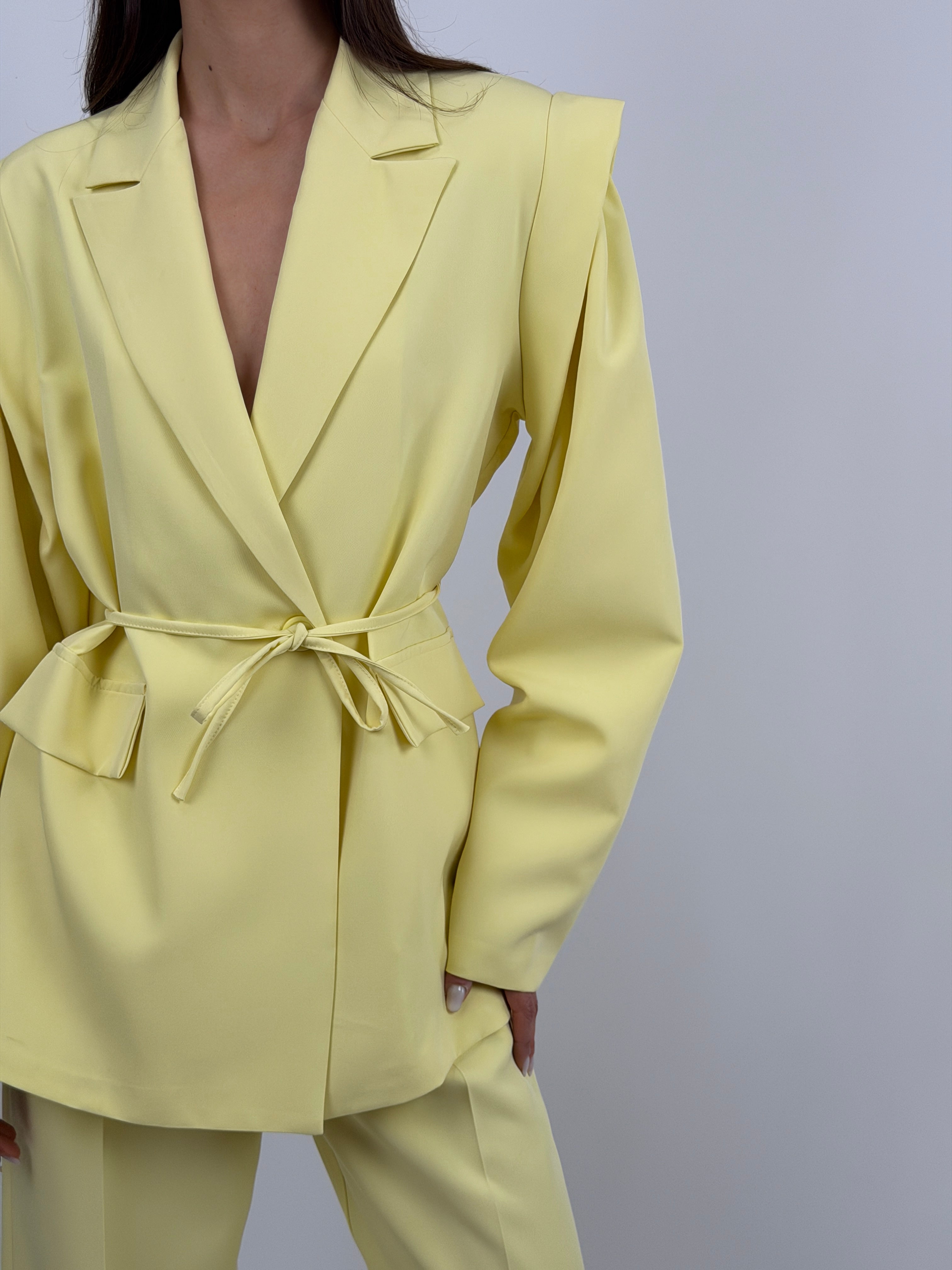 Giacca gialla con revers a lancia, spalle strutturate, maniche ampie e cinturina in vita. Fodera intera