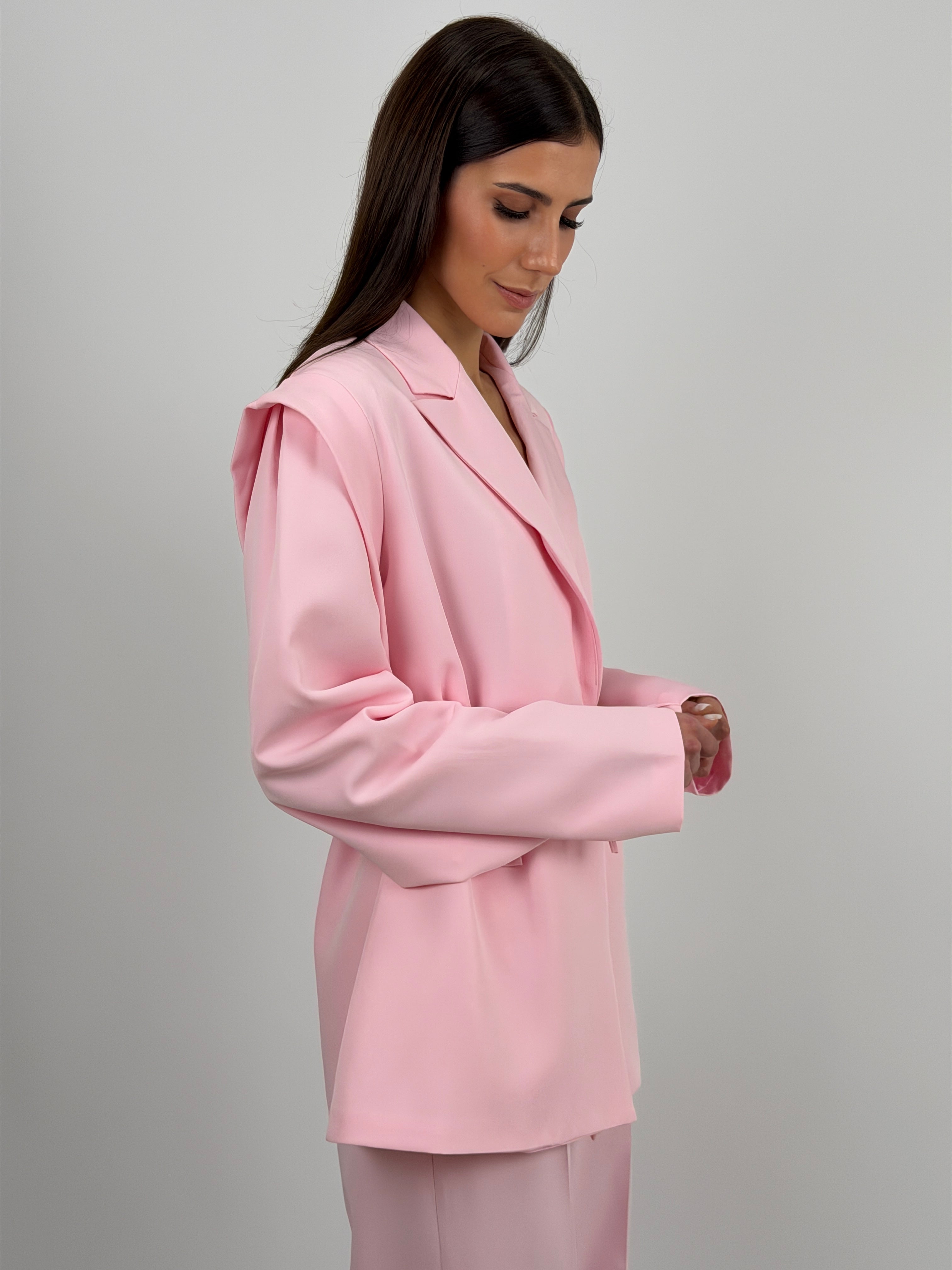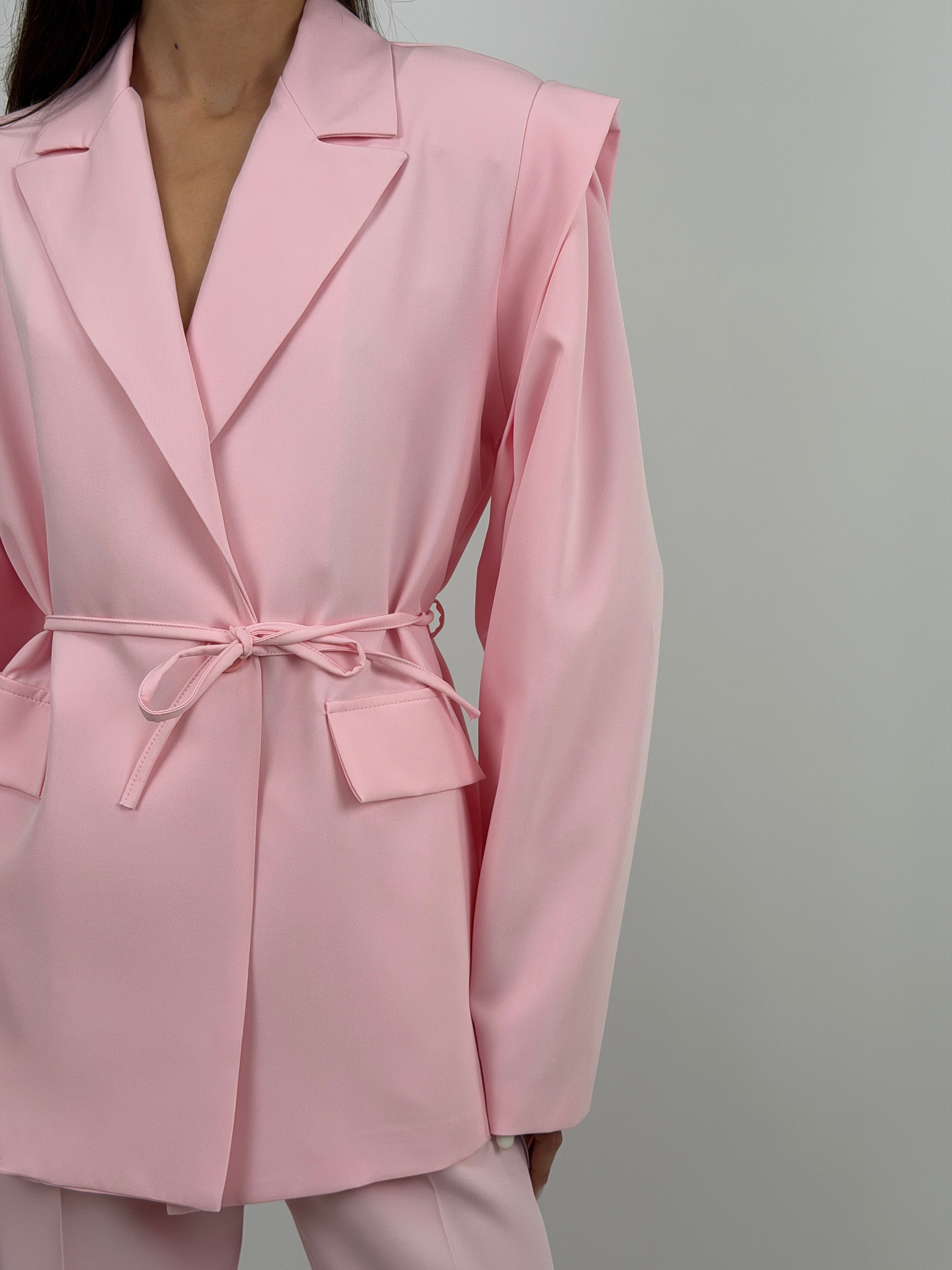 Giacca rosa con revers a lancia, spalle strutturate, maniche ampie e cinturina in vita. Fodera intera