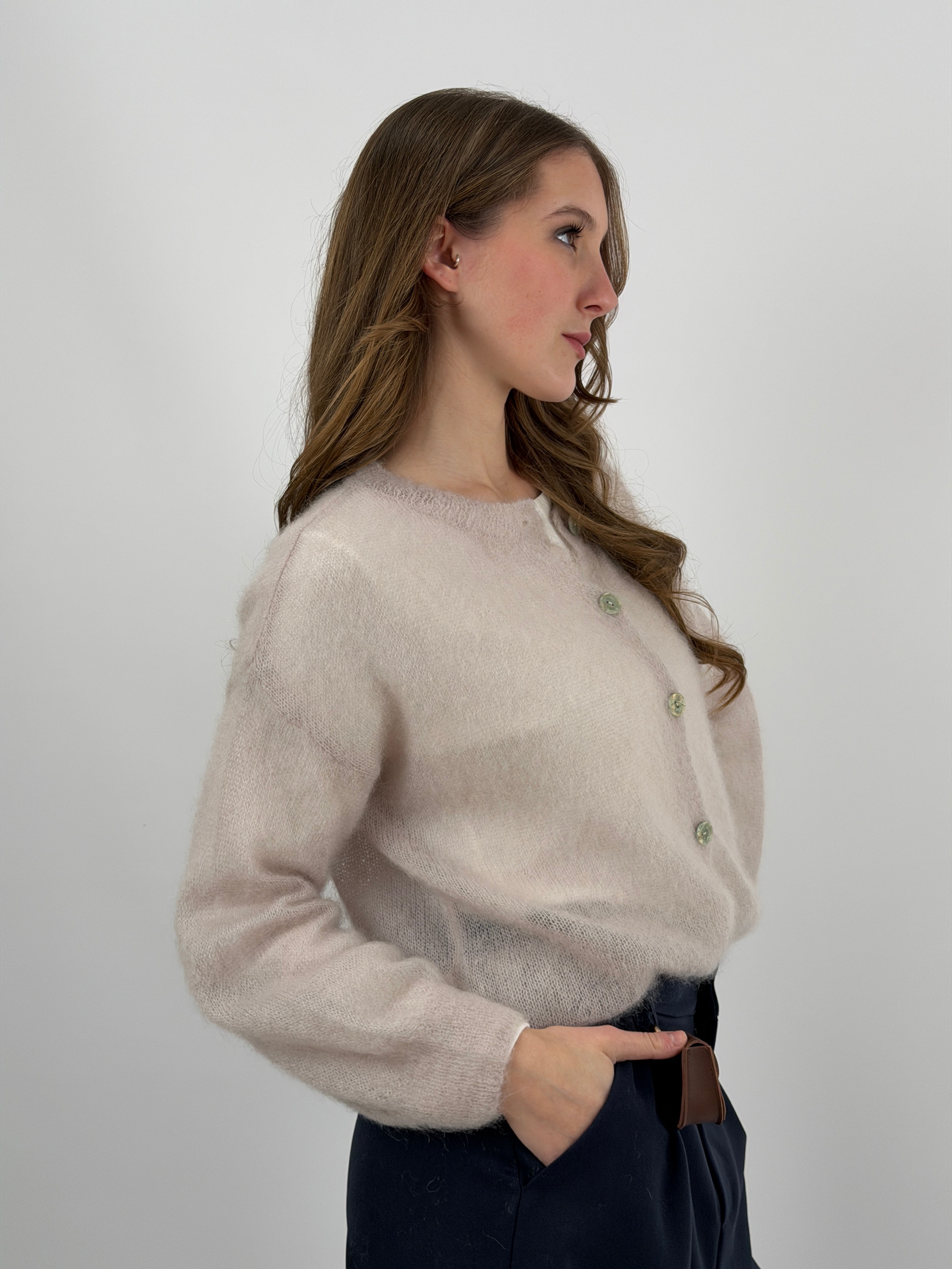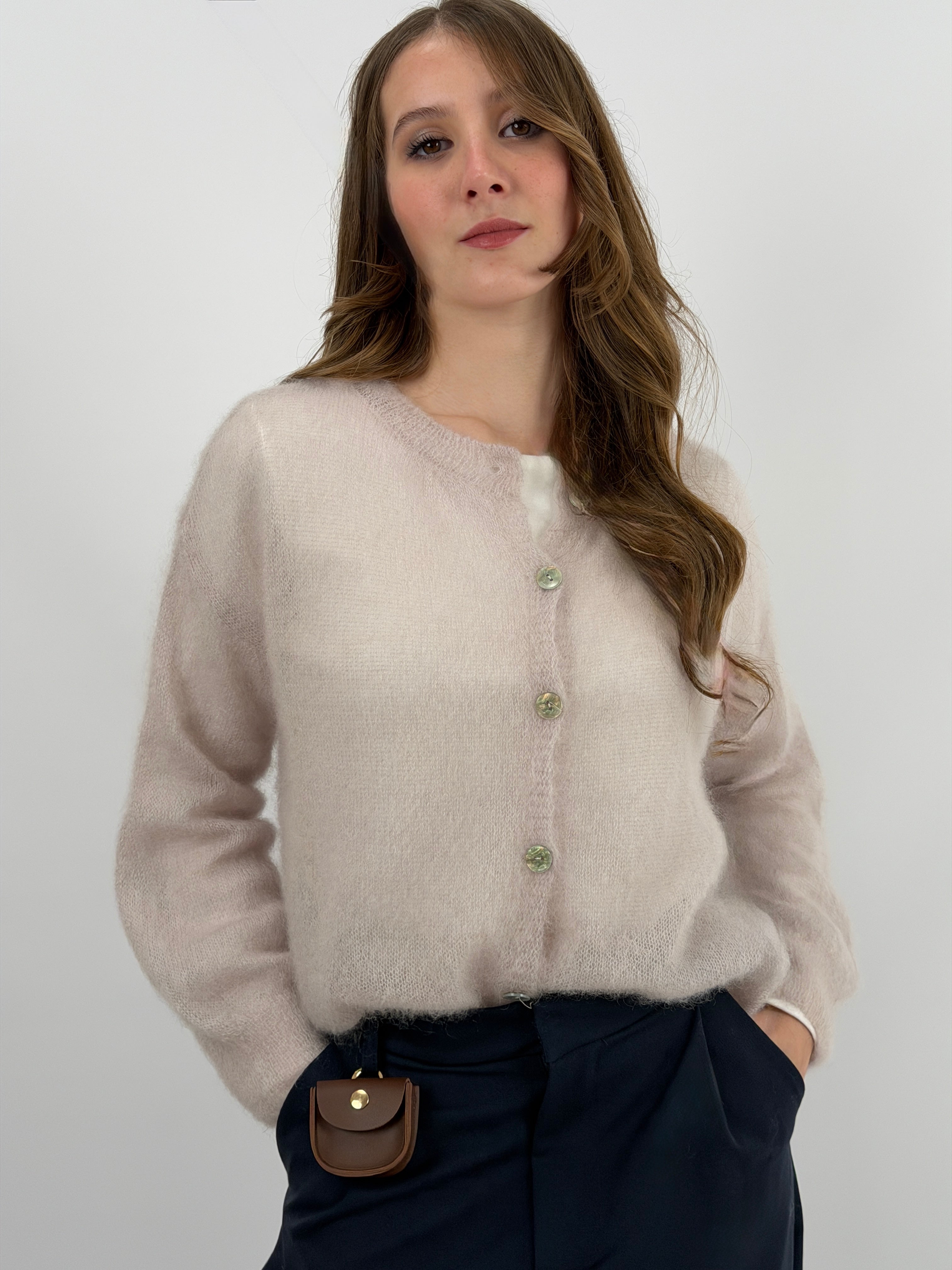 Cardigan cipria girocollo con bottoni. In kid mohair ultra leggero e morbido, non punge sulla pelle