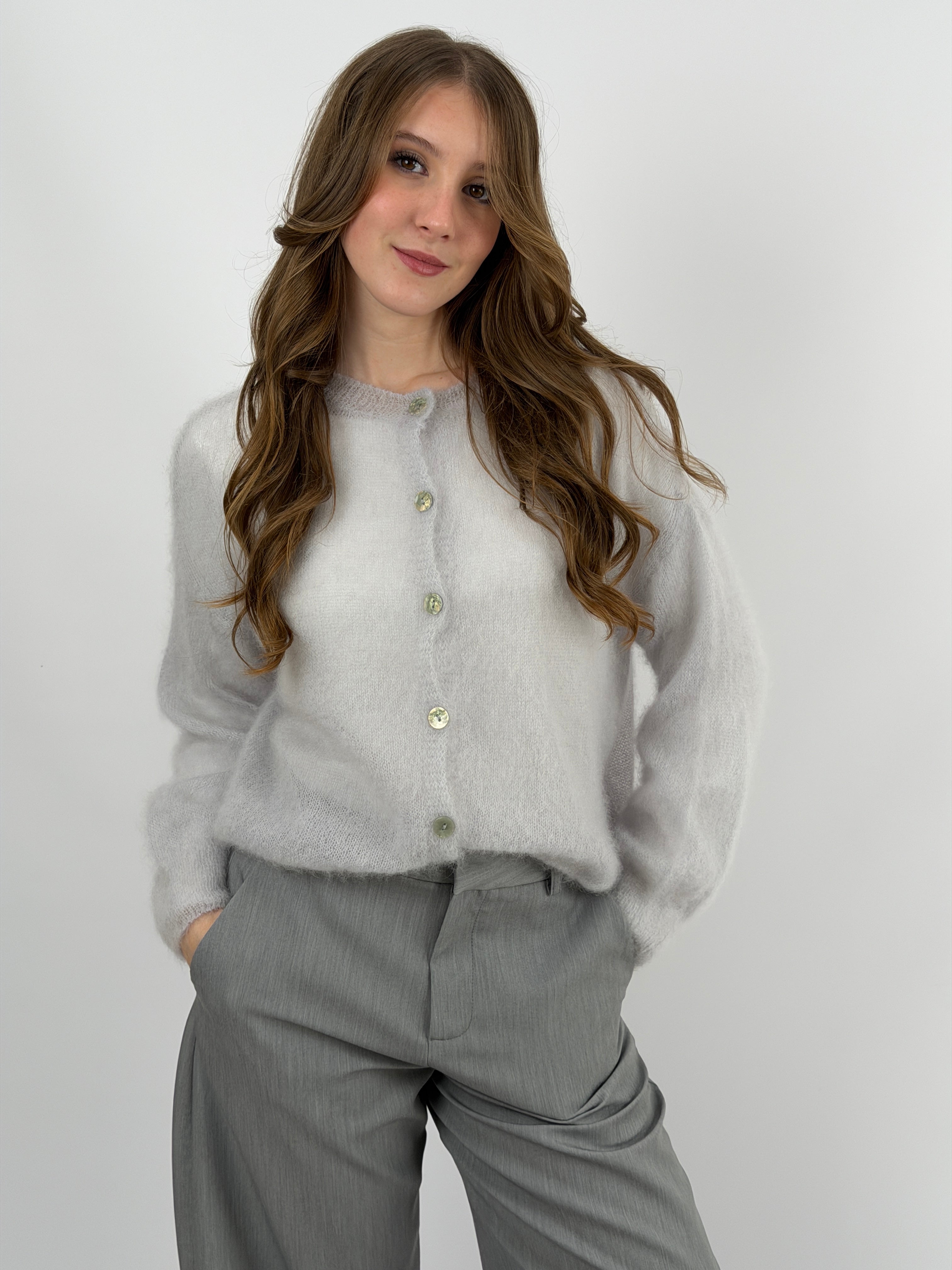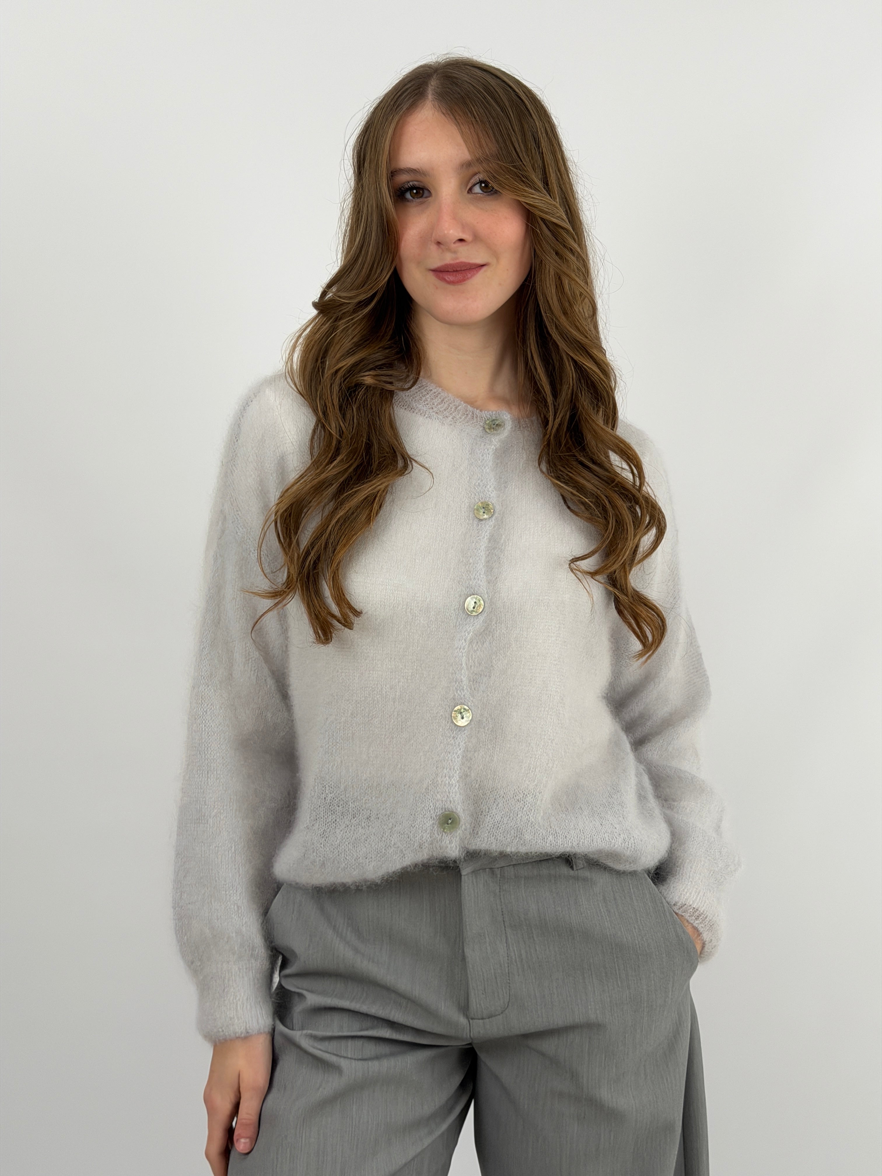 Cardigan grigio perla girocollo con bottoni. In kid mohair ultra leggero e morbido, non punge sulla pelle