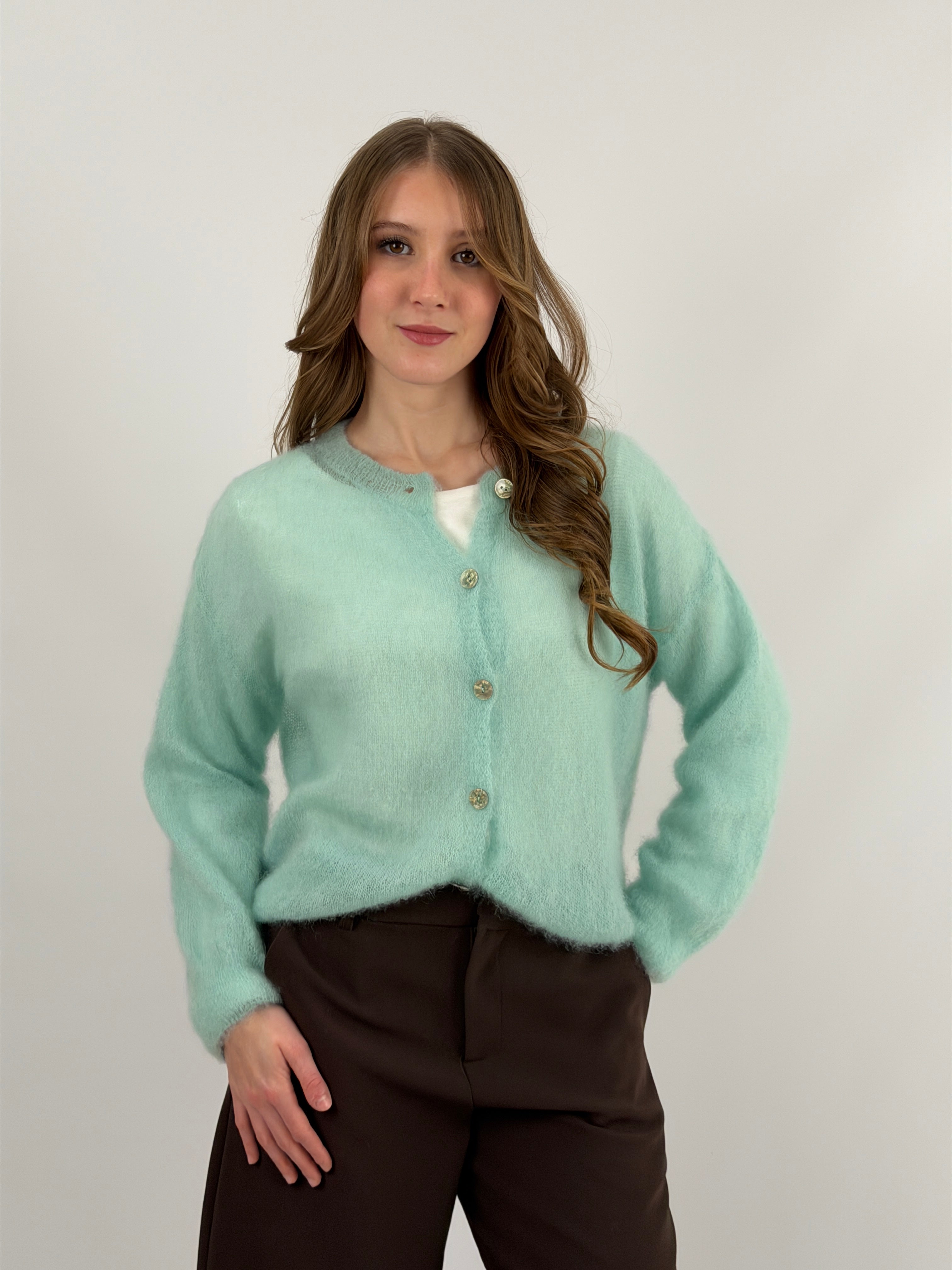Cardigan verde acqua girocollo con bottoni. In kid mohair ultra leggero e morbido, non punge sulla pelle