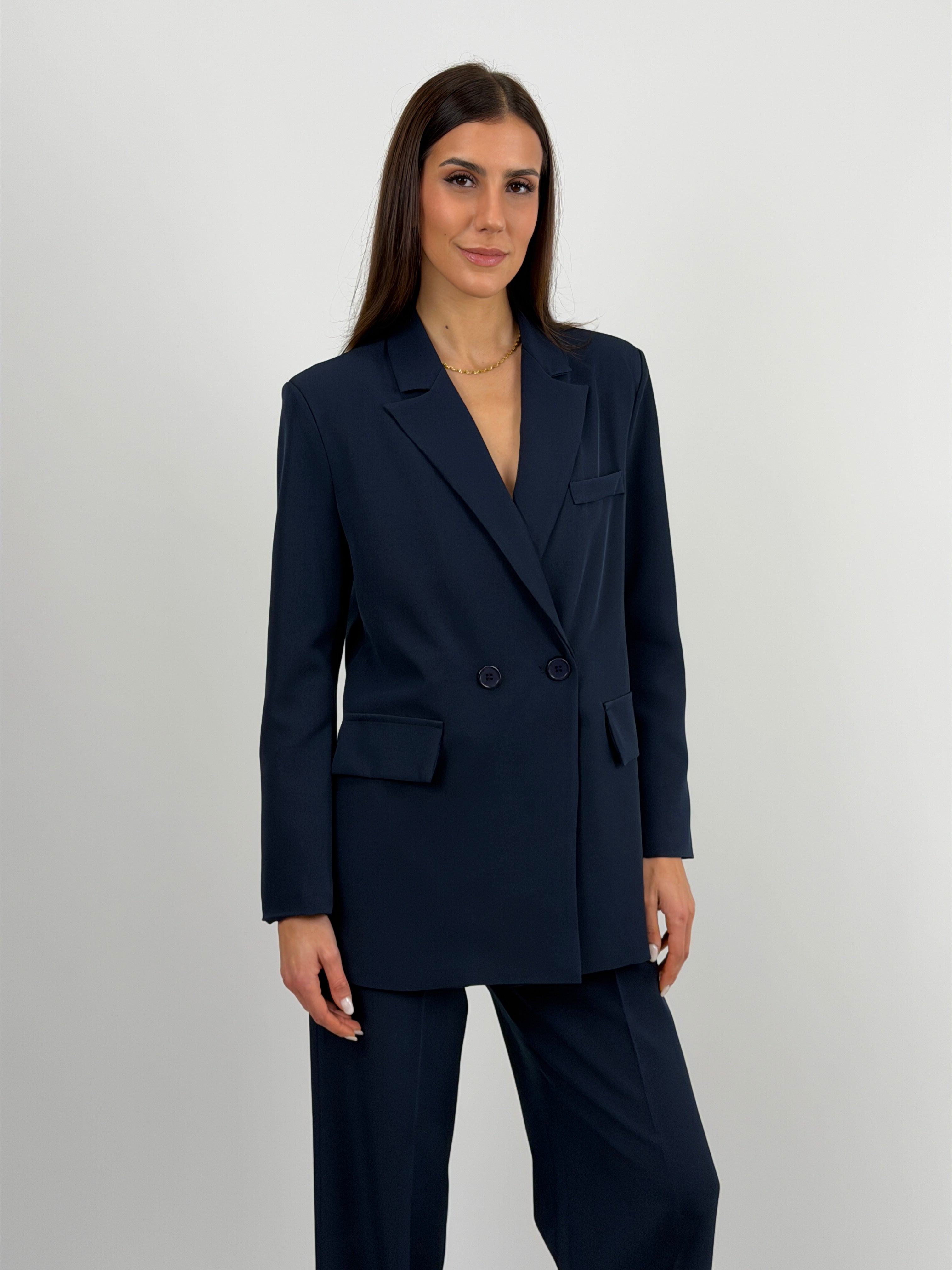 Completo blu composto da giacca e pantalone. Giacca doppiopetto con bottoni e revers classico. Pantalone a palazzo con elastico sul retro, chiusura con zip e bottone, passanti per cintura e tasche laterali.