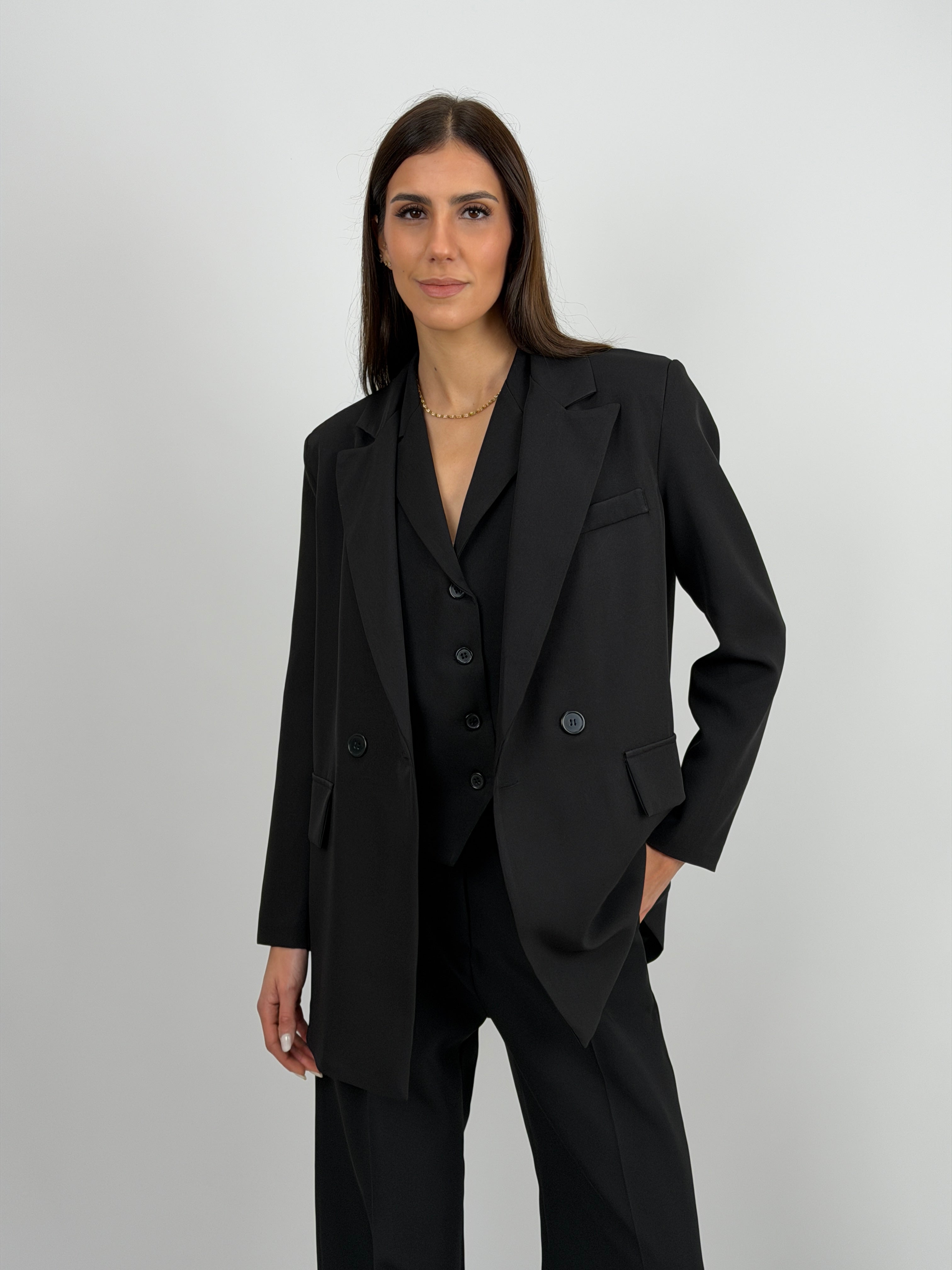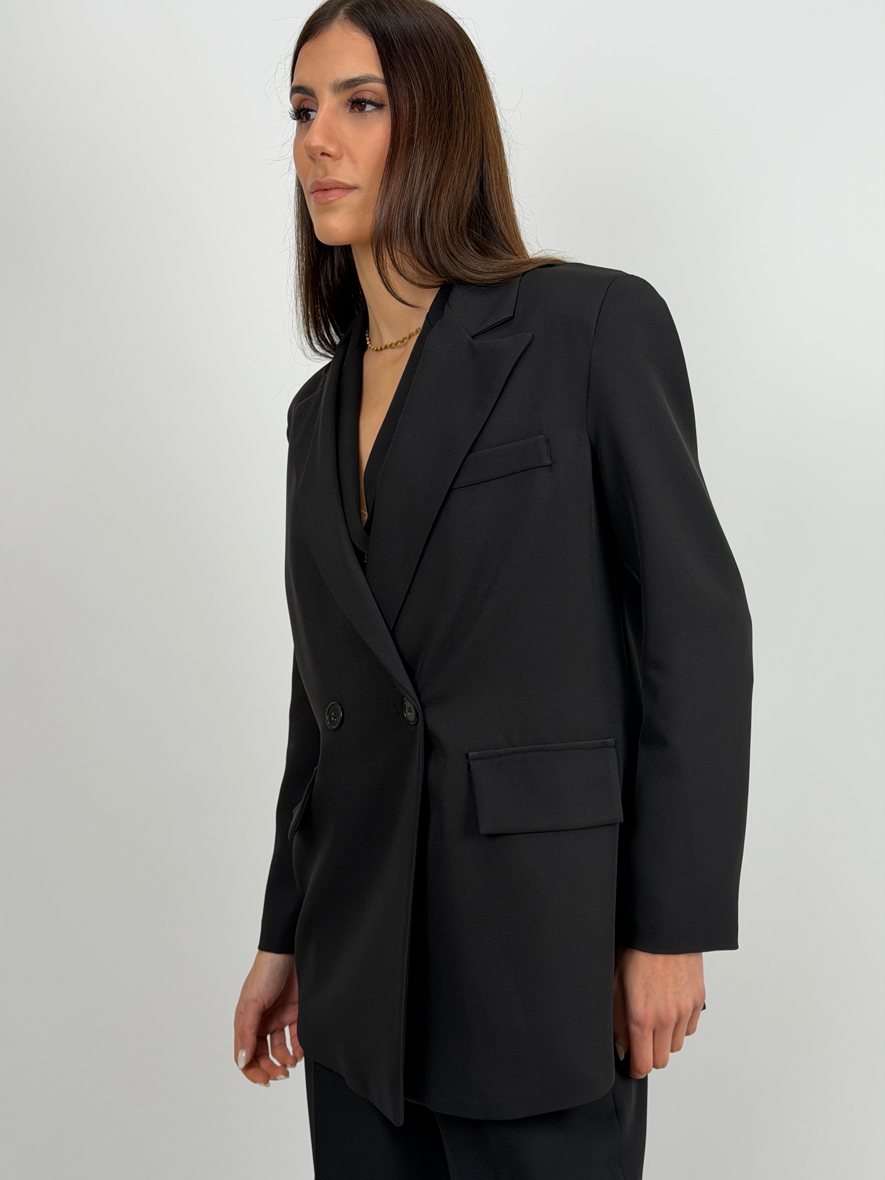 Completo nero composto da giacca e pantalone. Giacca doppiopetto con bottoni e revers classico. Pantalone a palazzo con elastico sul retro, chiusura con zip e bottone, passanti per cintura e tasche laterali.