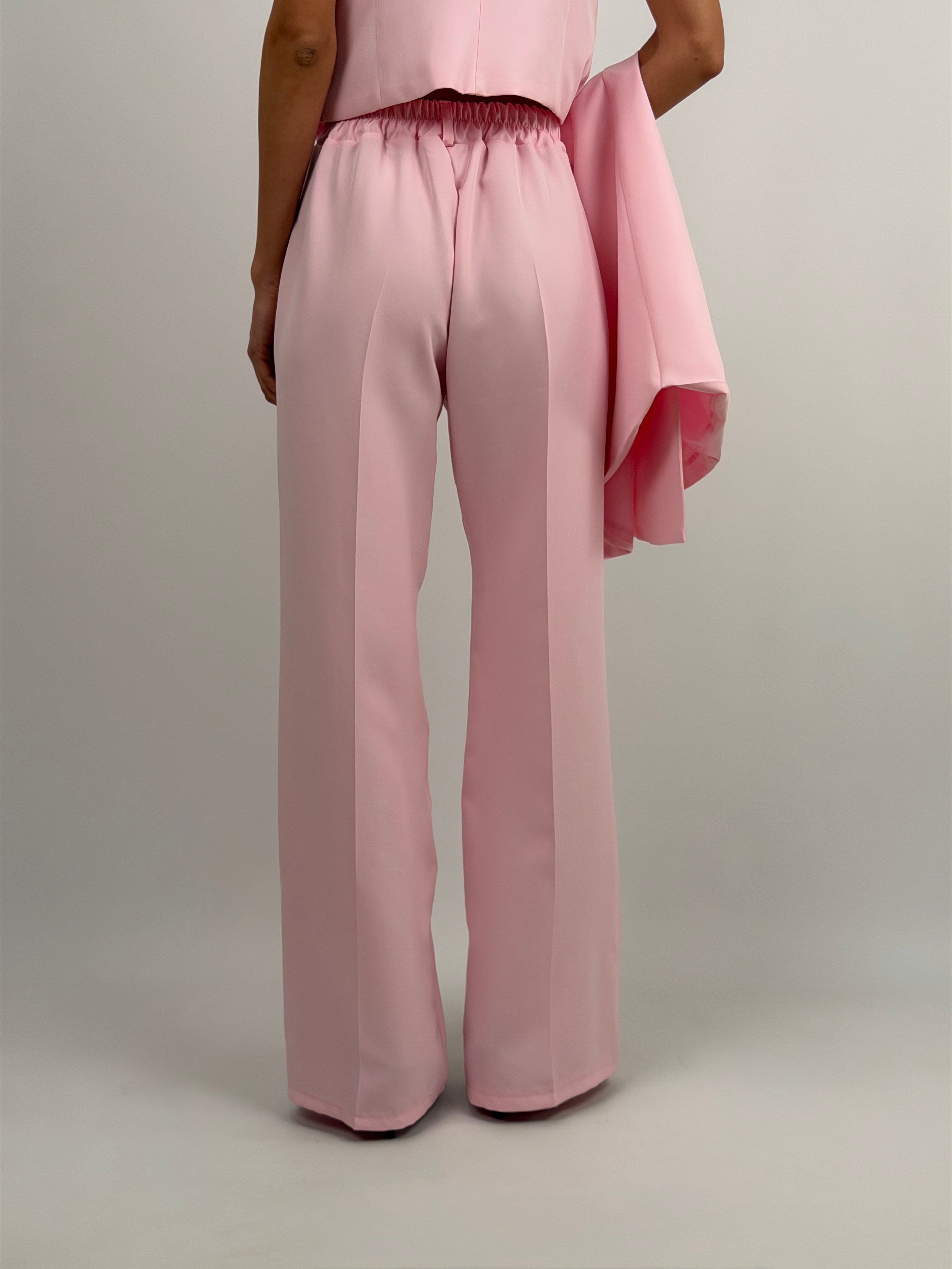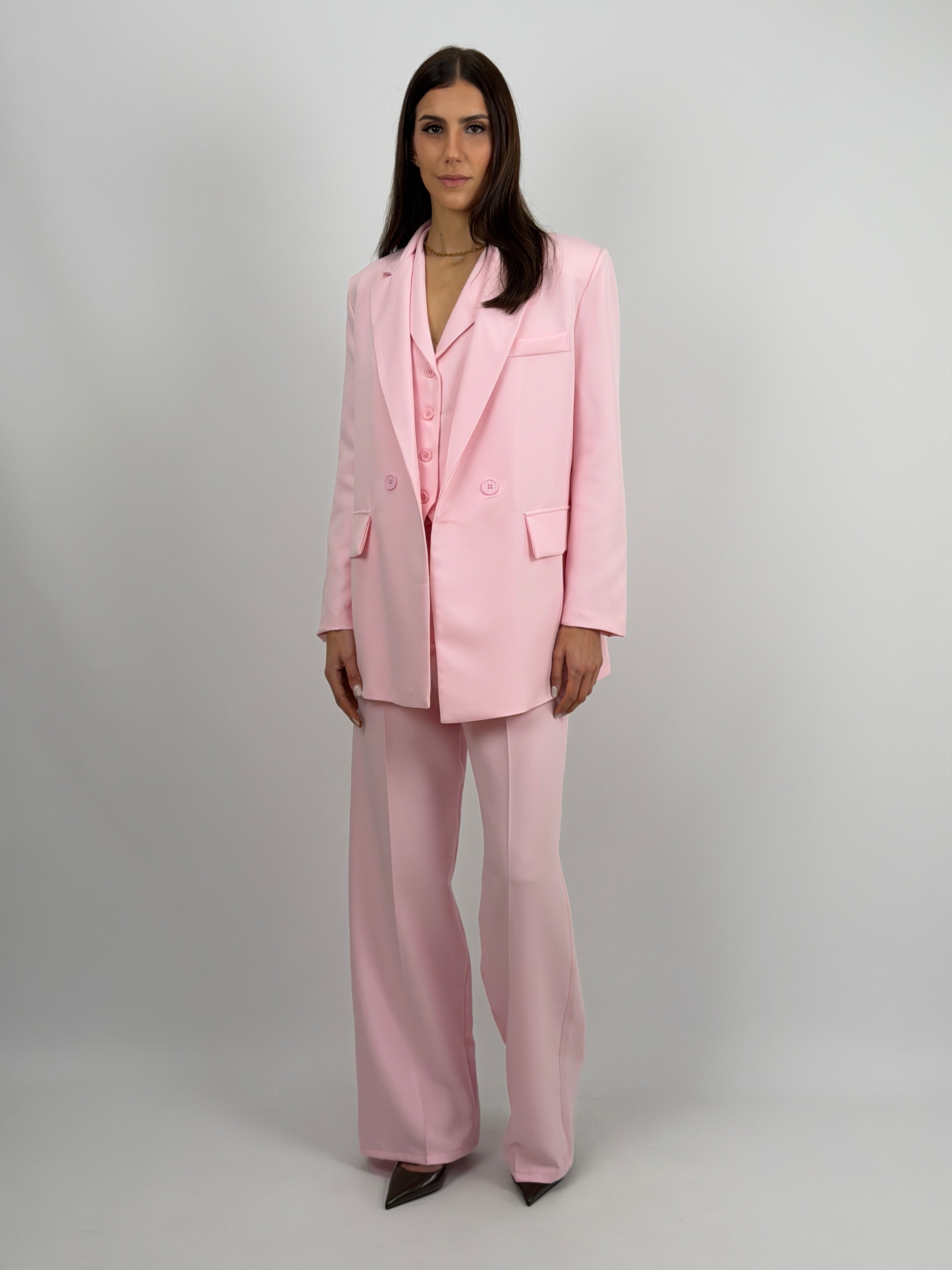 Completo rosa composto da giacca e pantalone. Giacca doppiopetto con bottoni e revers classico. Pantalone a palazzo con elastico sul retro, chiusura con zip e bottone, passanti per cintura e tasche laterali.