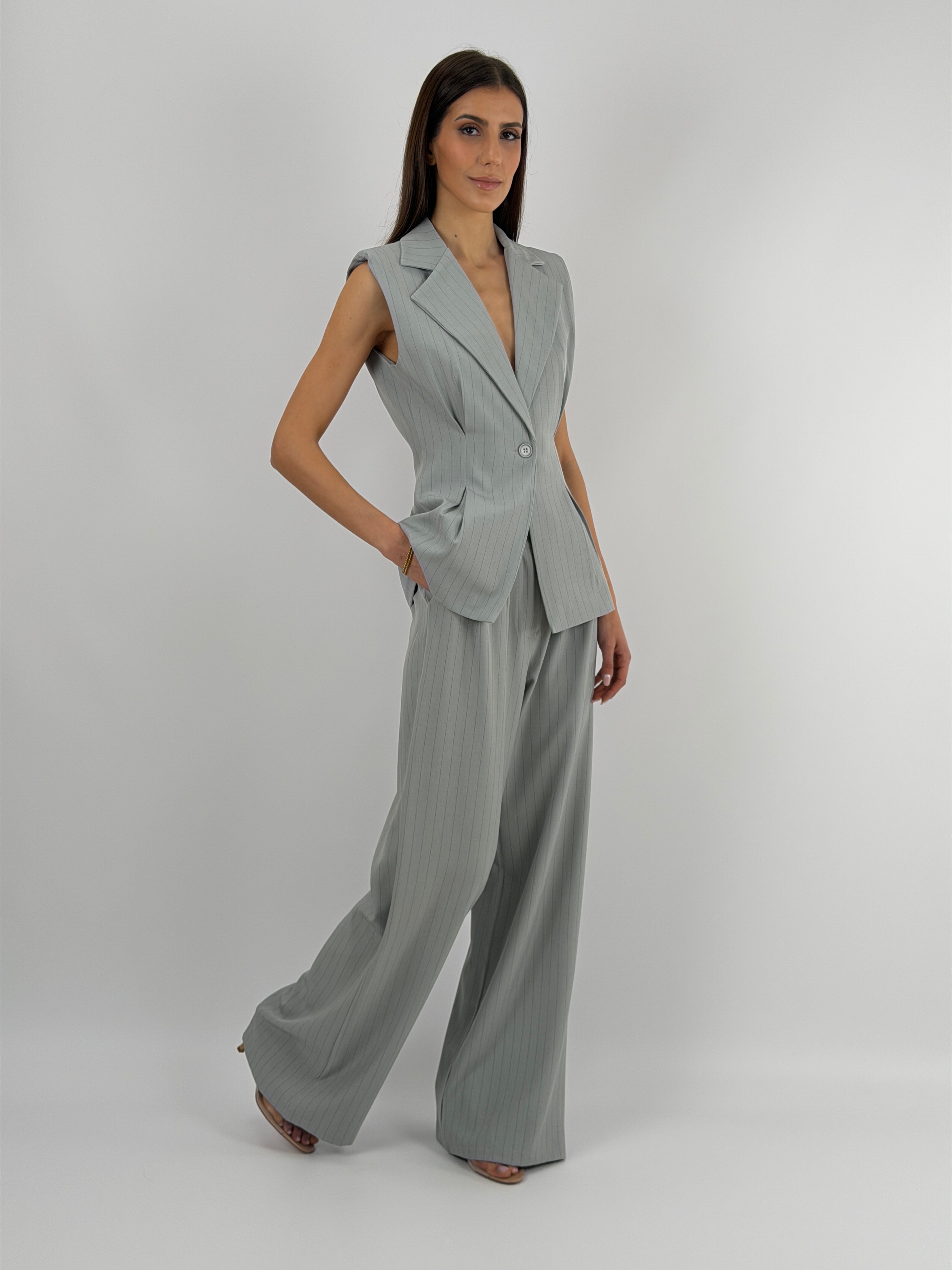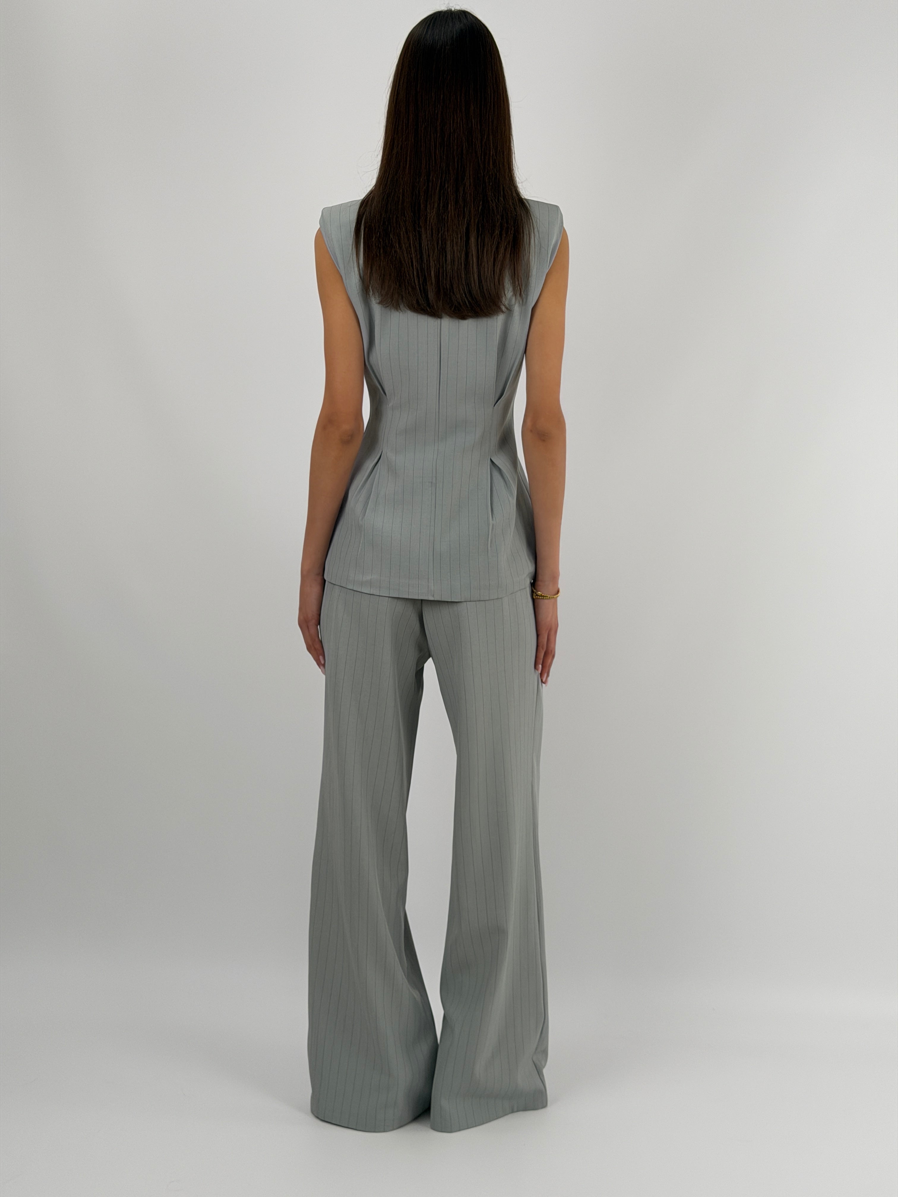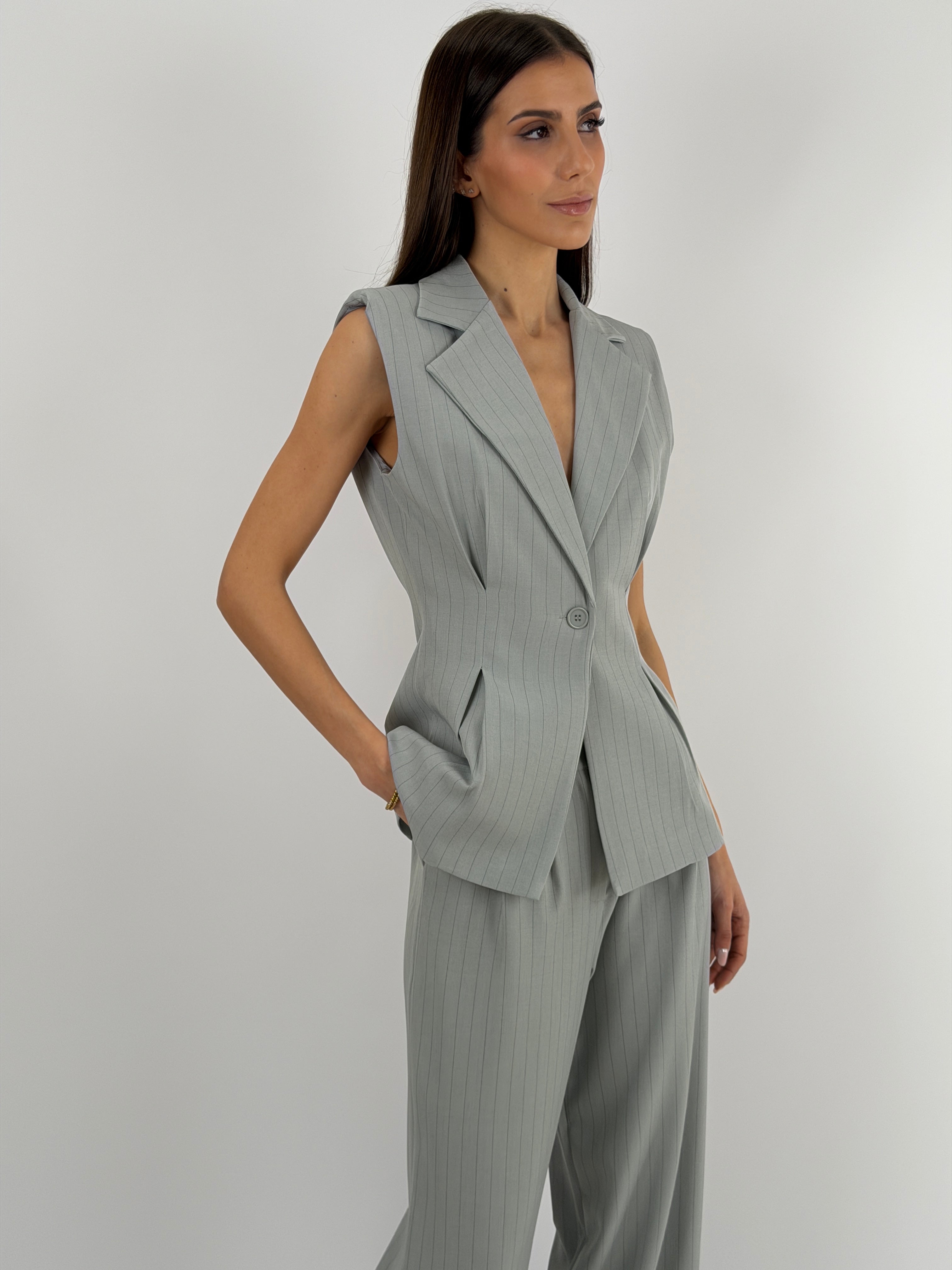 Gilet smanicato con chiusura monopetto, pinces sul davanti, spalline imbottite, fodera interna e revers.