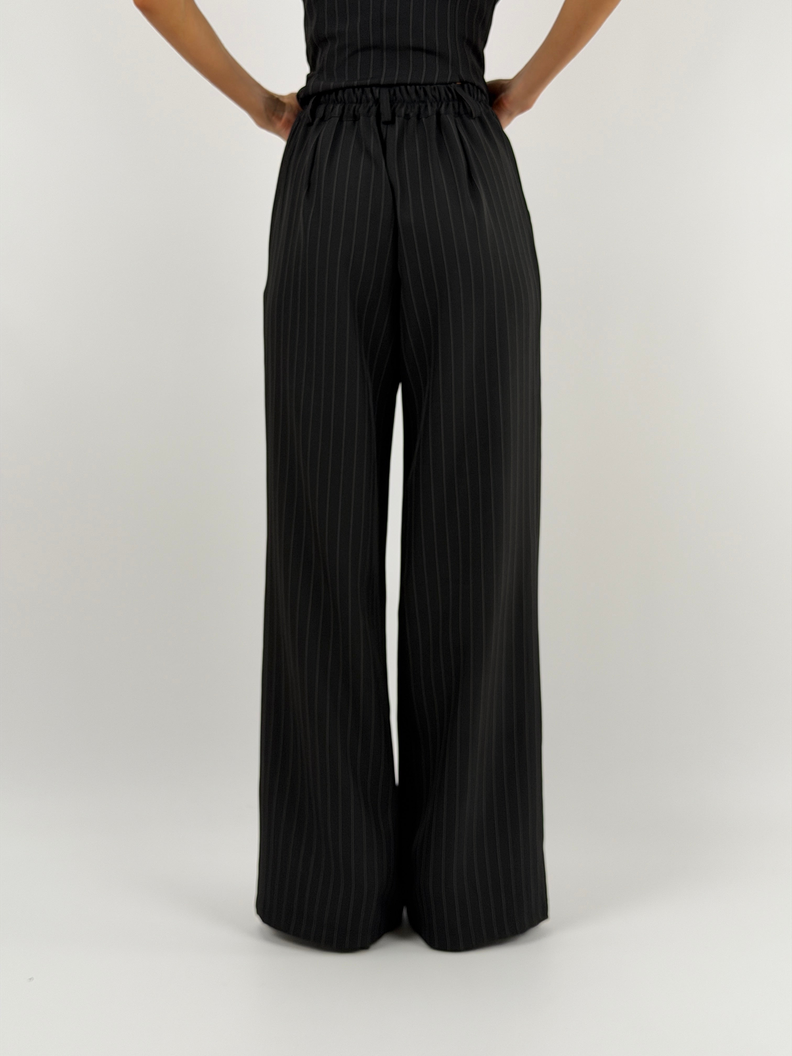 Pantalone a palazzo con elastico in vita sul retro, tasche laterali, chiusura con zip e bottone e passanti per cintura