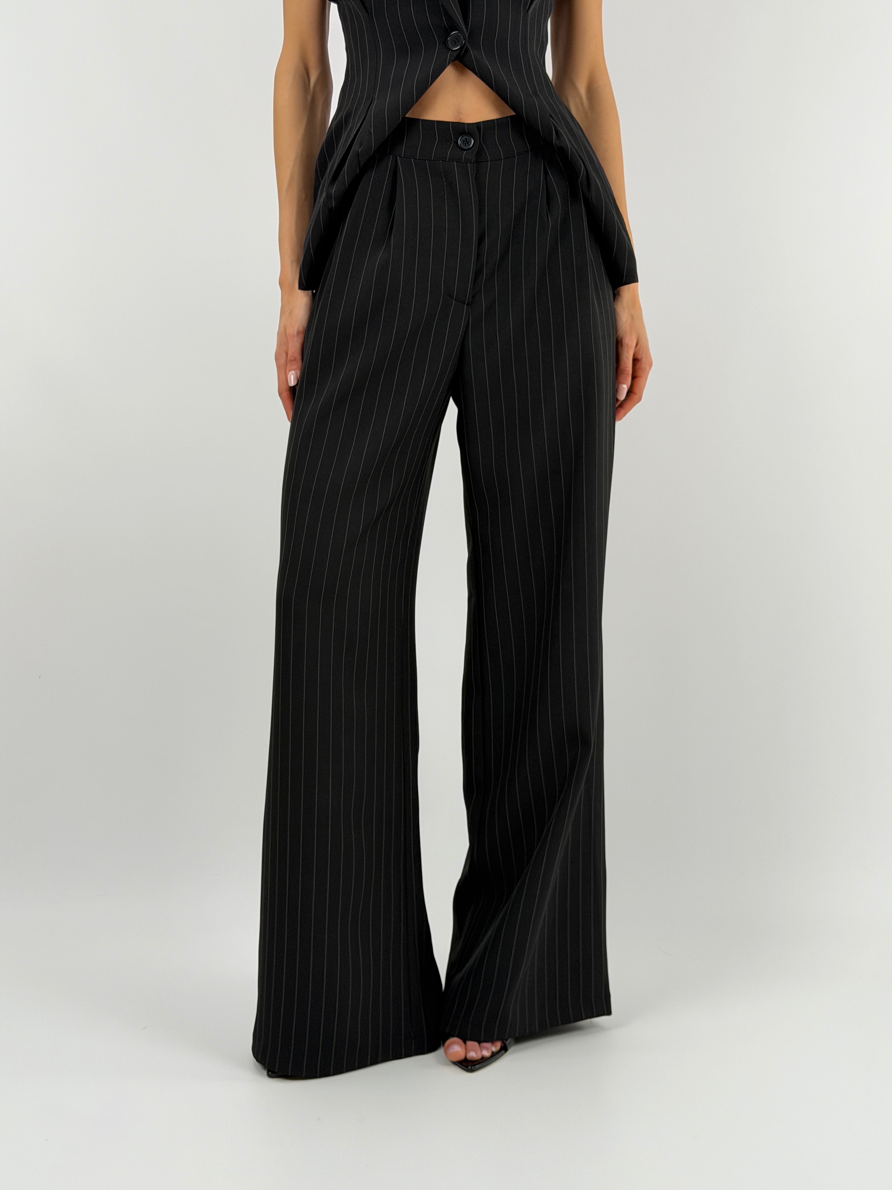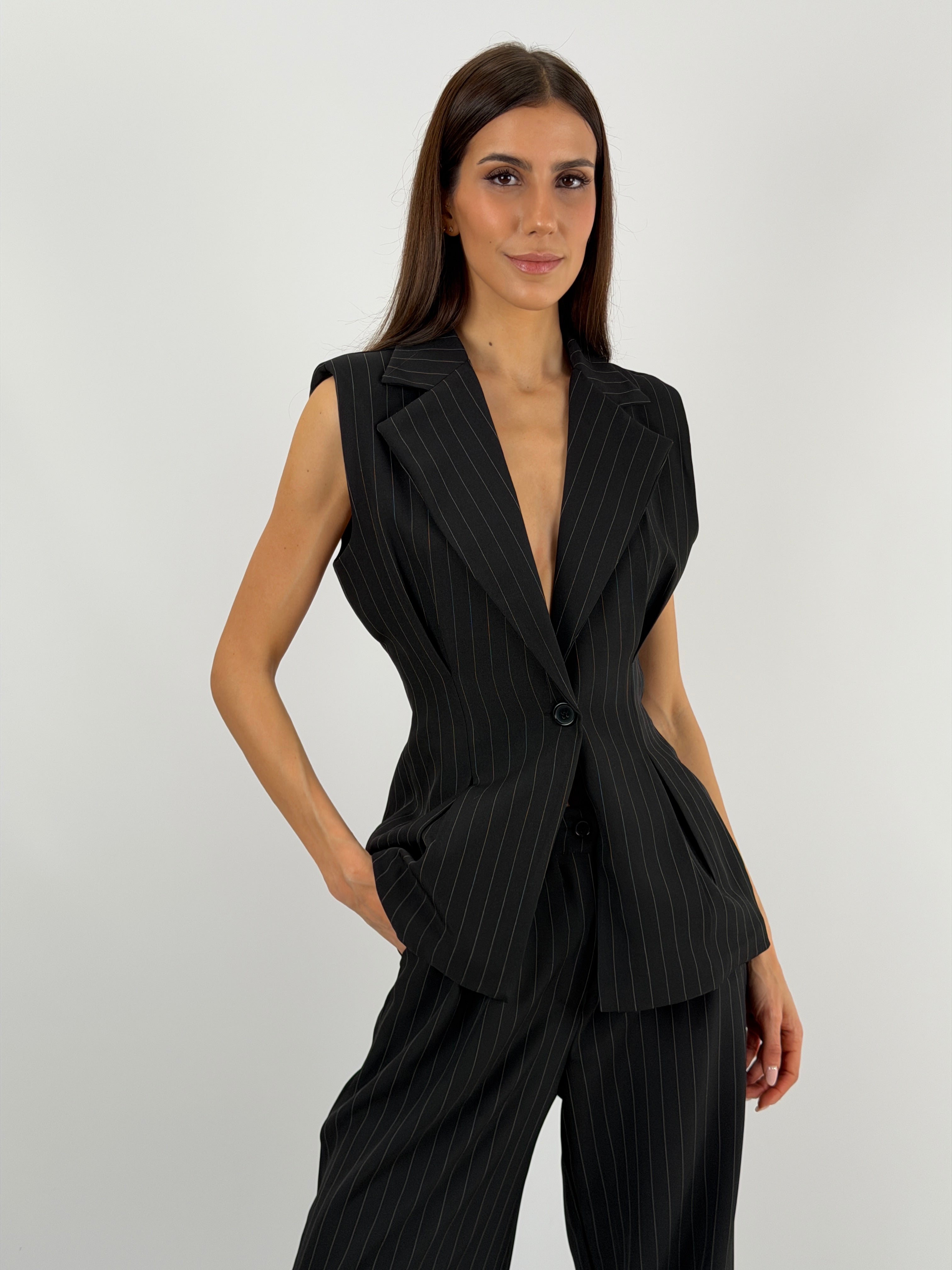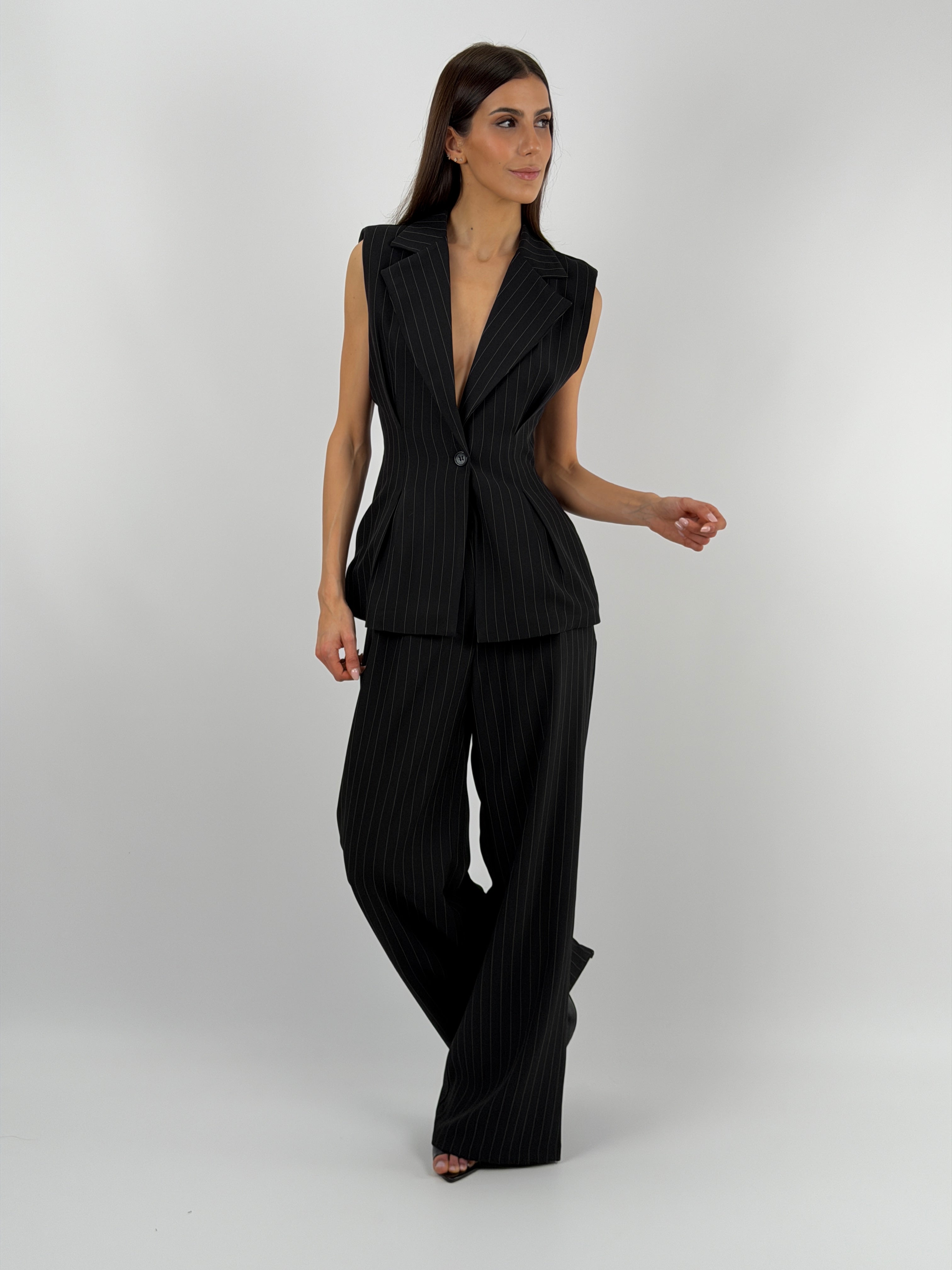 Set coordinato gessato nero con gilet e pantalone.