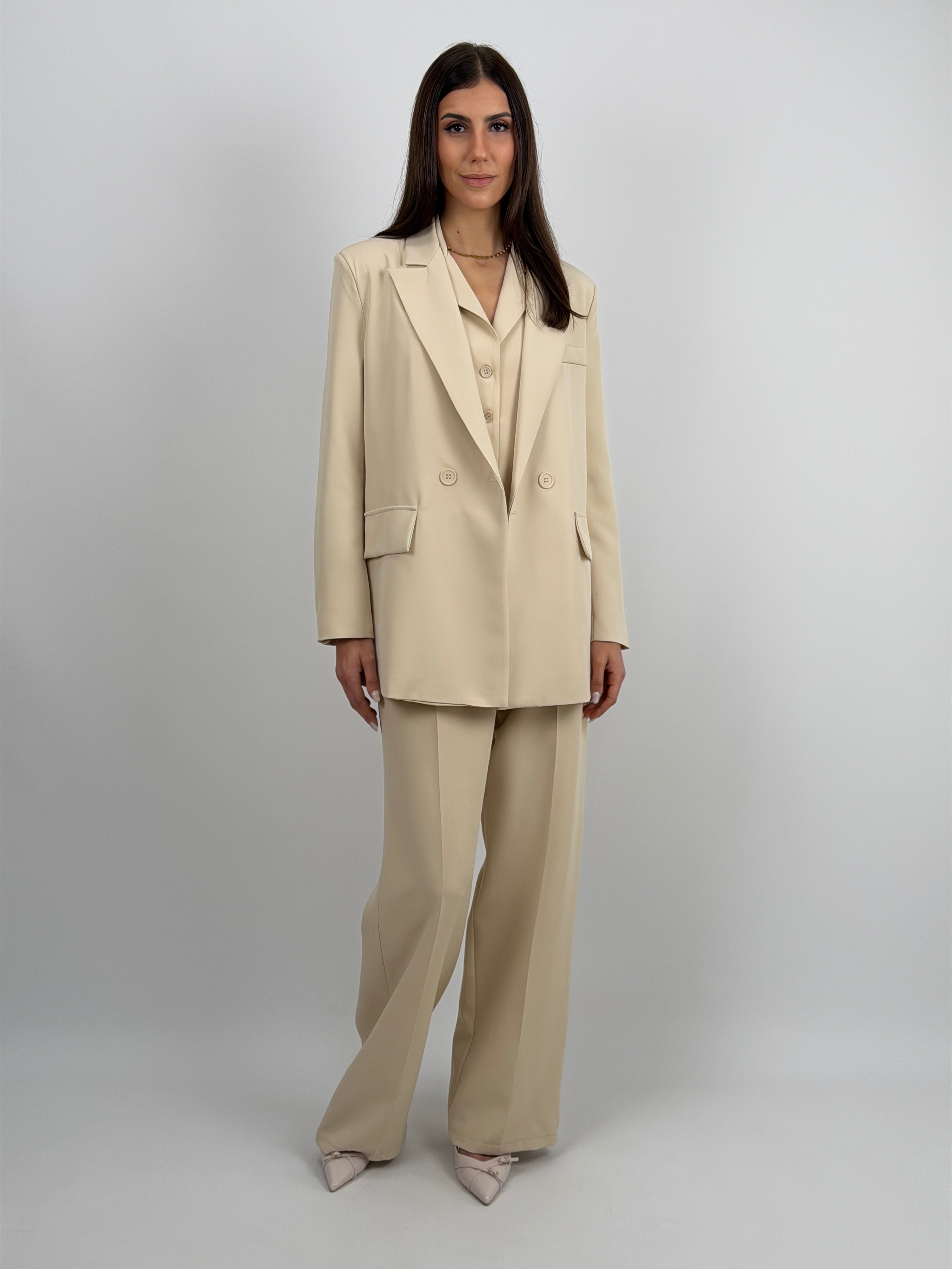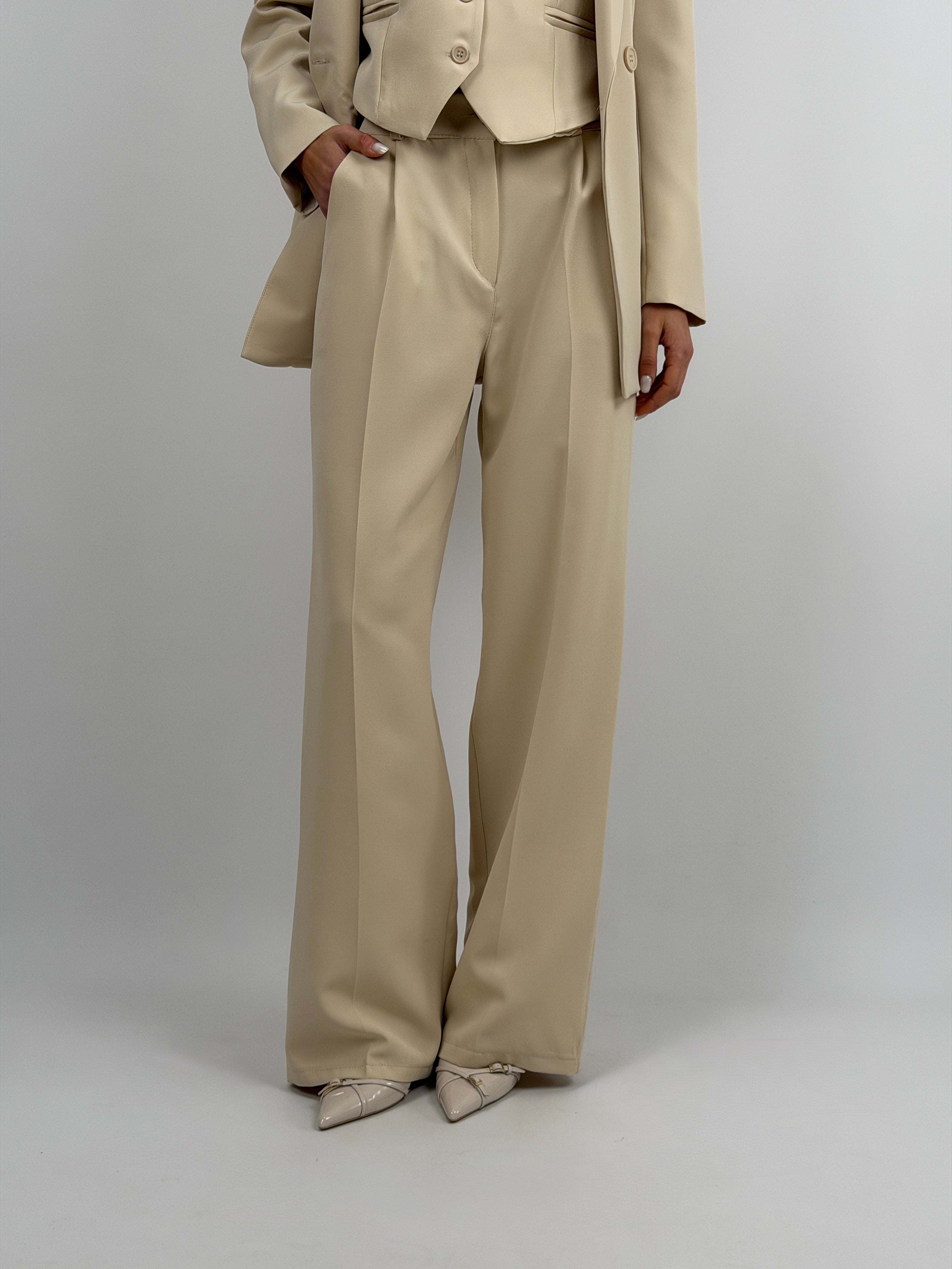 Pantalone beige da completo a palazzo con elastico sul retro, chiusura con zip e bottone, passanti per cintura e tasche laterali.