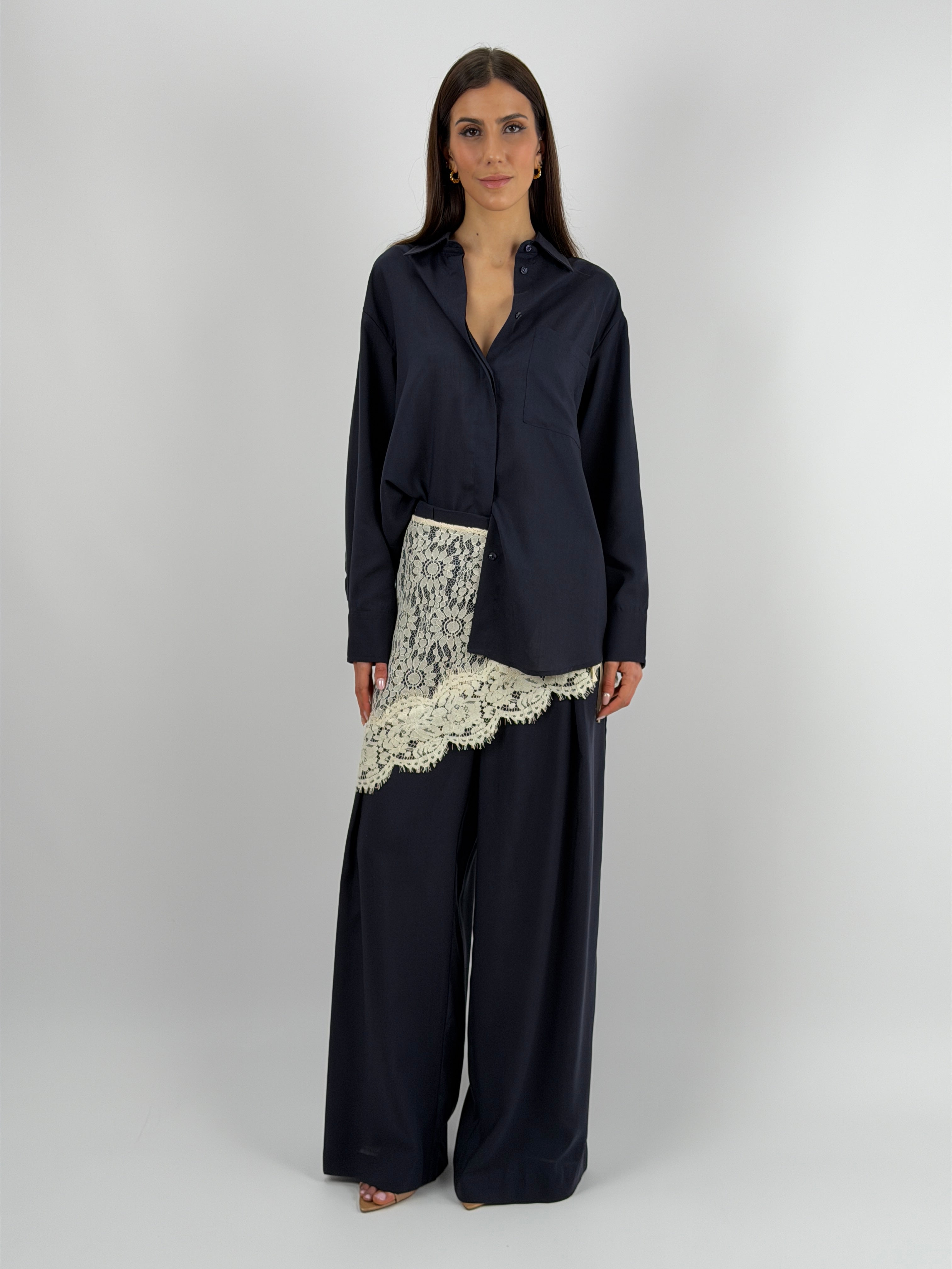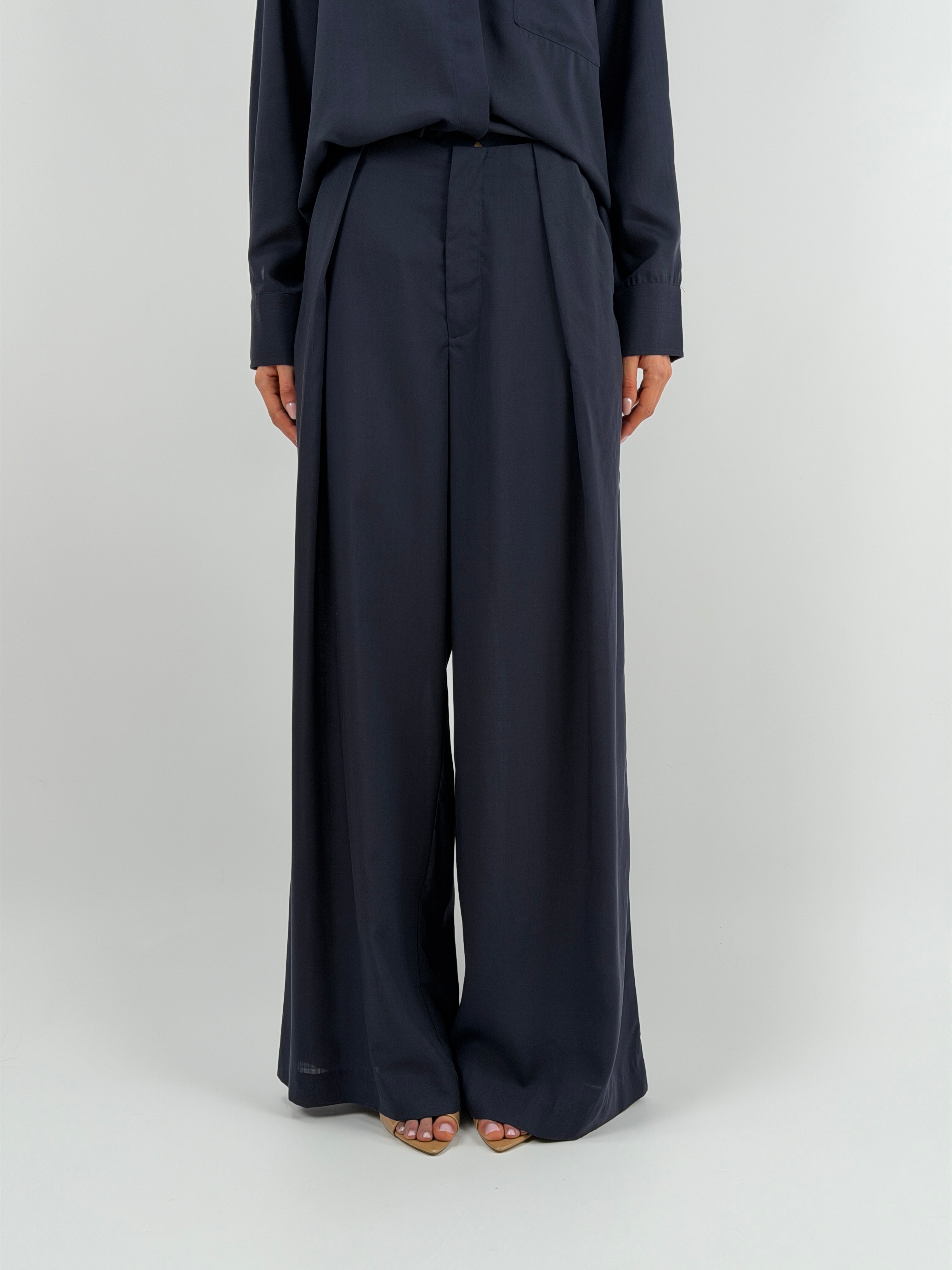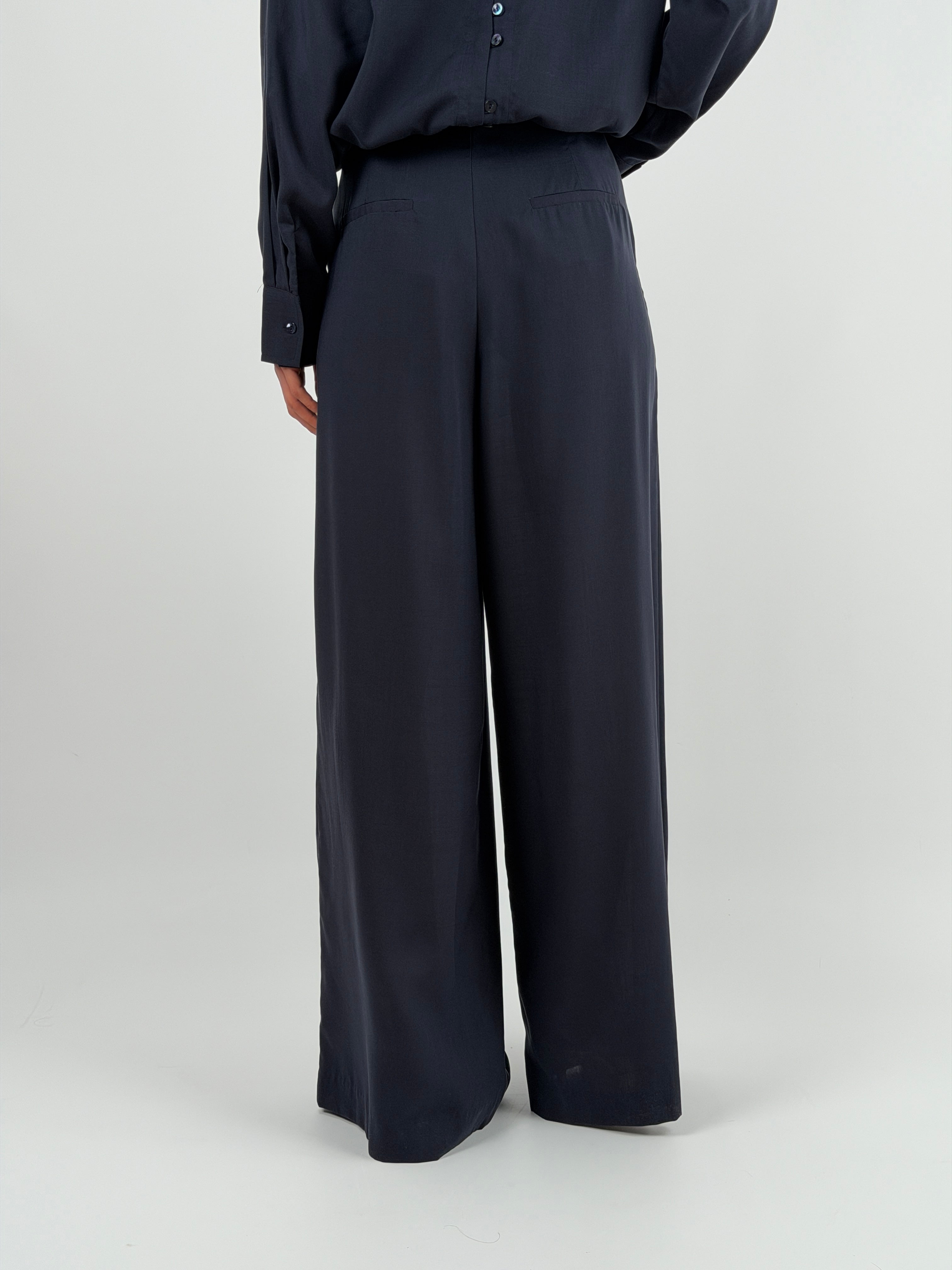 Pantalone Lumina blu fluido a palazzo con pinces, tasche laterali e chiusura con zip e bottone