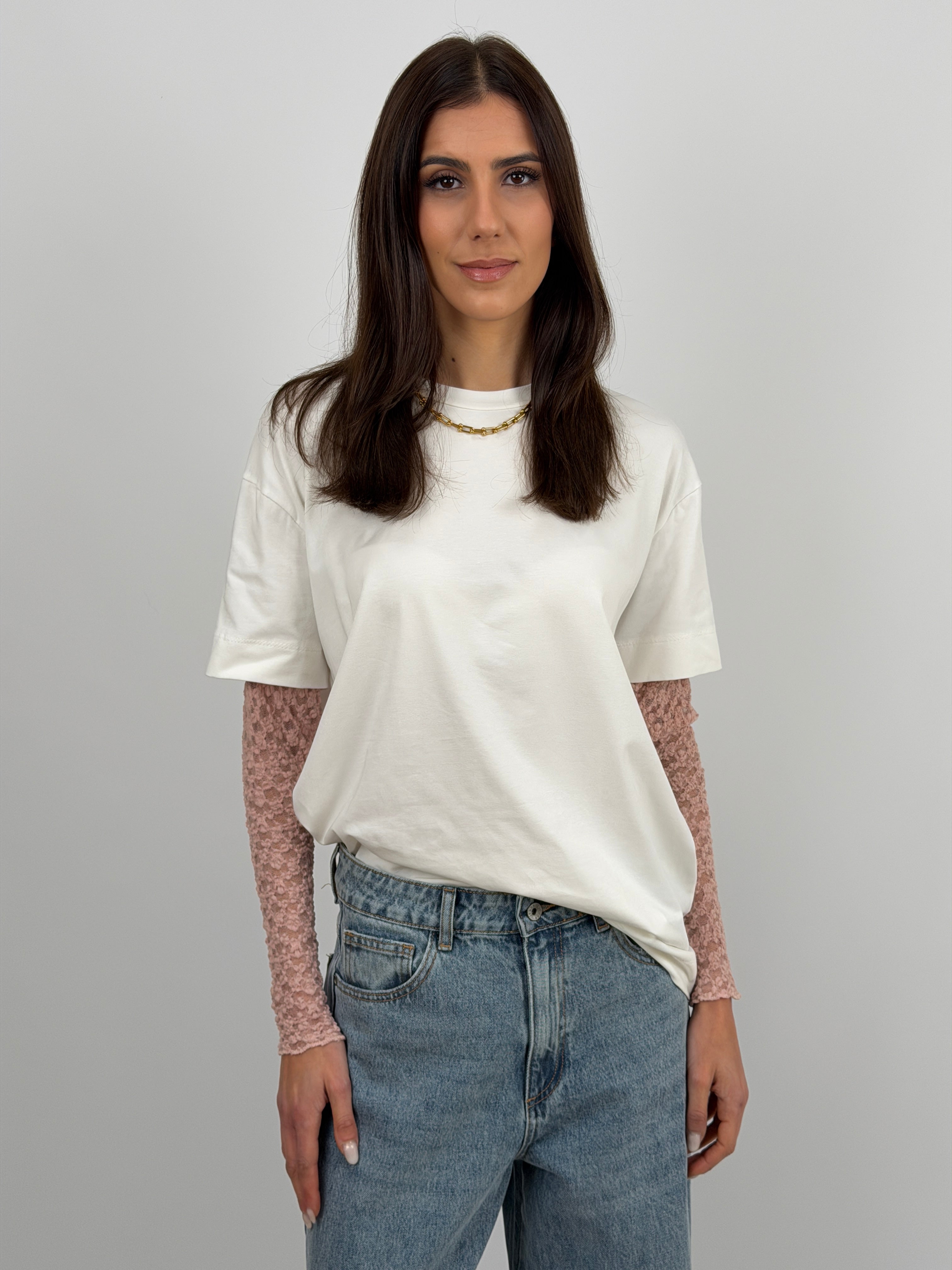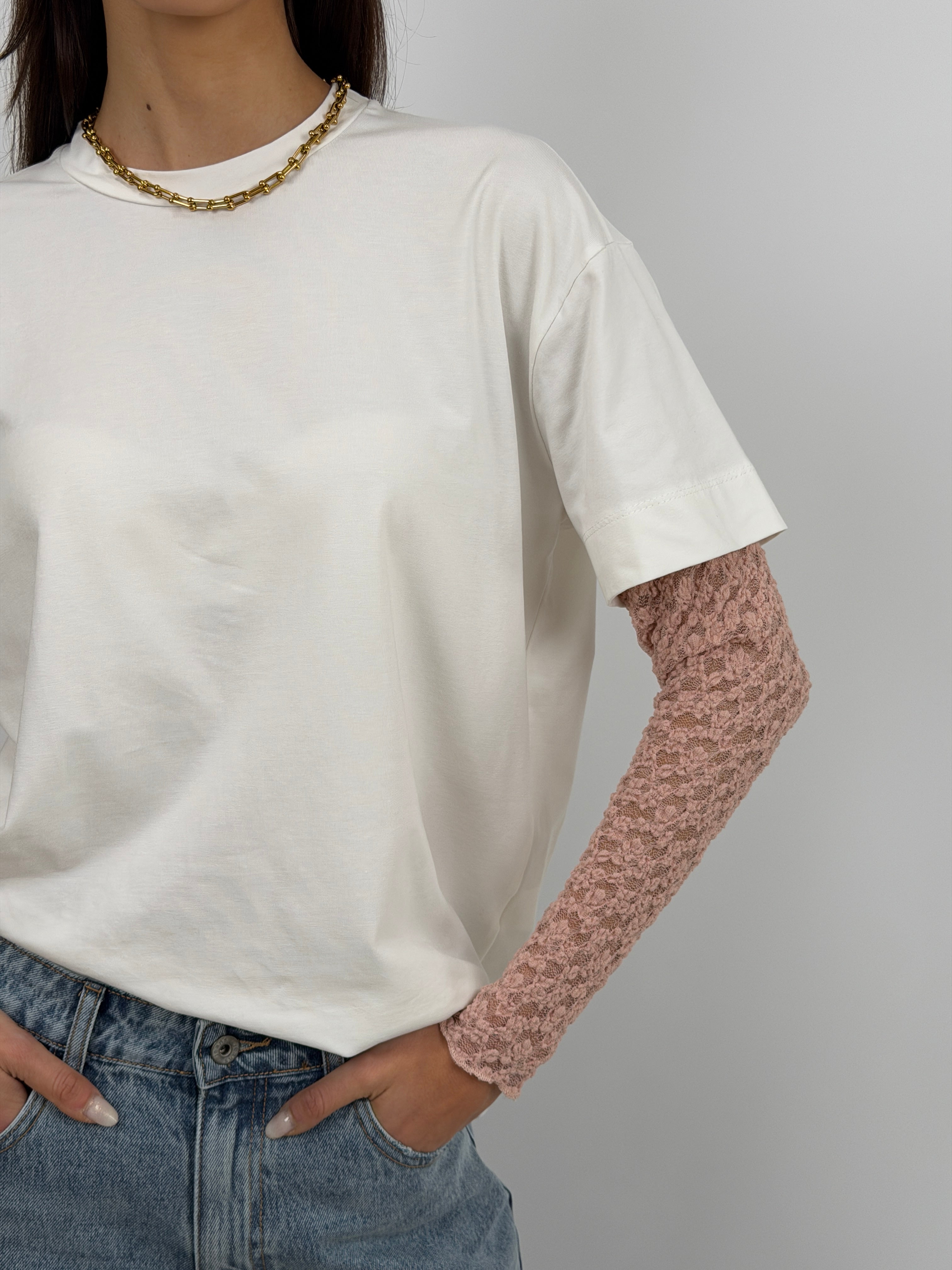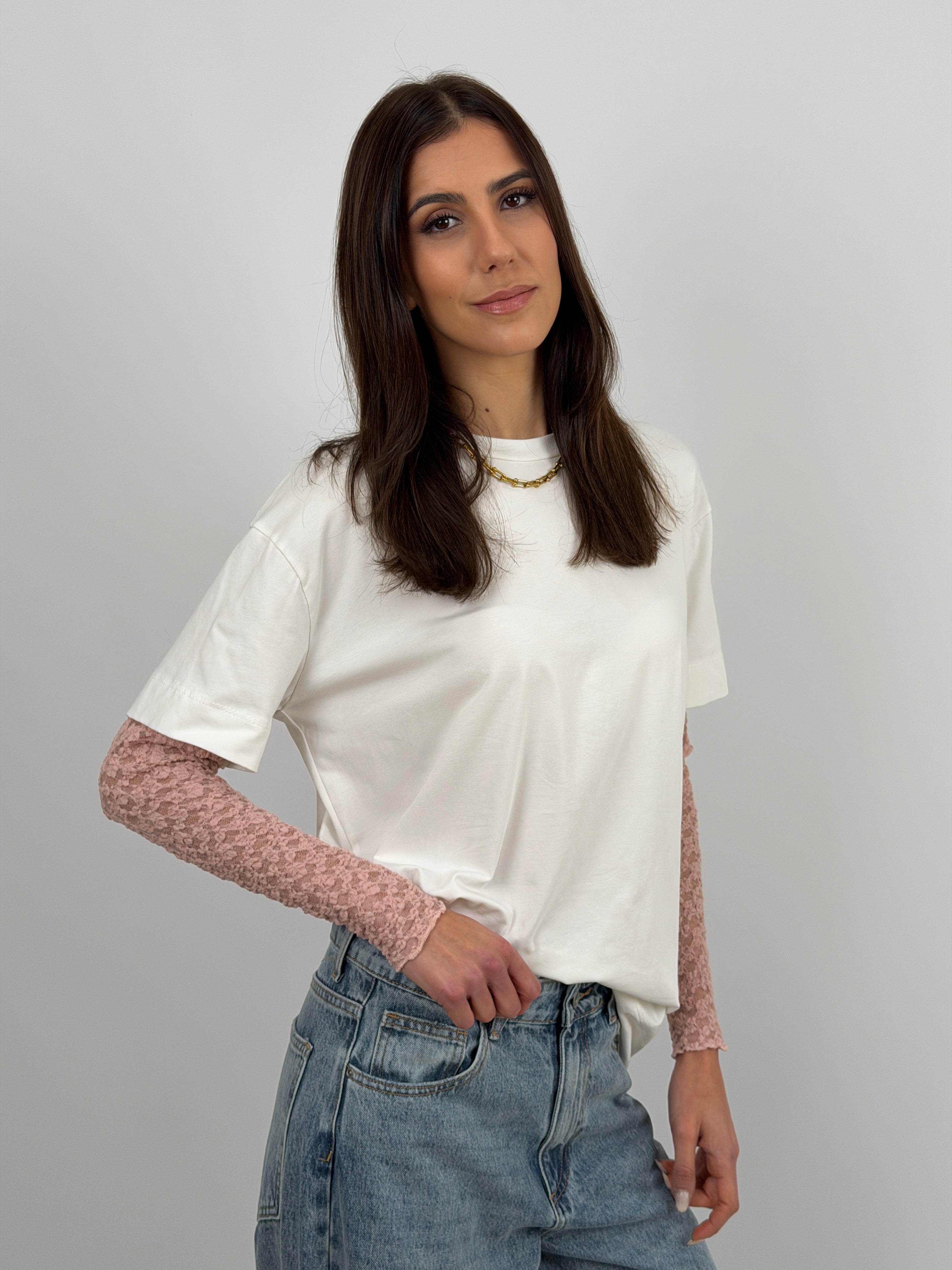 T-shirt bianca over a girocollo in cotone con maniche in pizzo rosa antico