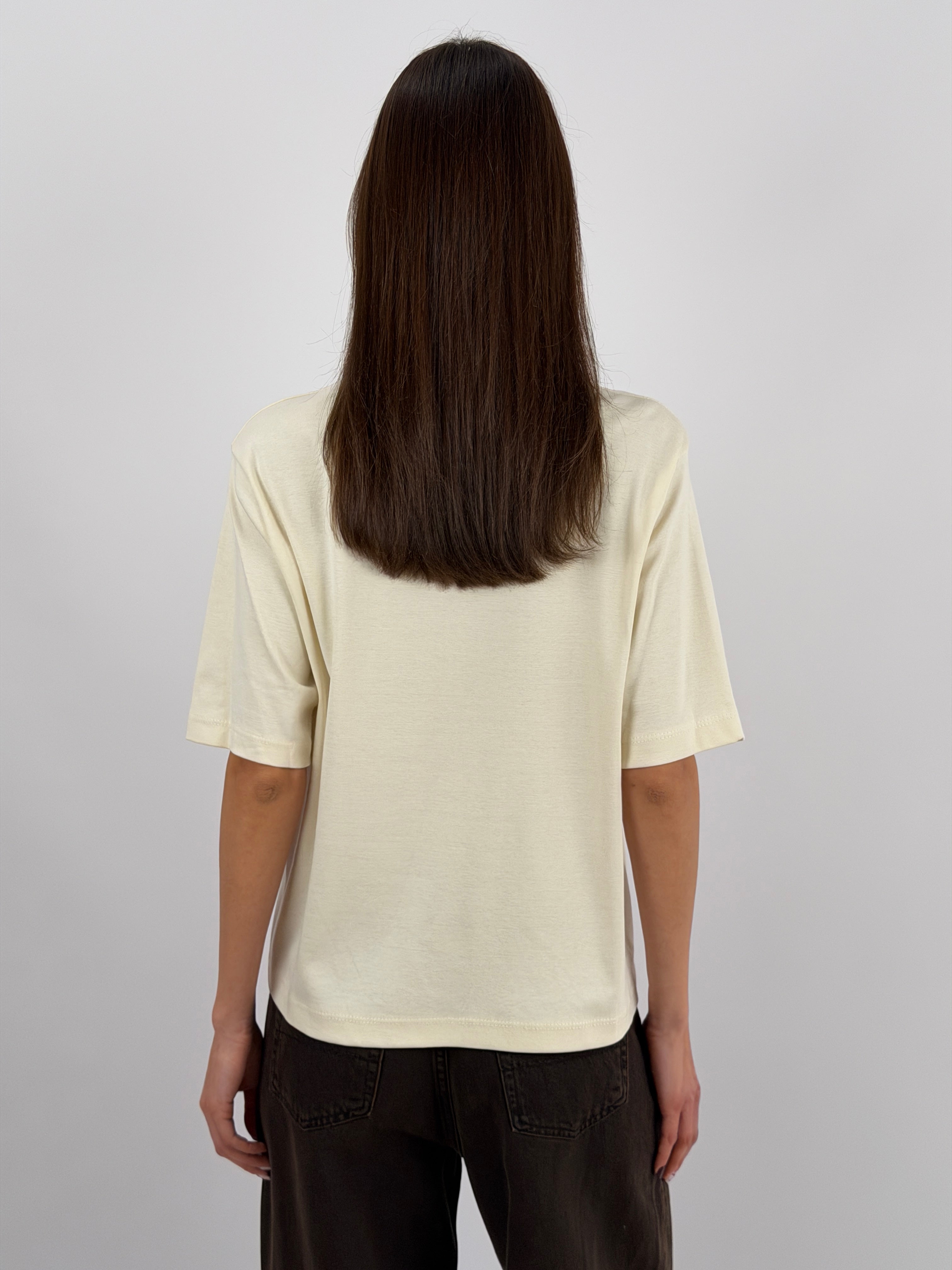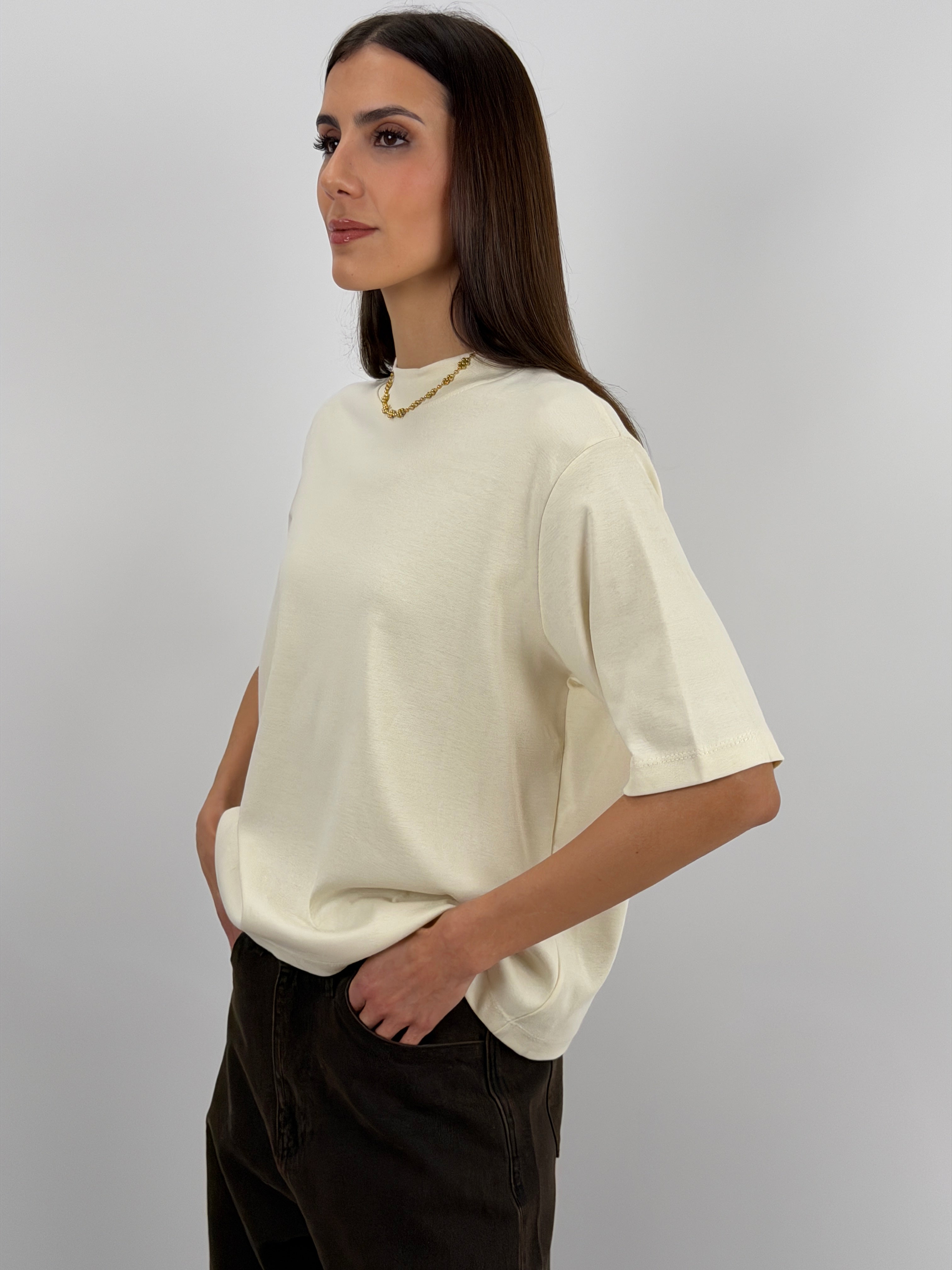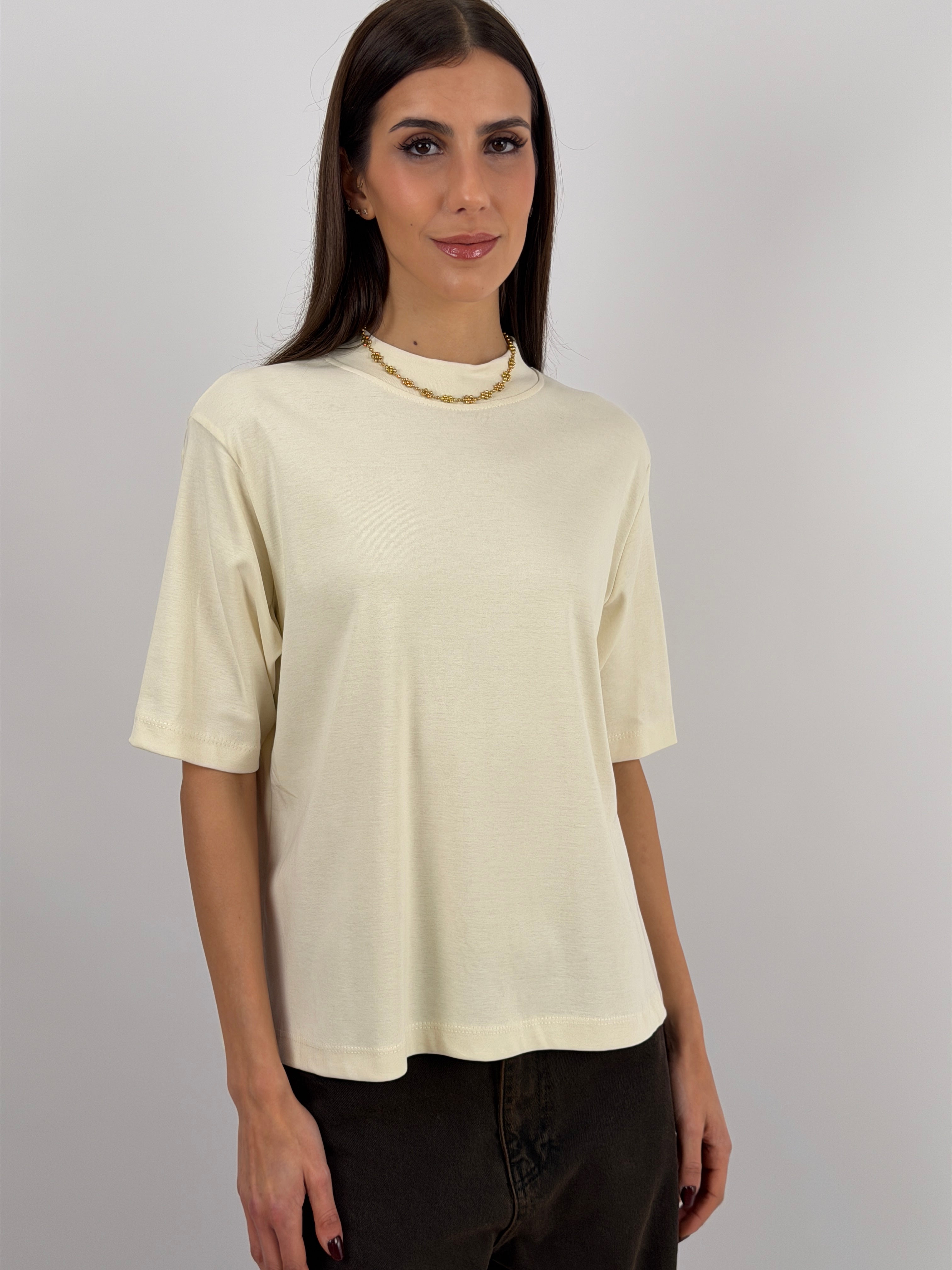 Maglietta crema in cotone con maniche corte ampie e colletto alto.