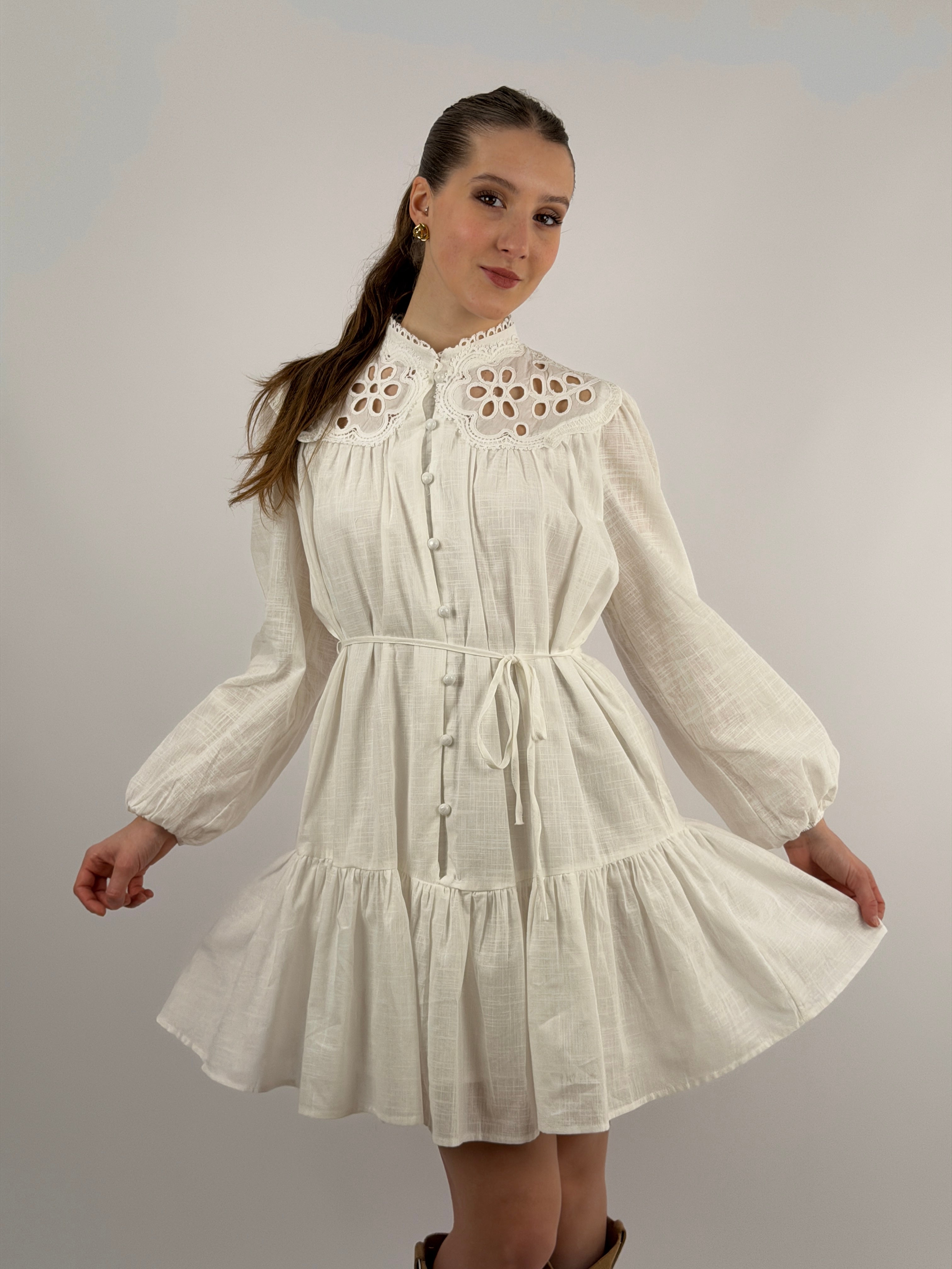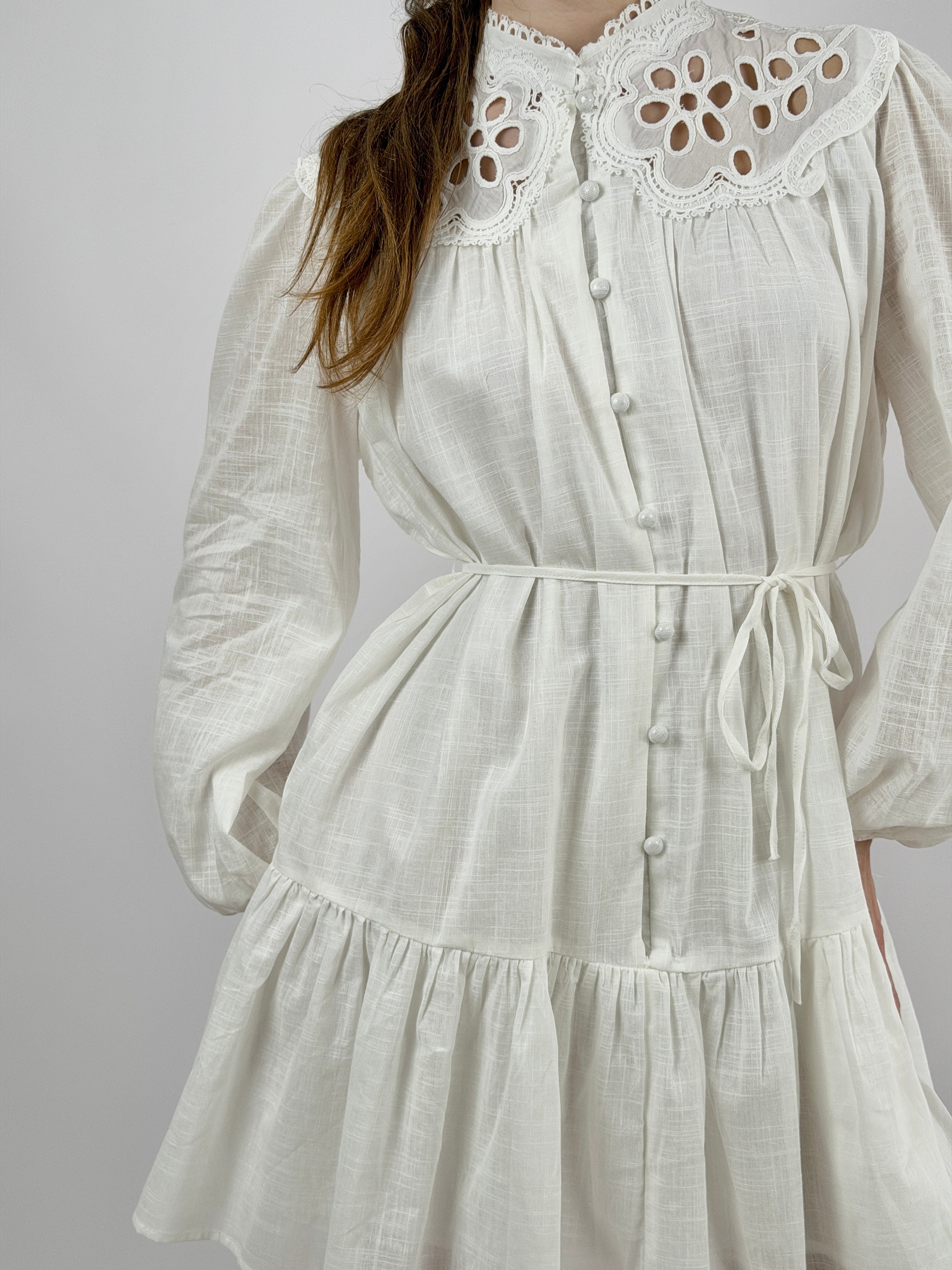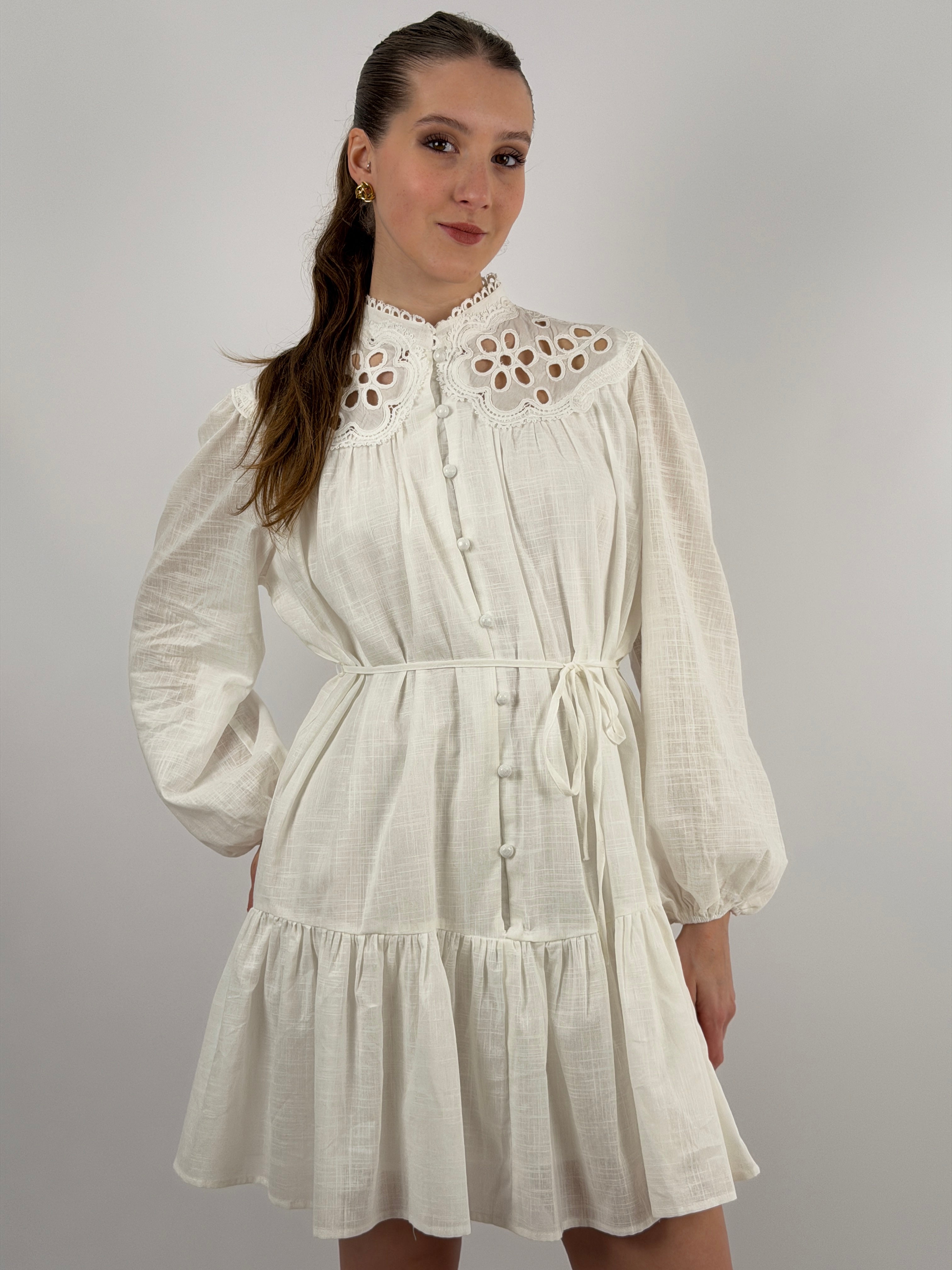 Abito corto chemisier bianco in cotone con inserti in pizzo tono su tono, maniche lunghe e bottoncini frontali, cintura sottile in vita