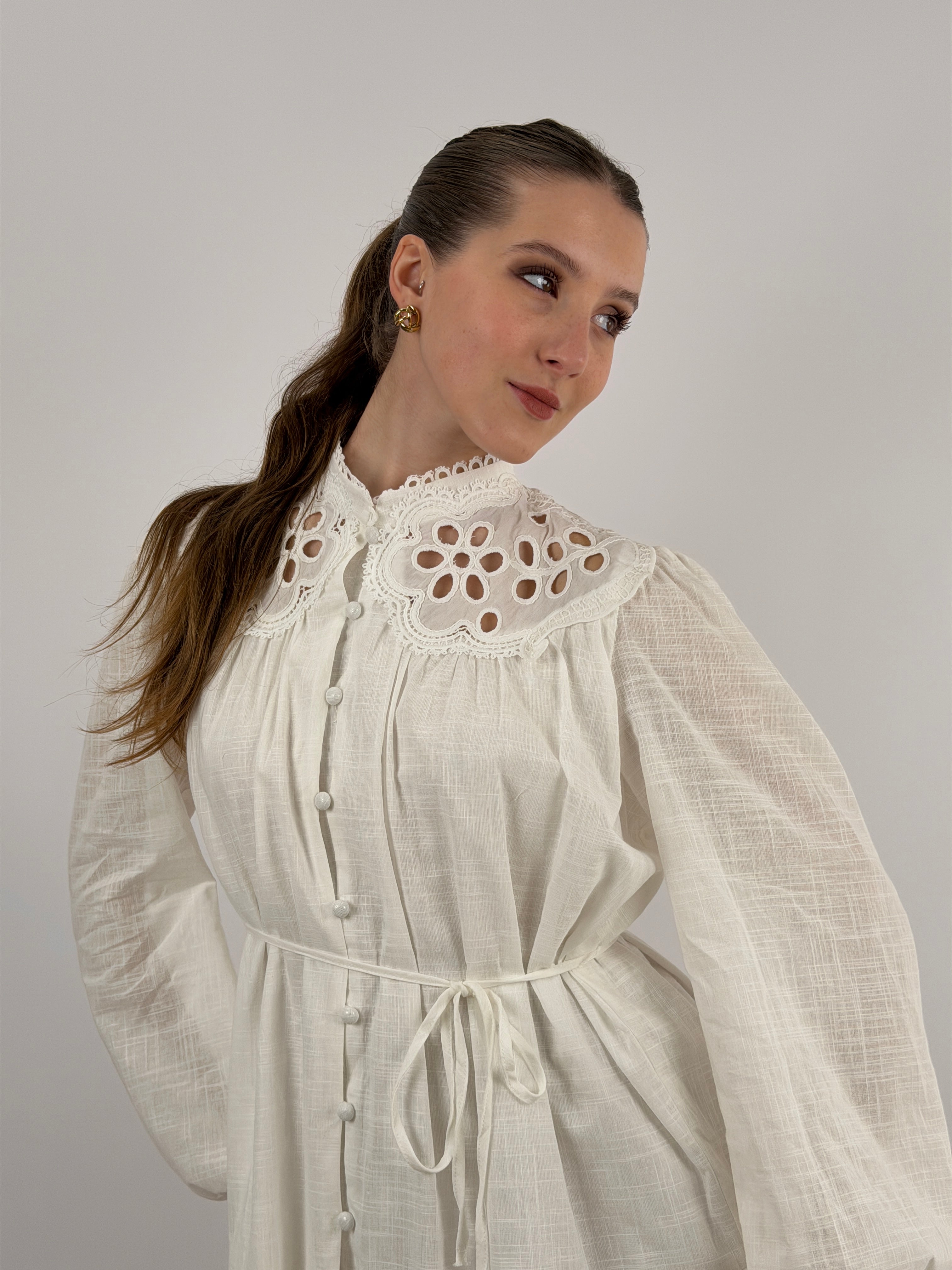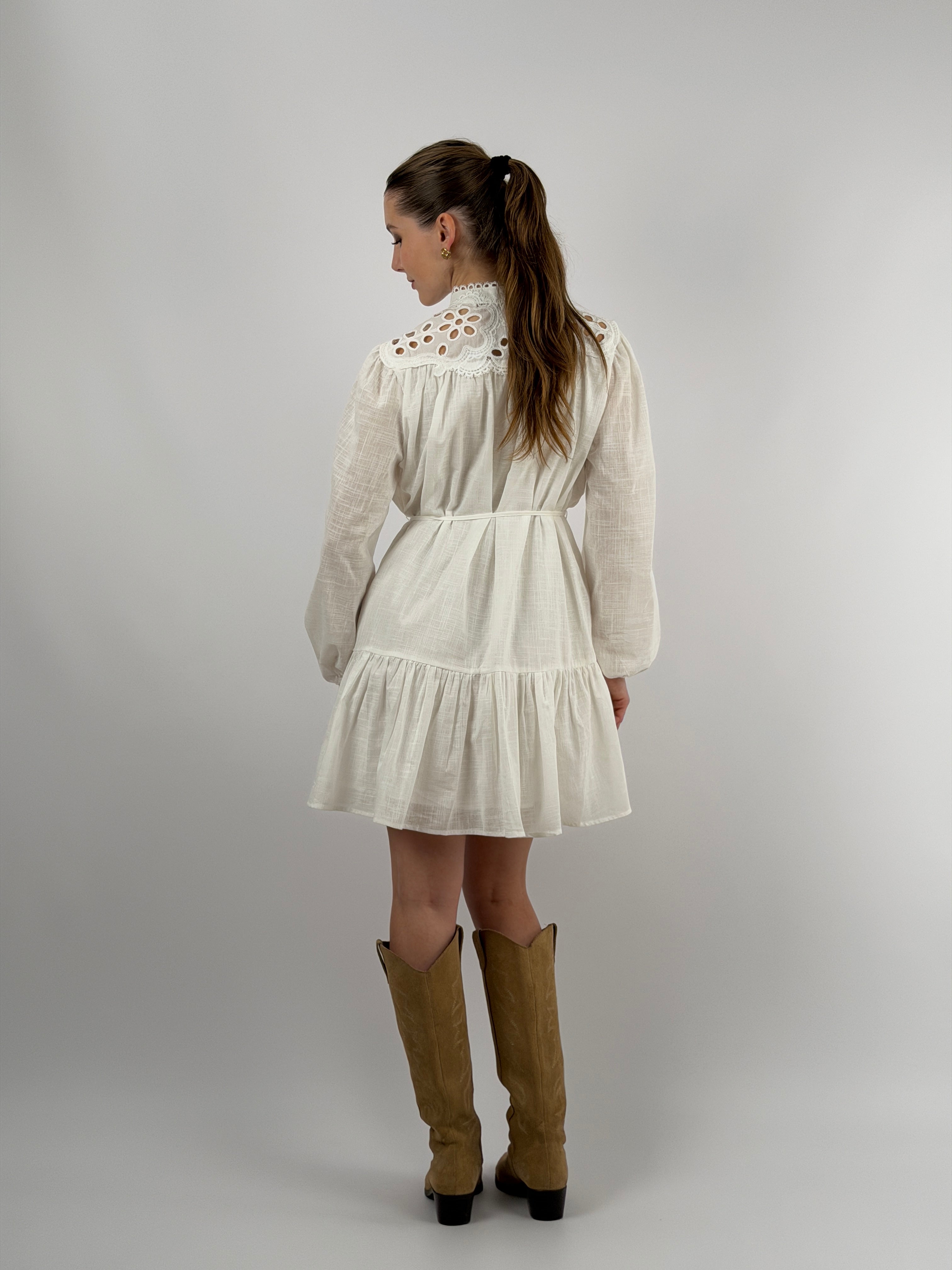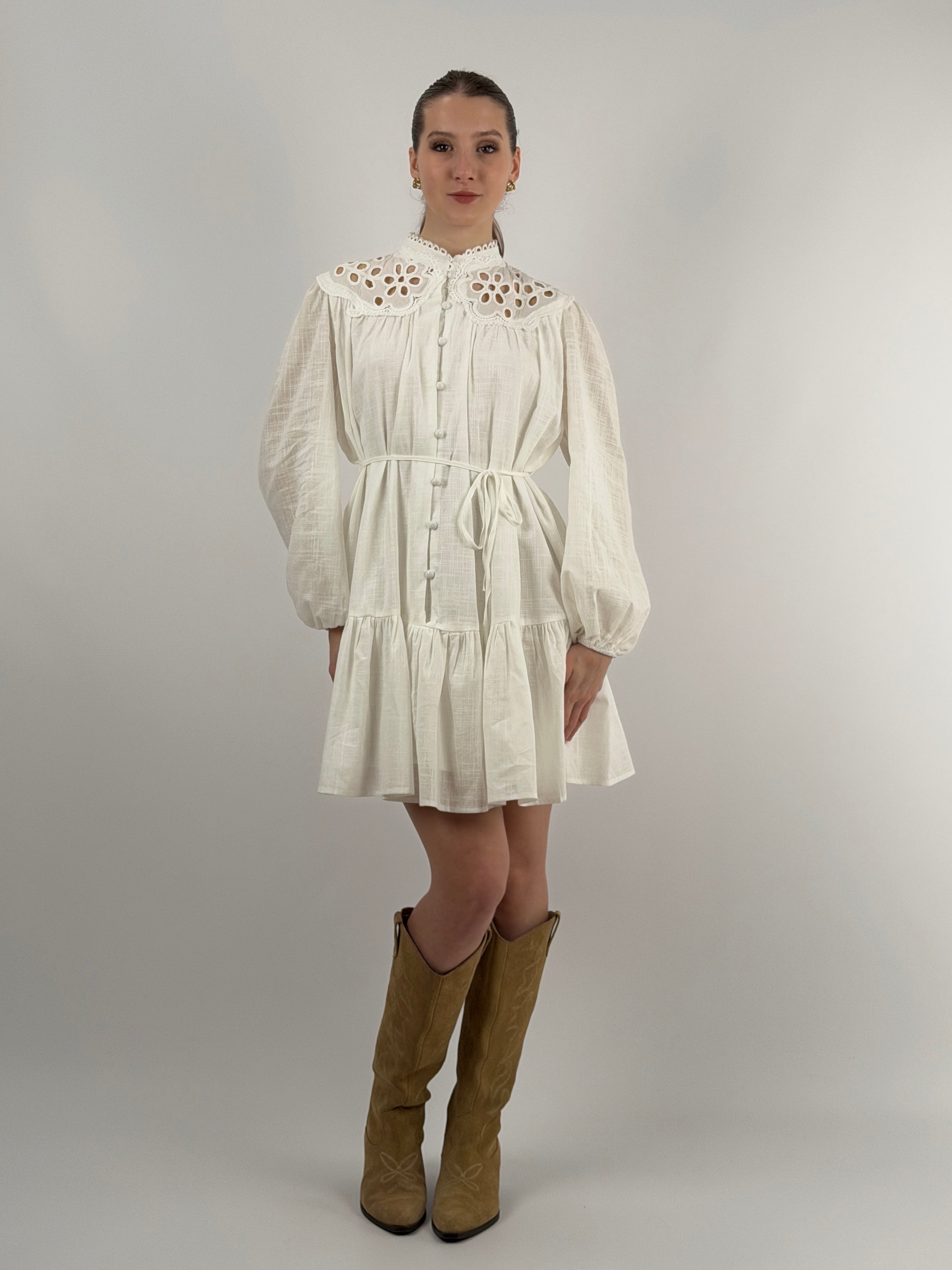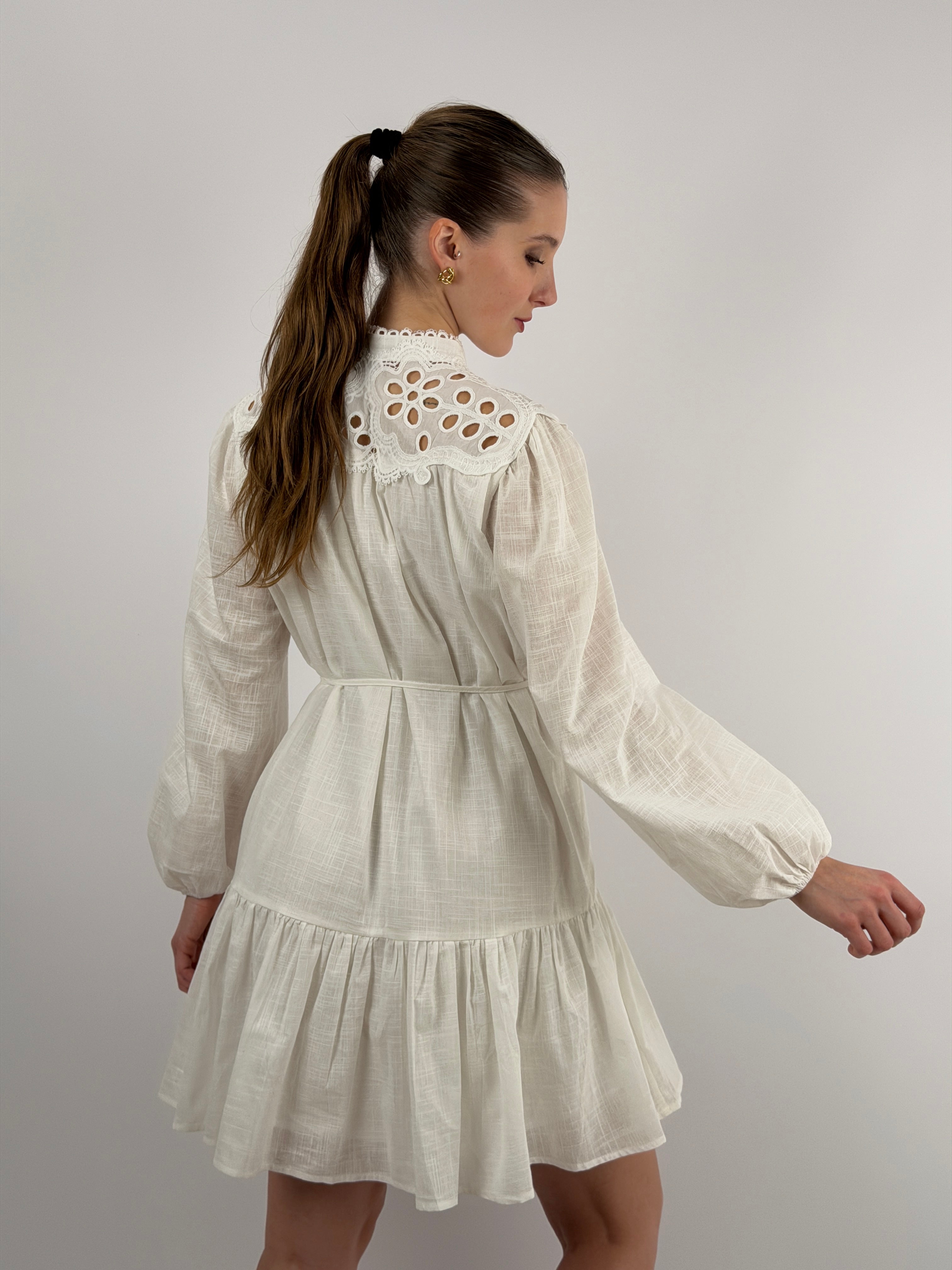Abito corto chemisier bianco in cotone con inserti in pizzo tono su tono, maniche lunghe e bottoncini frontali, cintura sottile in vita