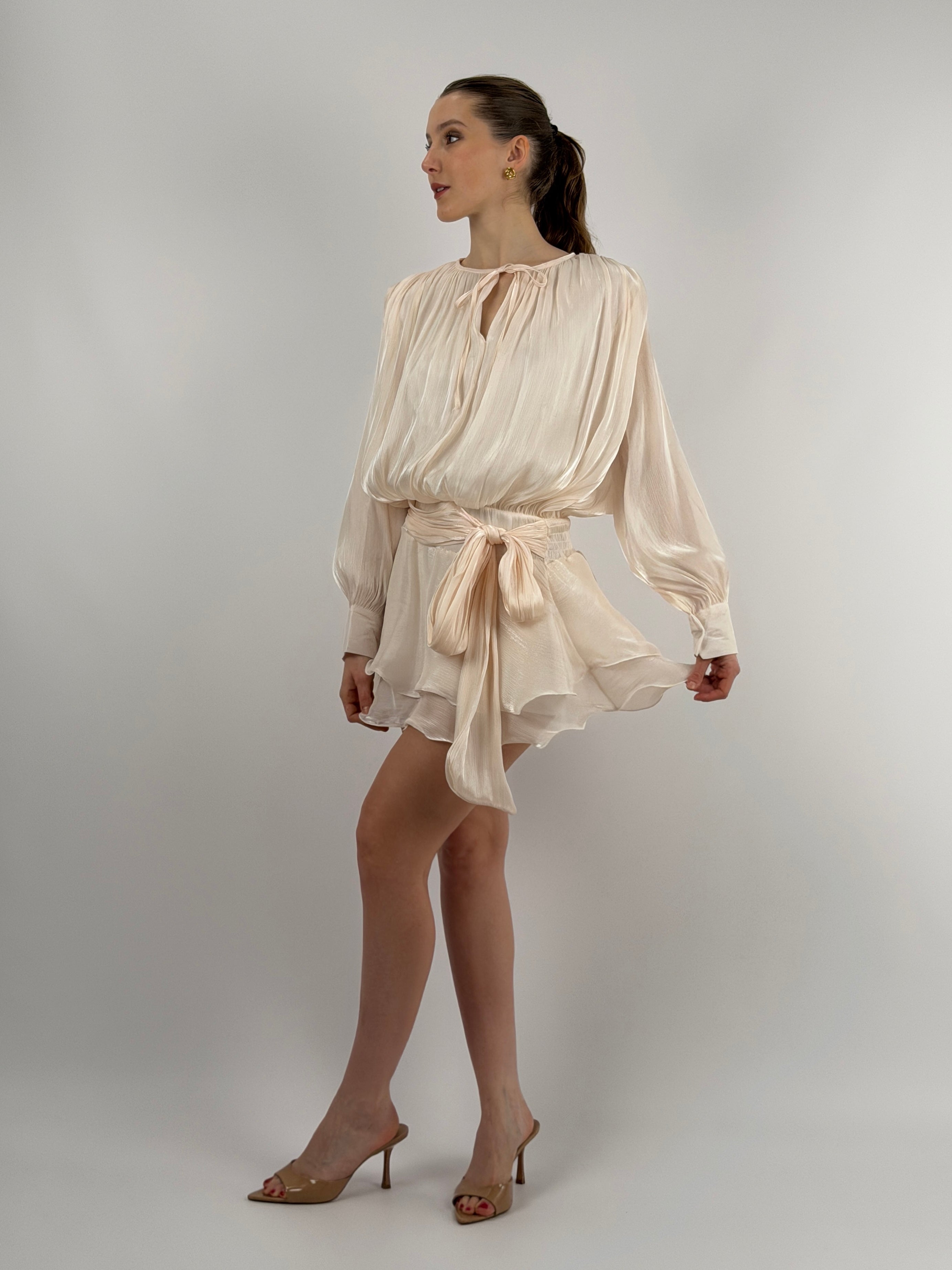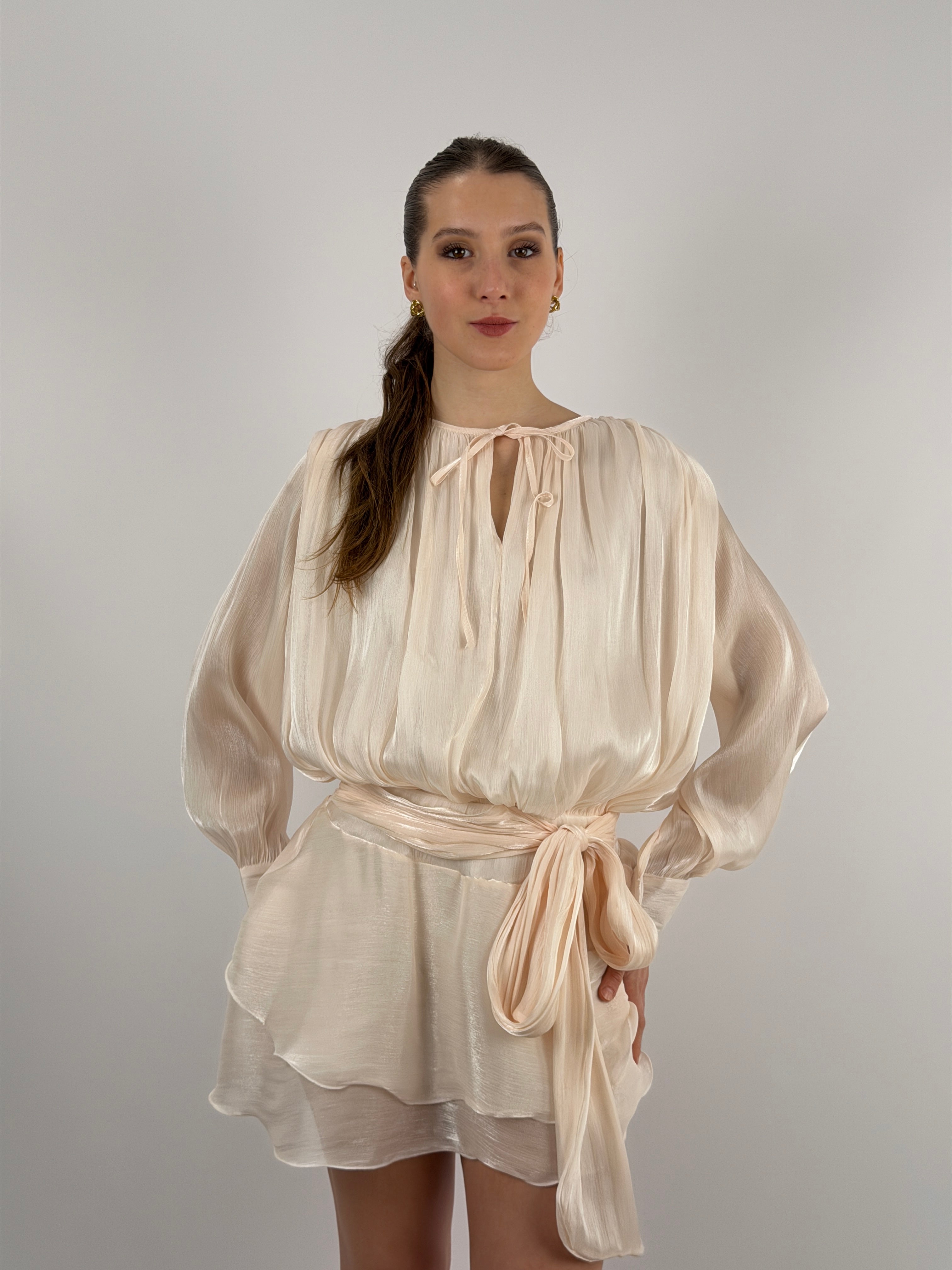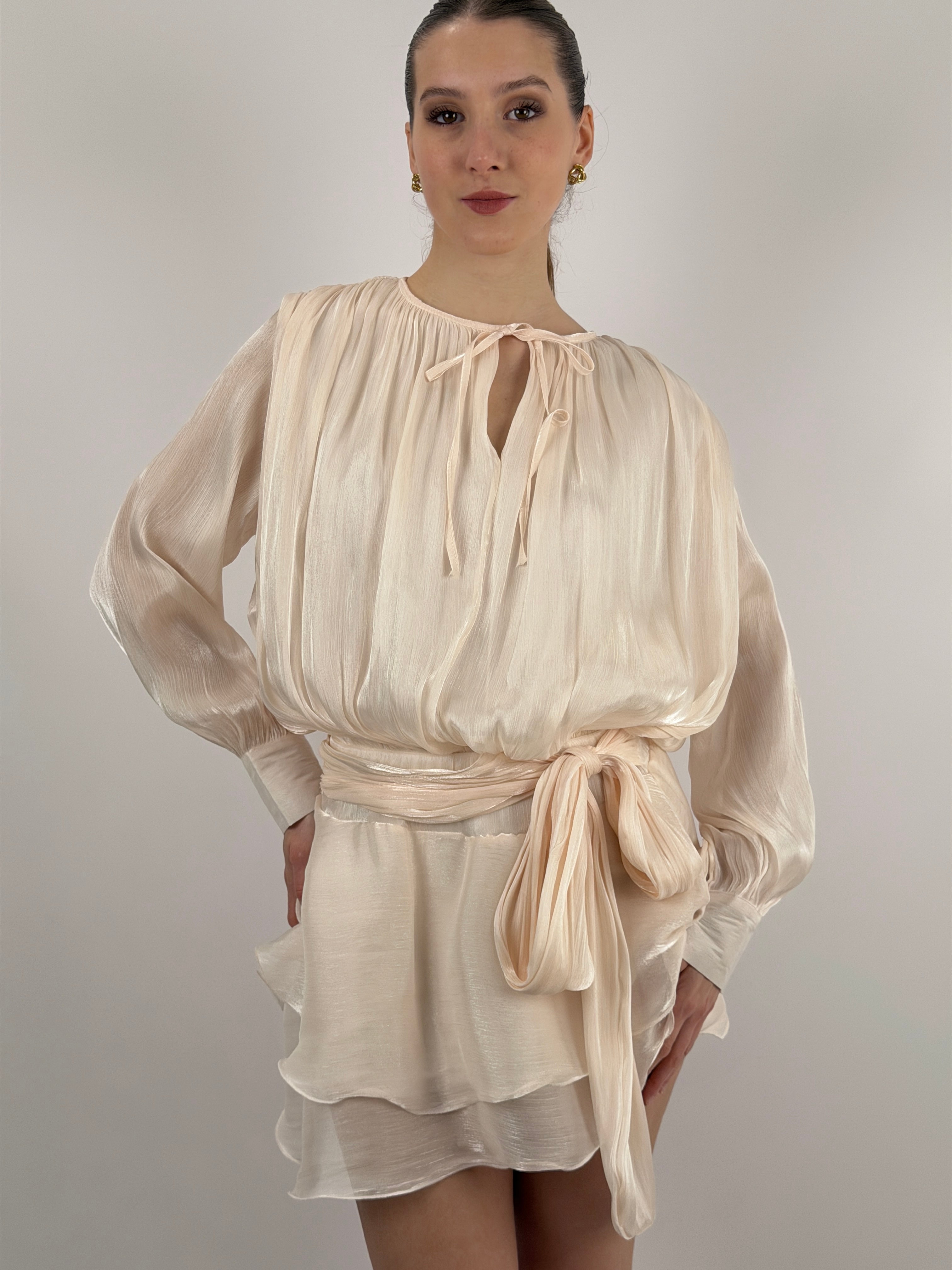 Abito corto in raso cipria con tessuto brillante, a maniche lunghe e girocollo con fiocco, elastico in vita con fusciacca e polsini con bottoni