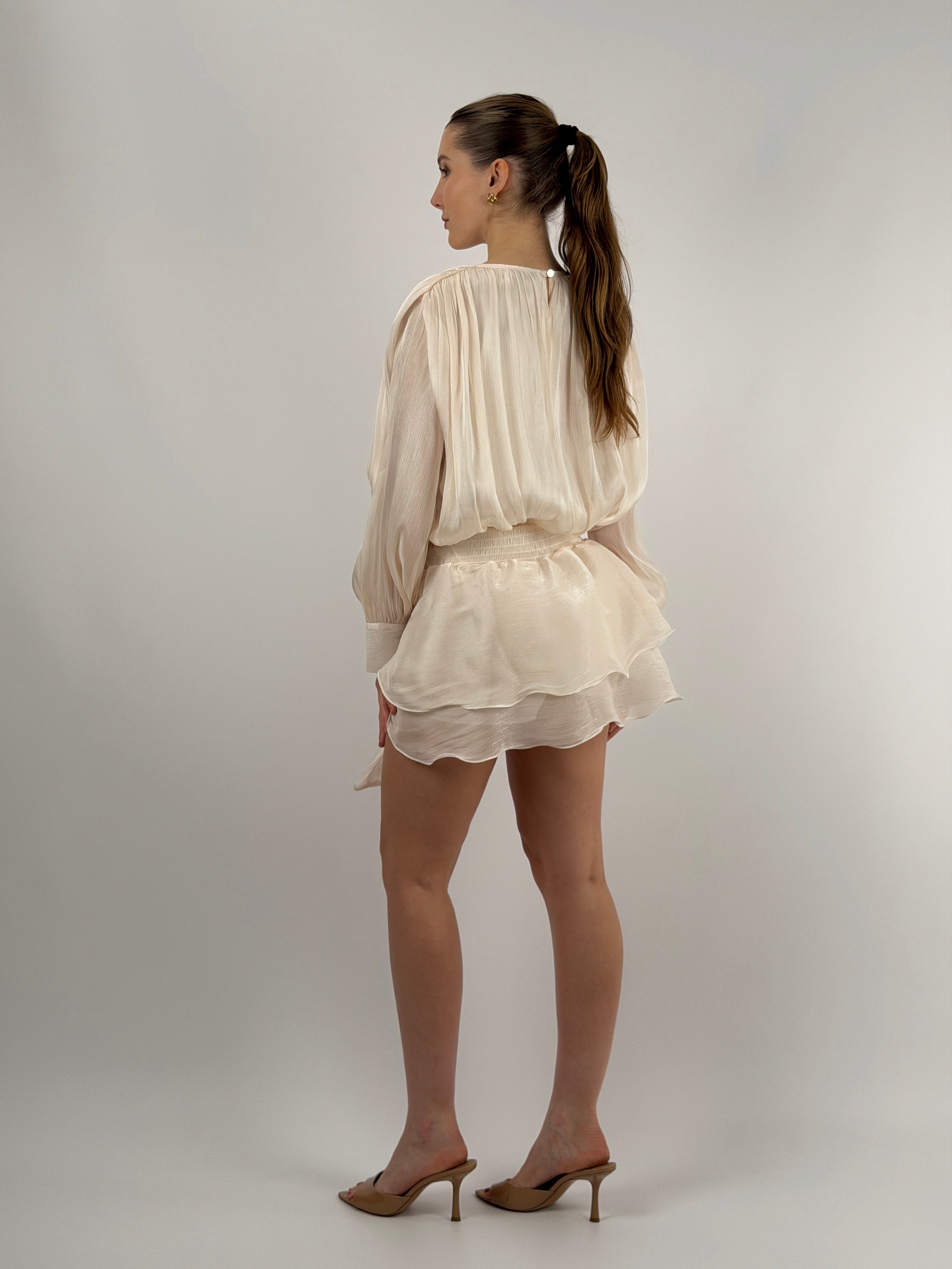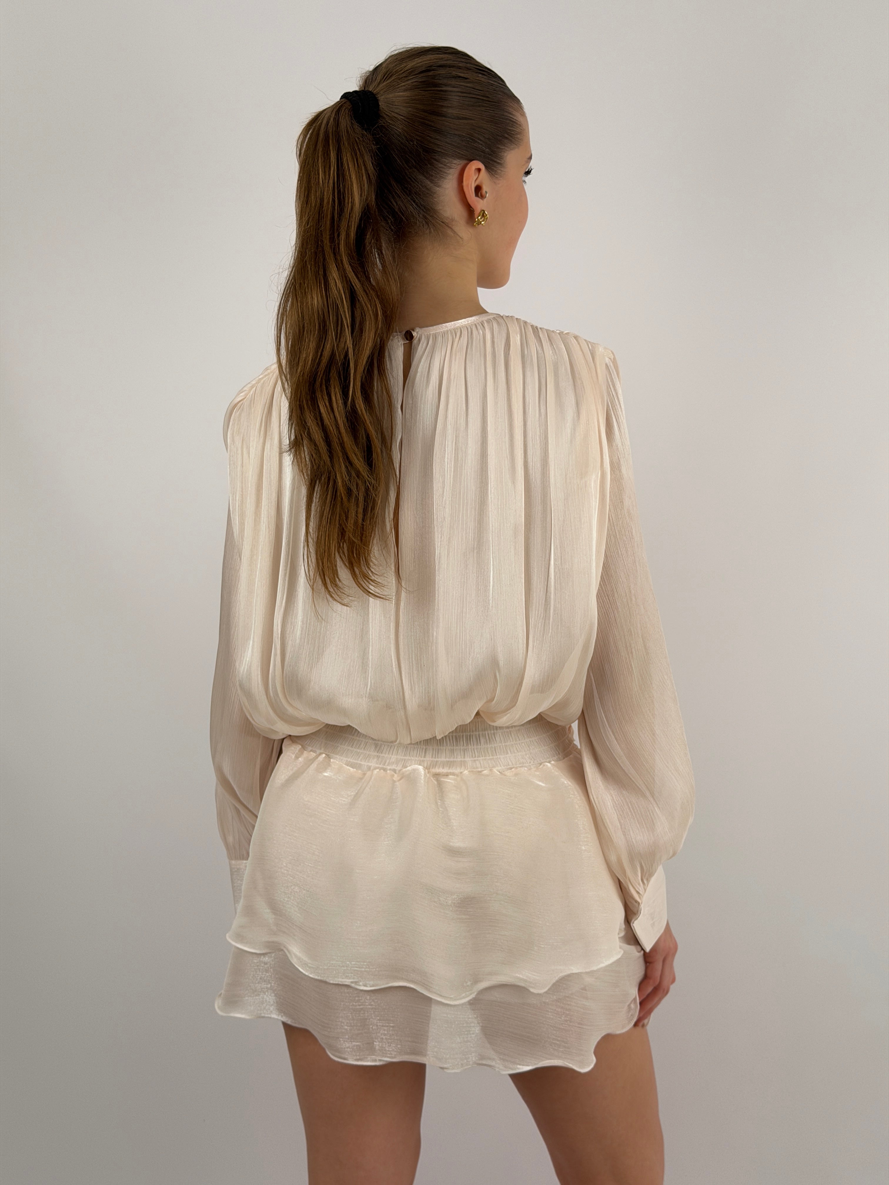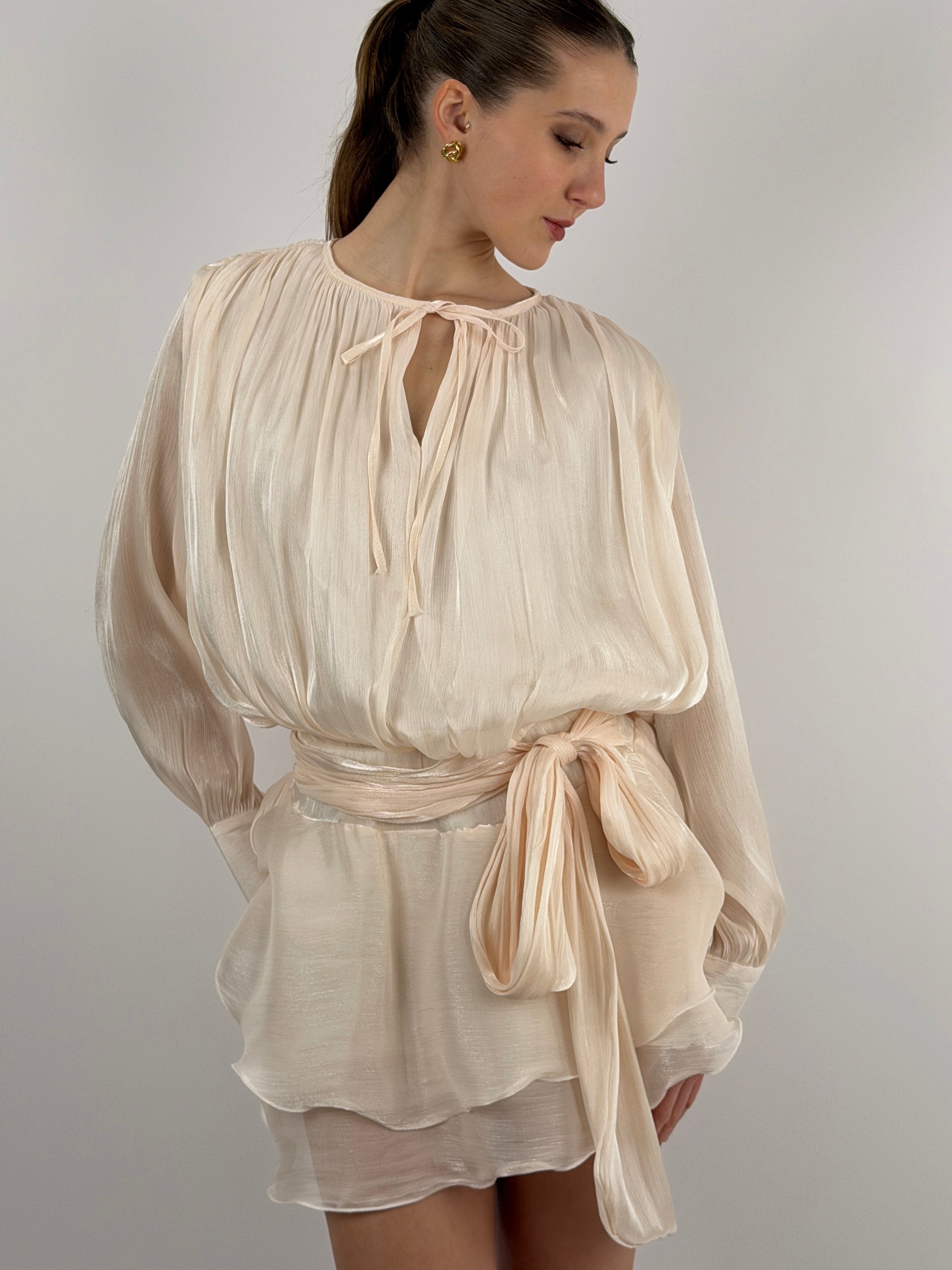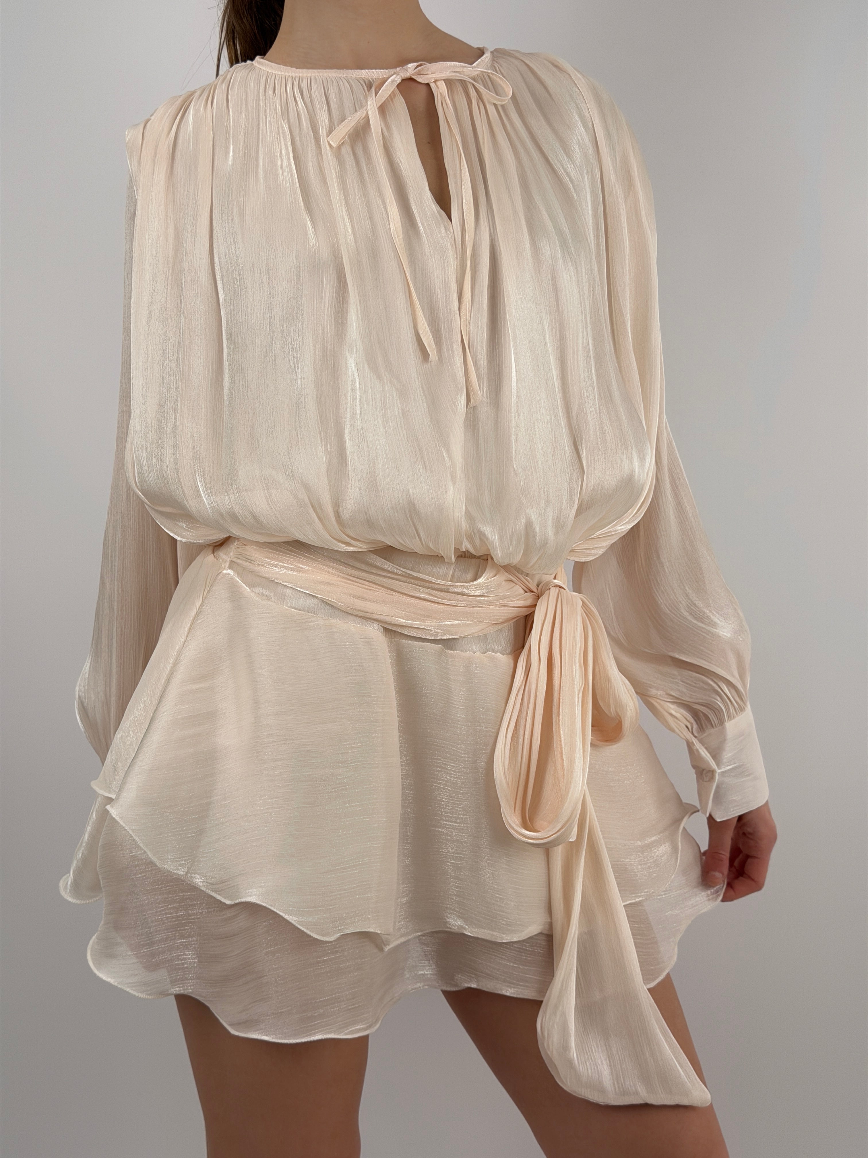 Abito corto in raso cipria con tessuto brillante, a maniche lunghe e girocollo con fiocco, elastico in vita con fusciacca e polsini con bottoni