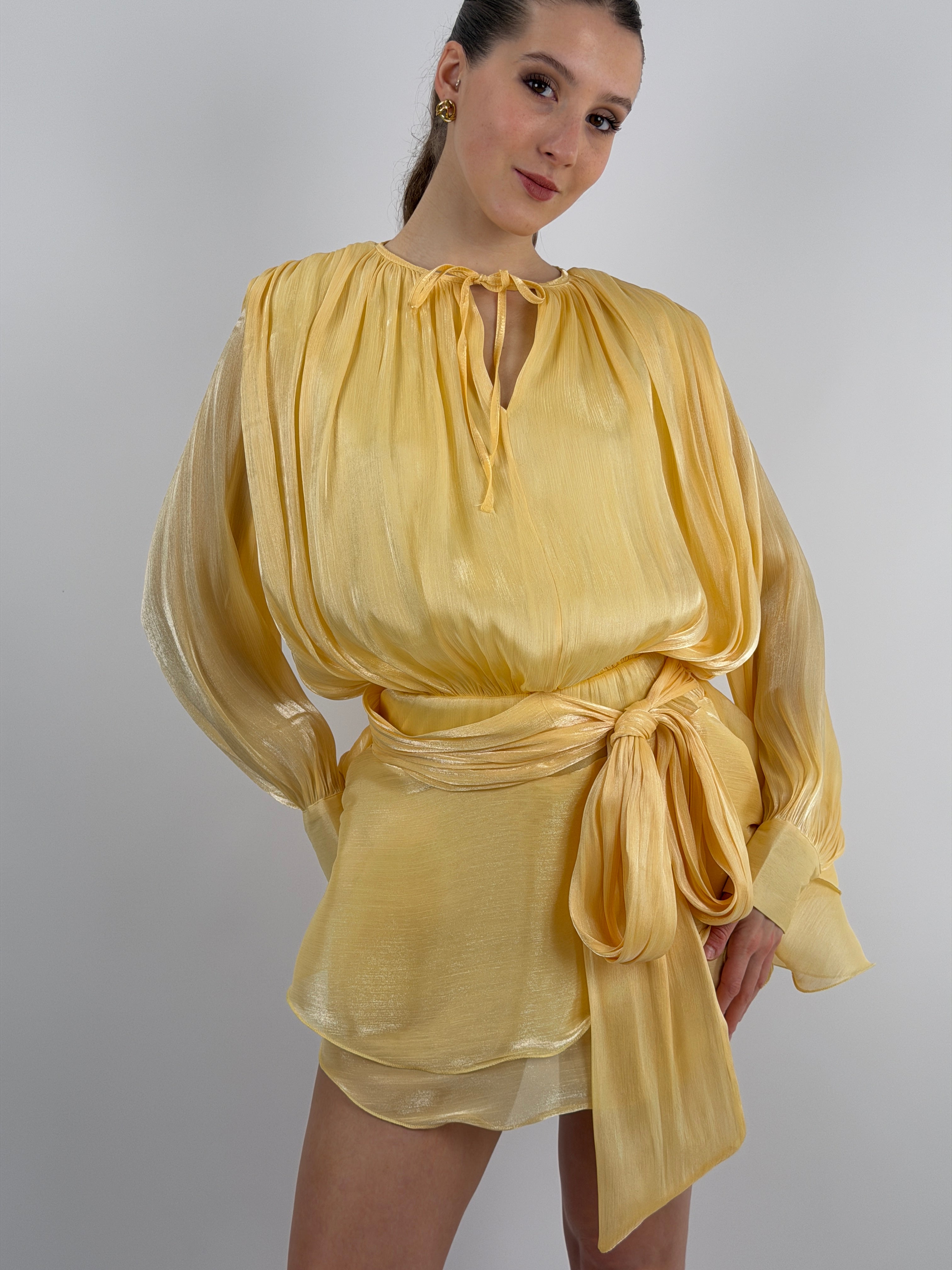 Abito corto in raso giallo con tessuto brillante, a maniche lunghe e girocollo con fiocco, elastico in vita con fusciacca e polsini con bottoni