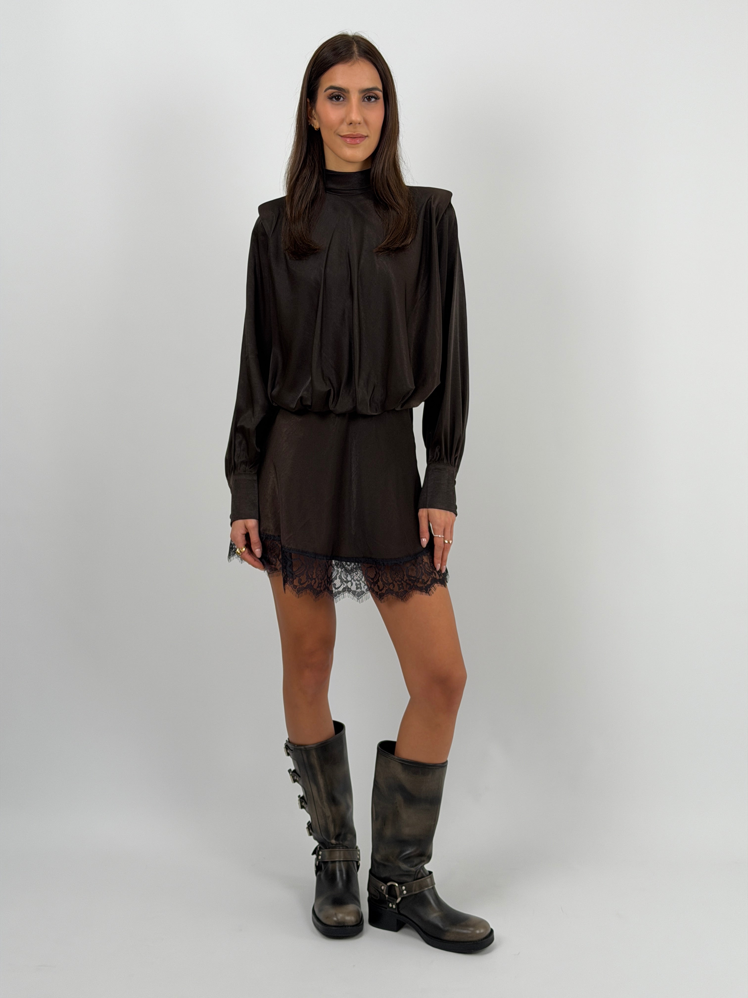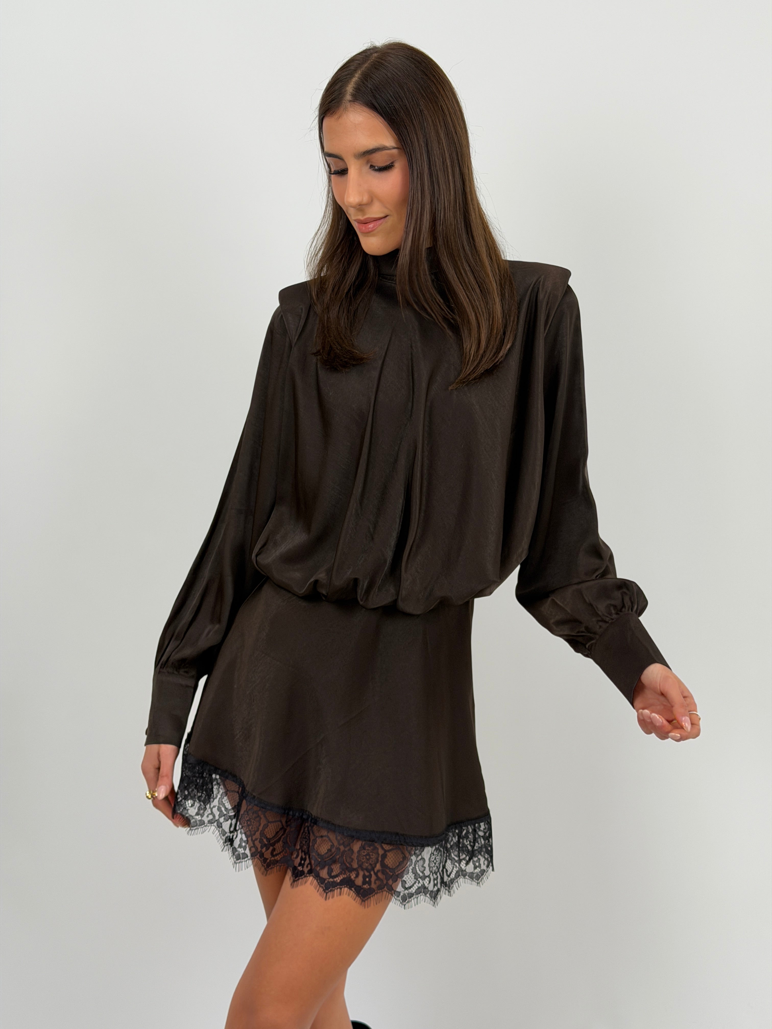 Abito Lumina corto in tessuto satinato marrone con spalline imbottite e bordo in pizzo. Elastico in vita e lacci a chiusura sul collo.