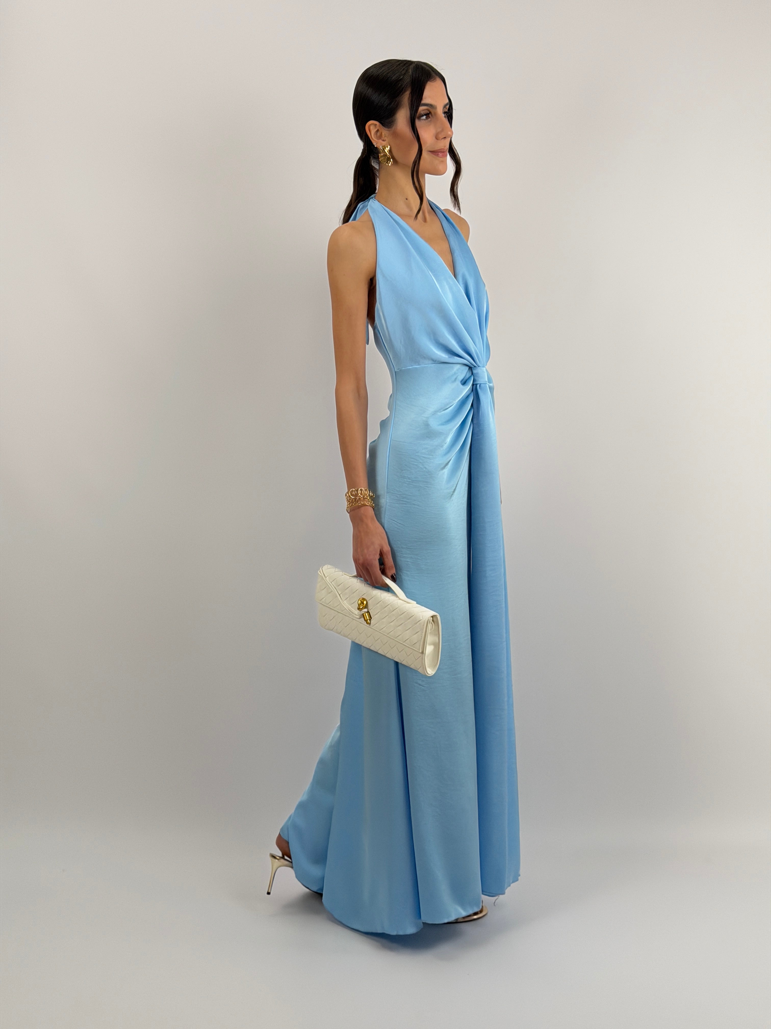Abito azzurro lungo fluido in tessuto satinato con scollo a V, allacciatura al collo, nodo frontale con drappeggio, arricciature sul retro e chiusura laterale con zip