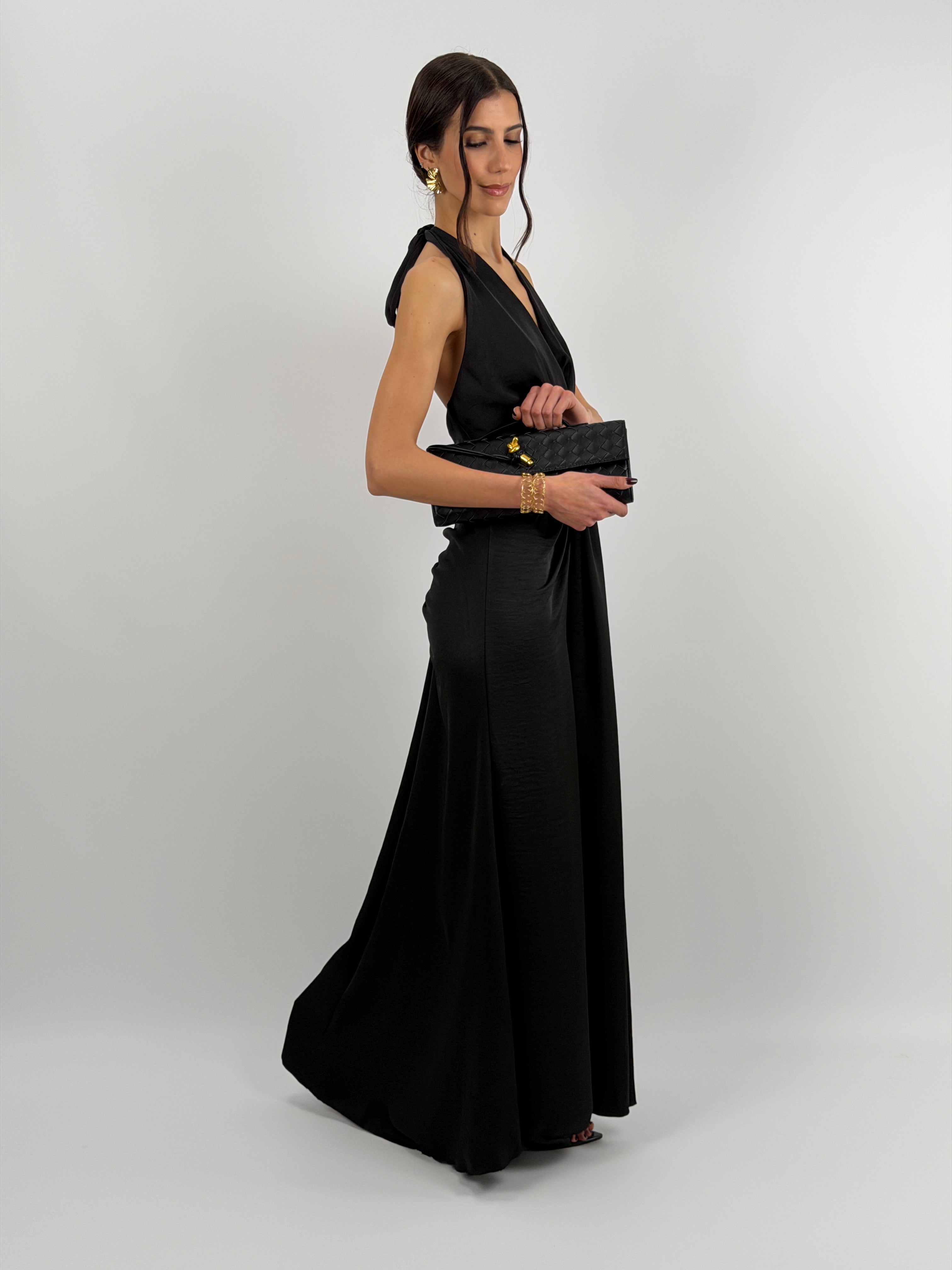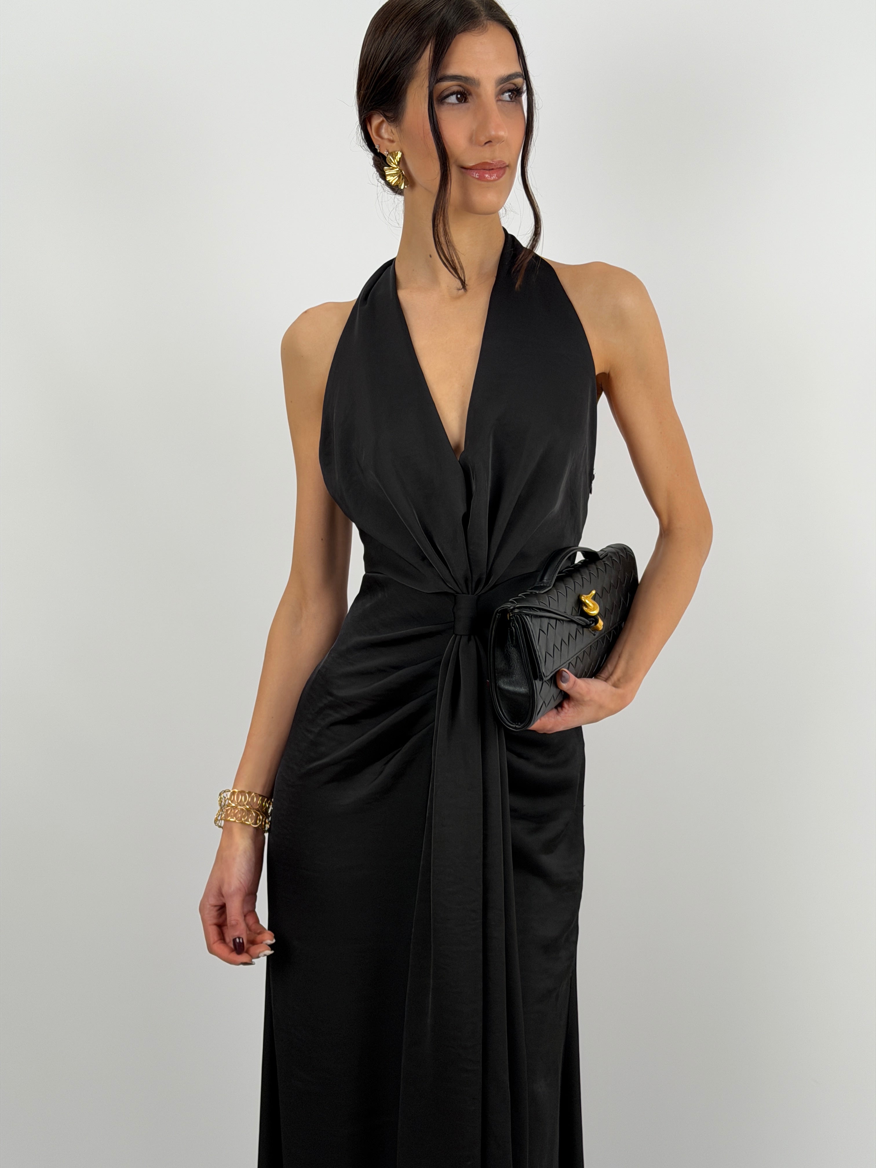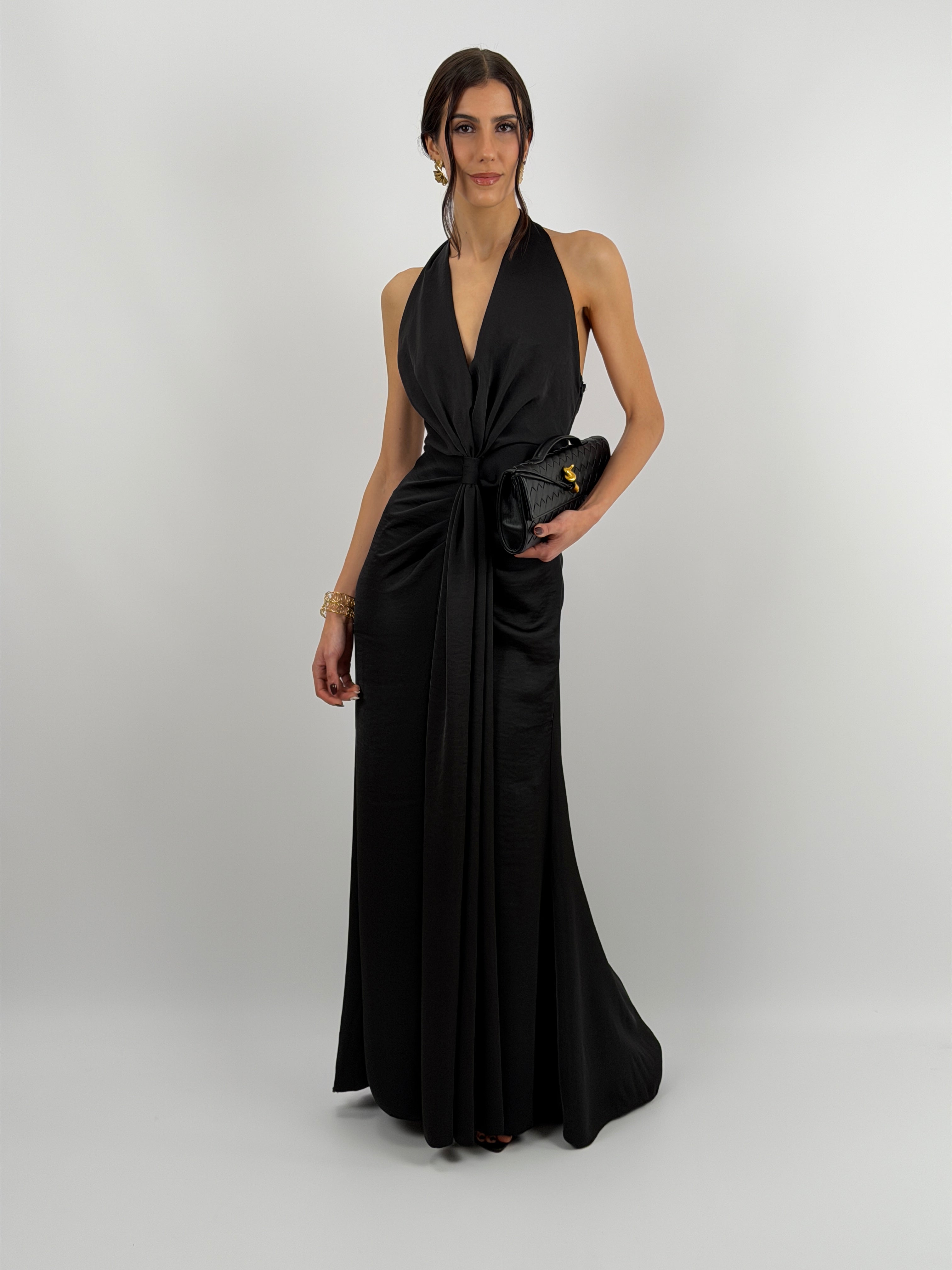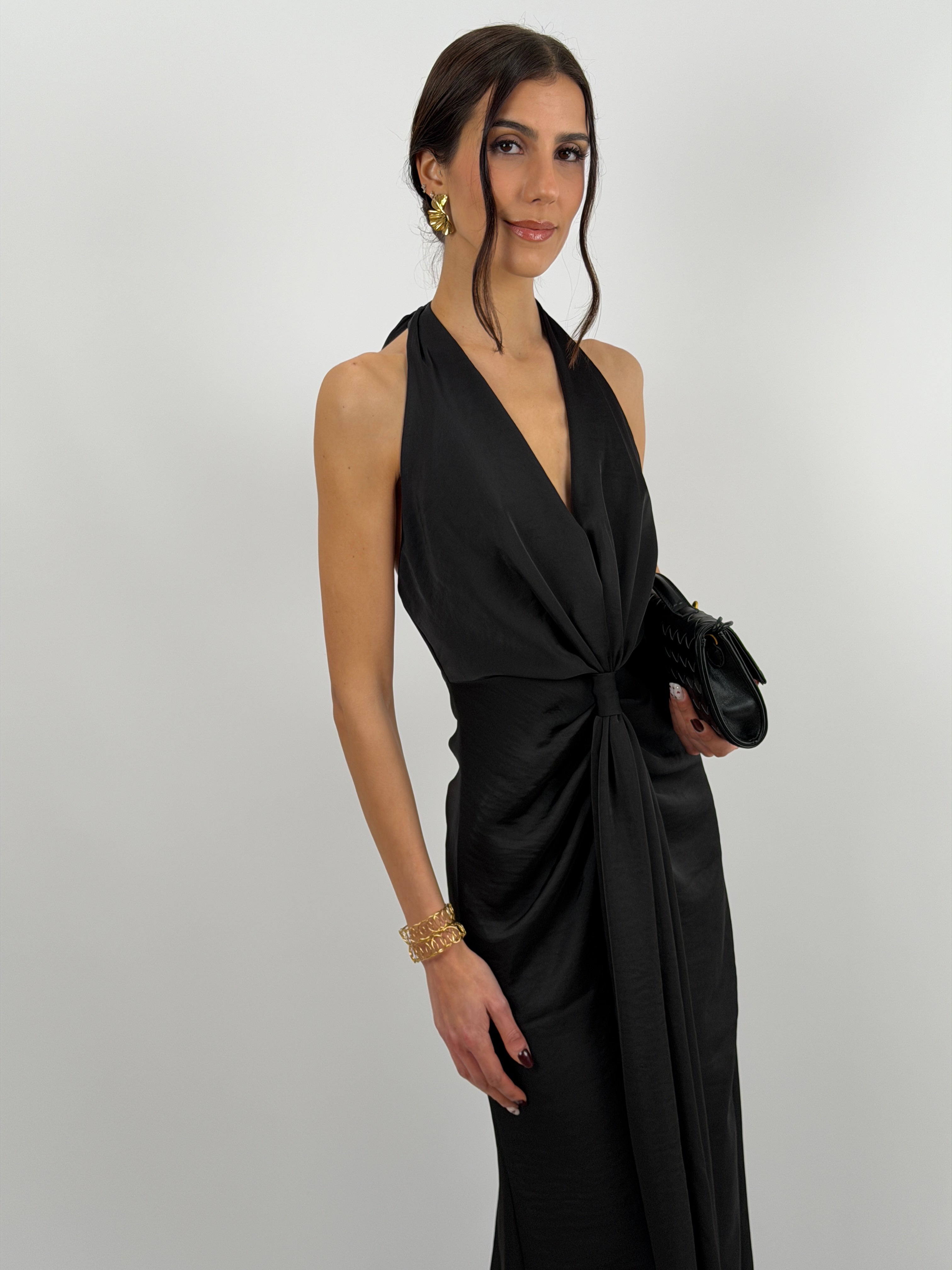 Abito nero lungo fluido in tessuto satinato con scollo a V, allacciatura al collo, nodo frontale con drappeggio, arricciature sul retro e chiusura laterale con zip