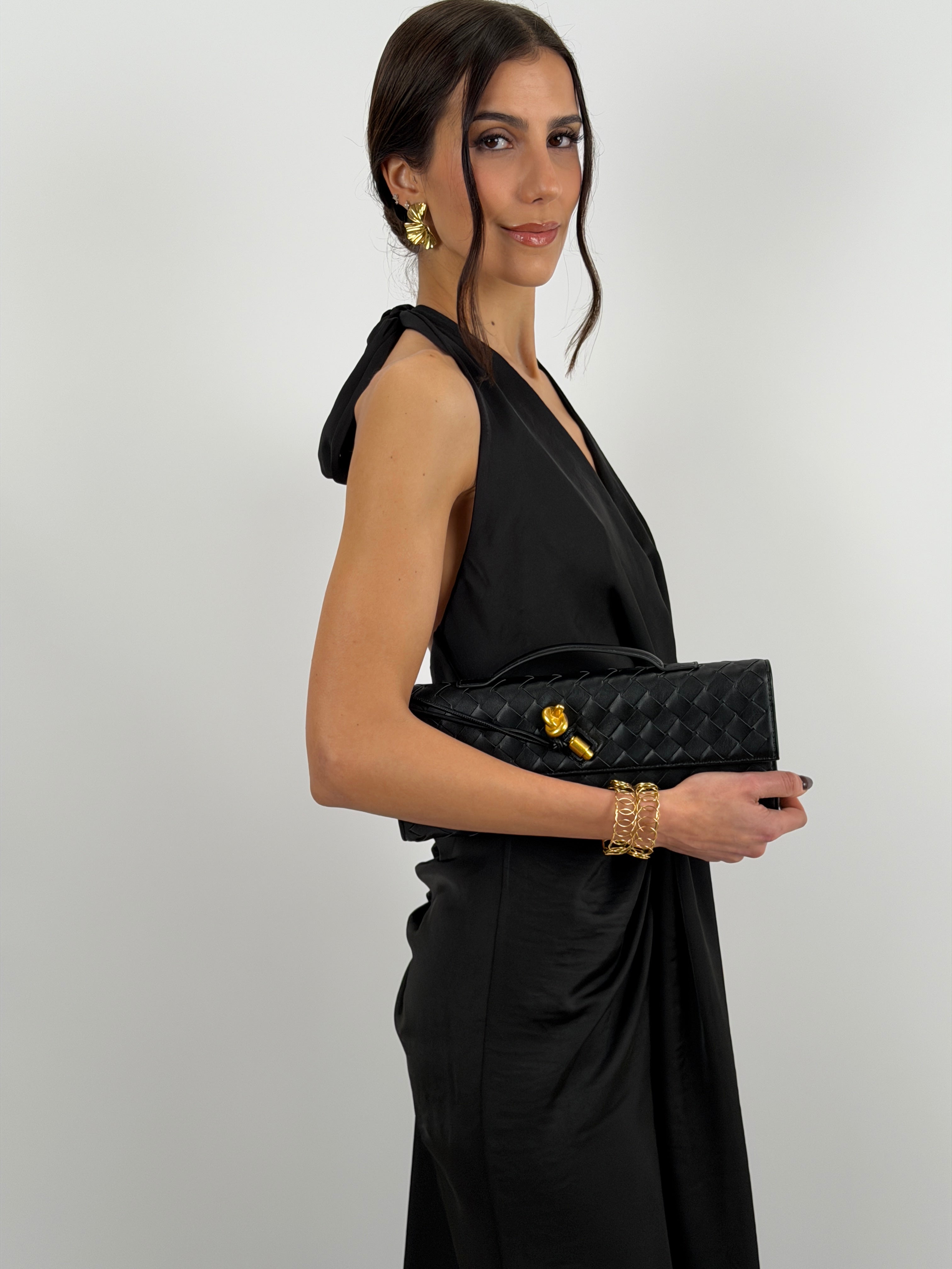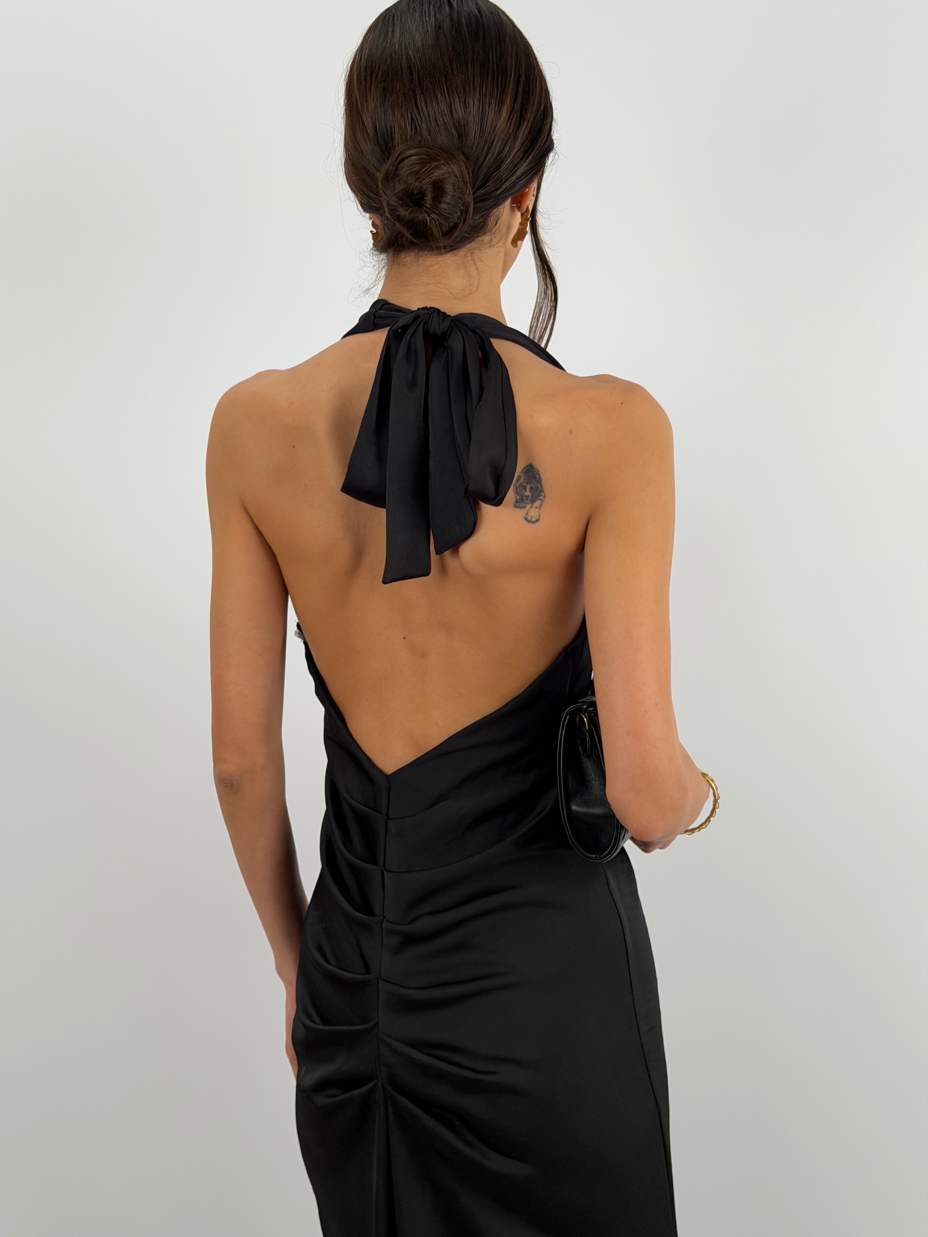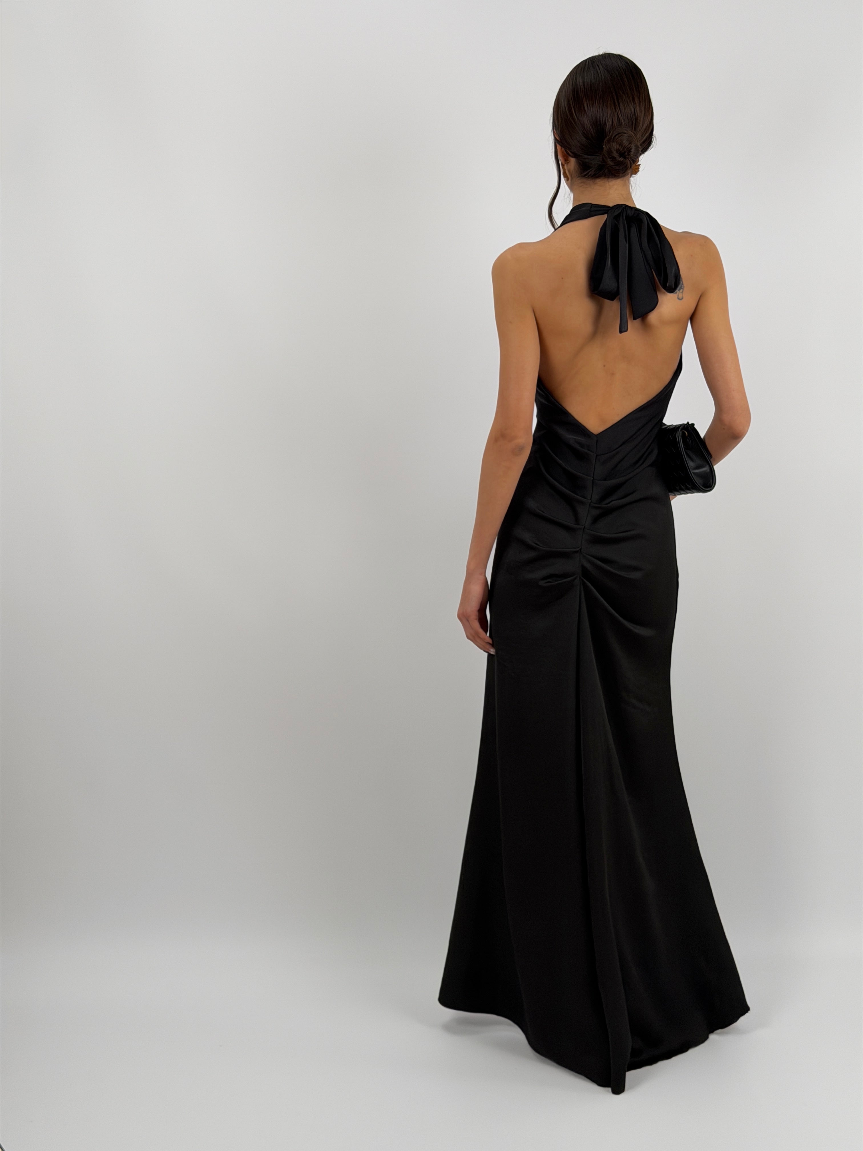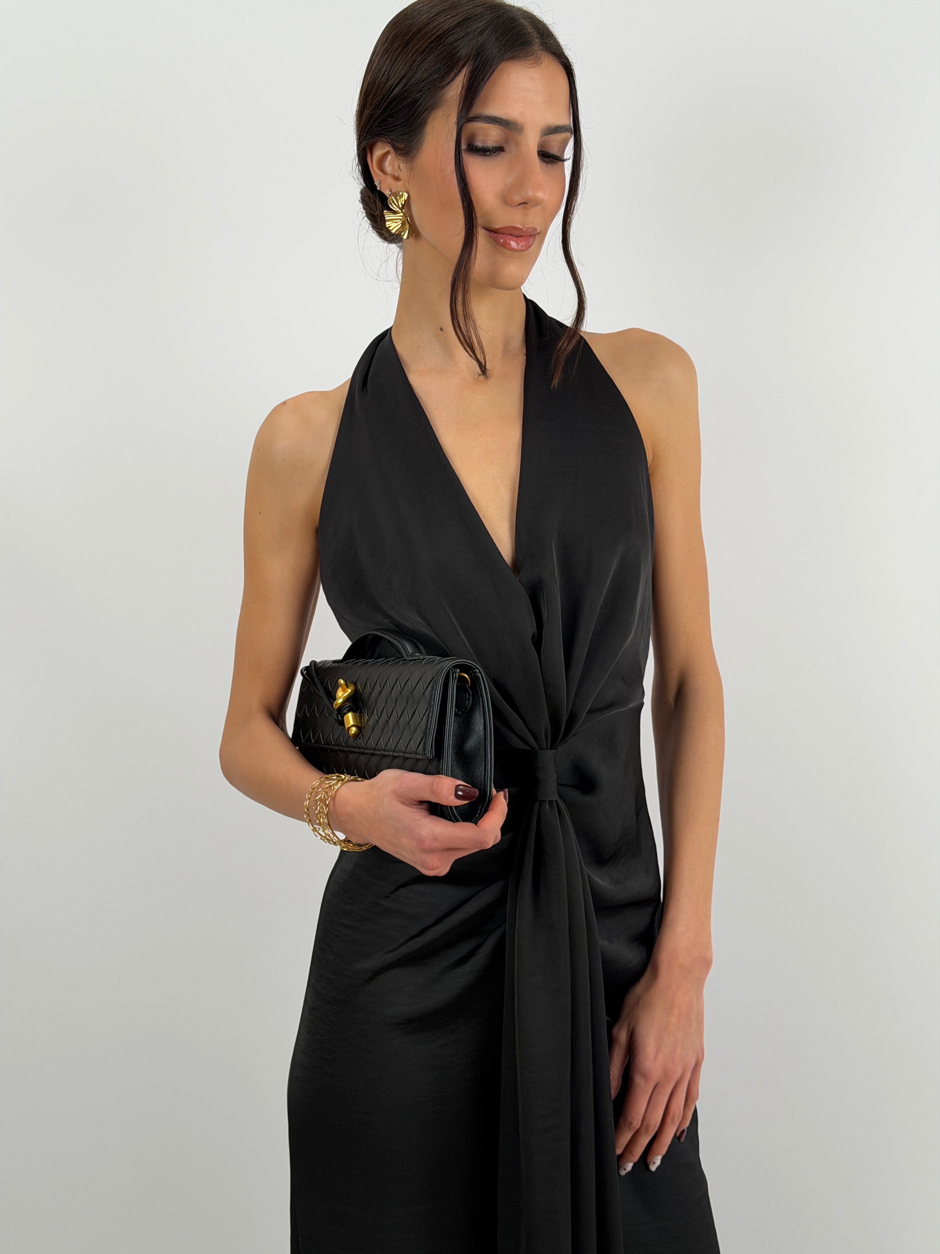 Abito nero lungo fluido in tessuto satinato con scollo a V, allacciatura al collo, nodo frontale con drappeggio, arricciature sul retro e chiusura laterale con zip