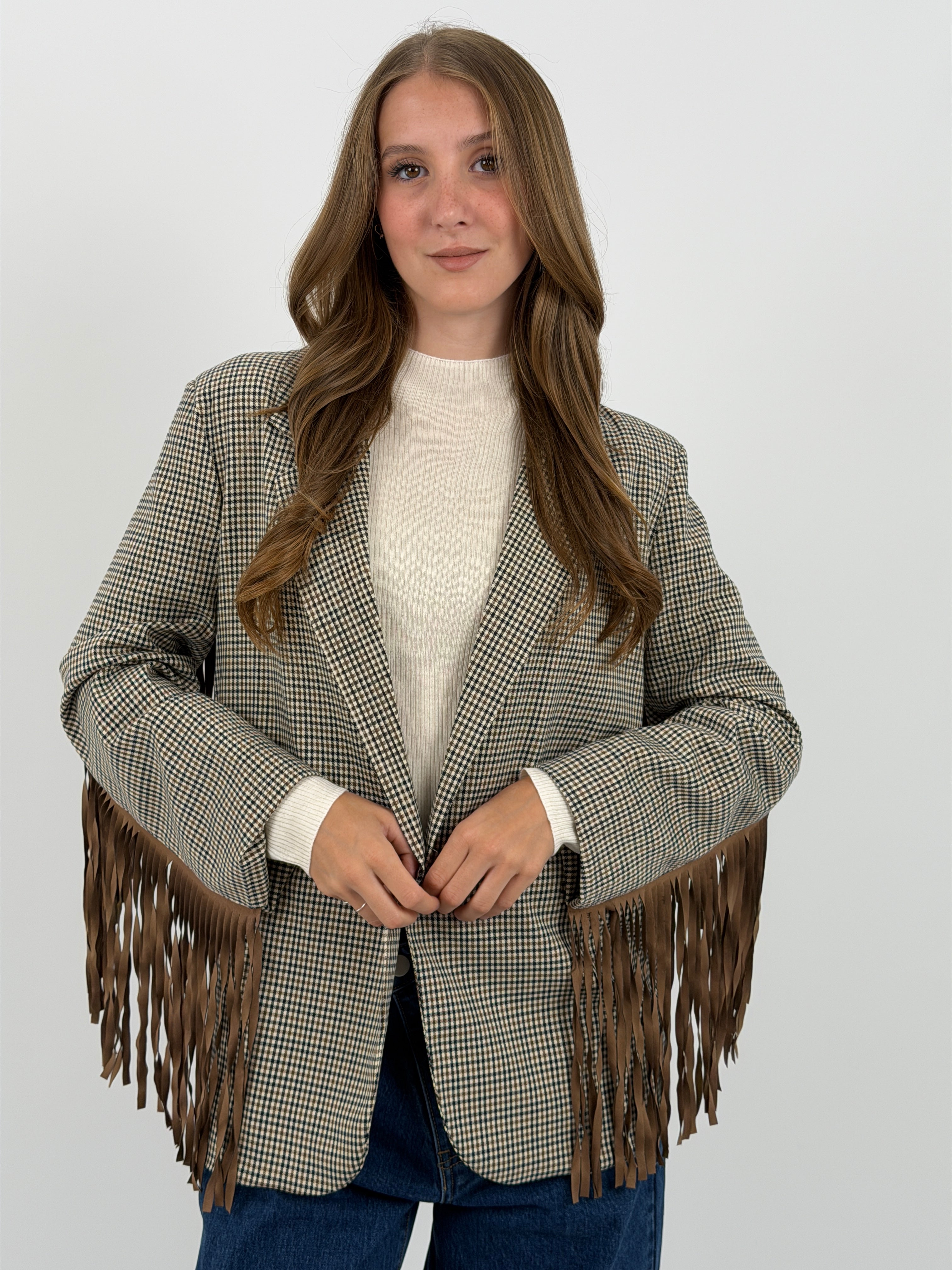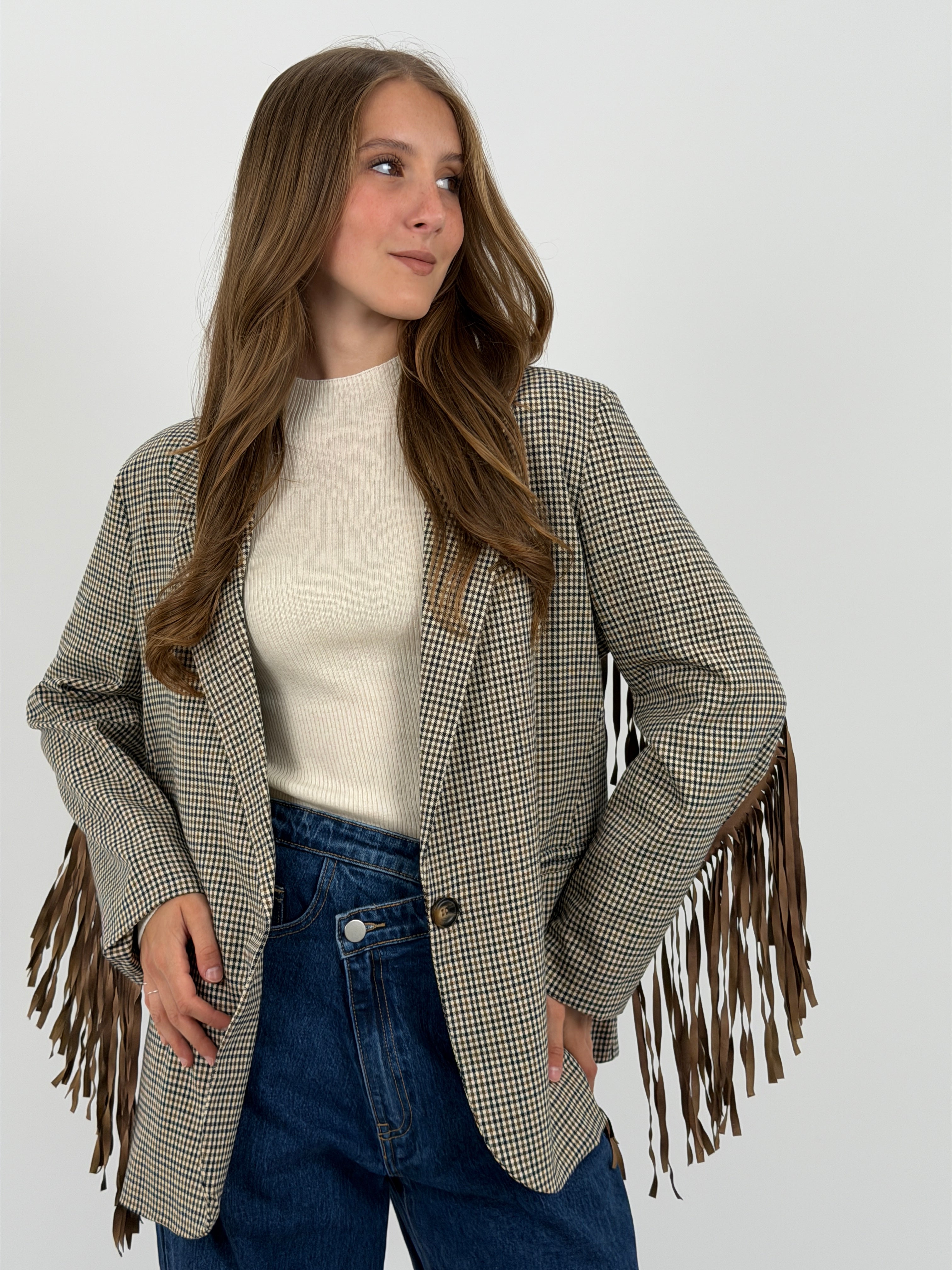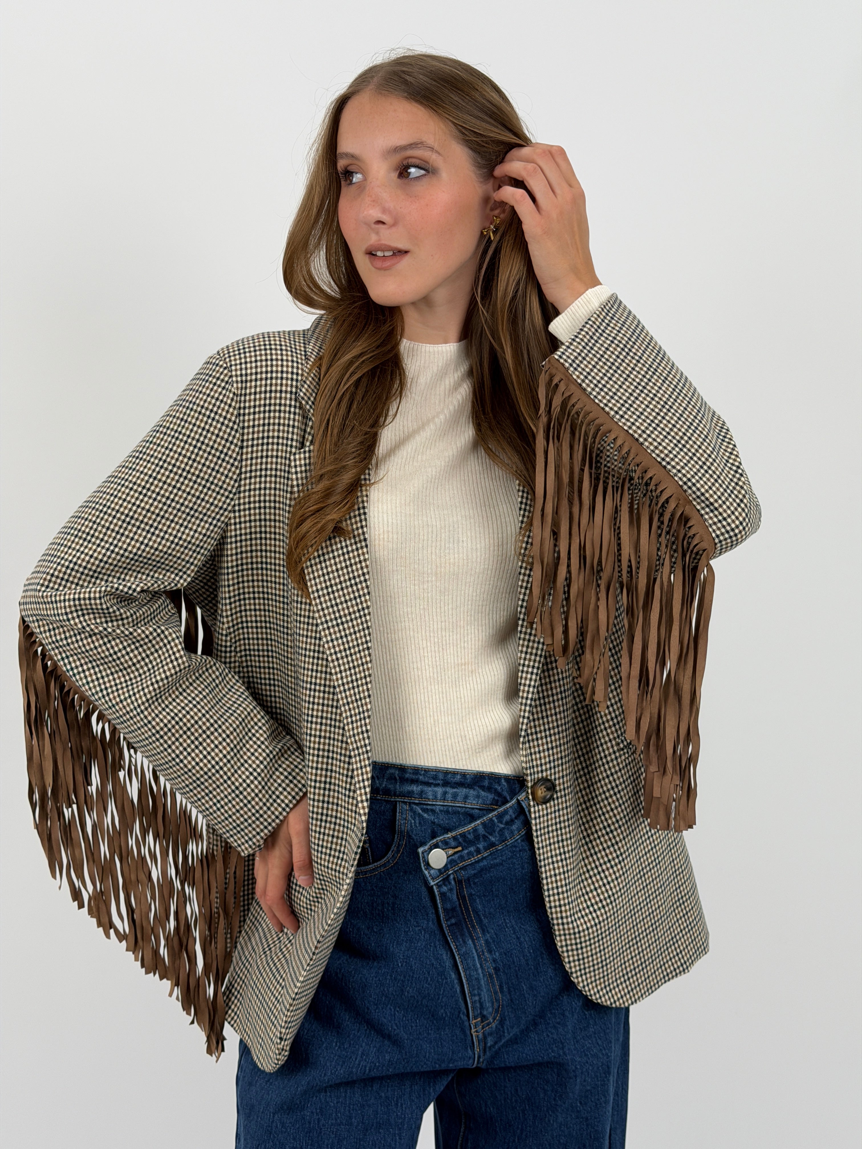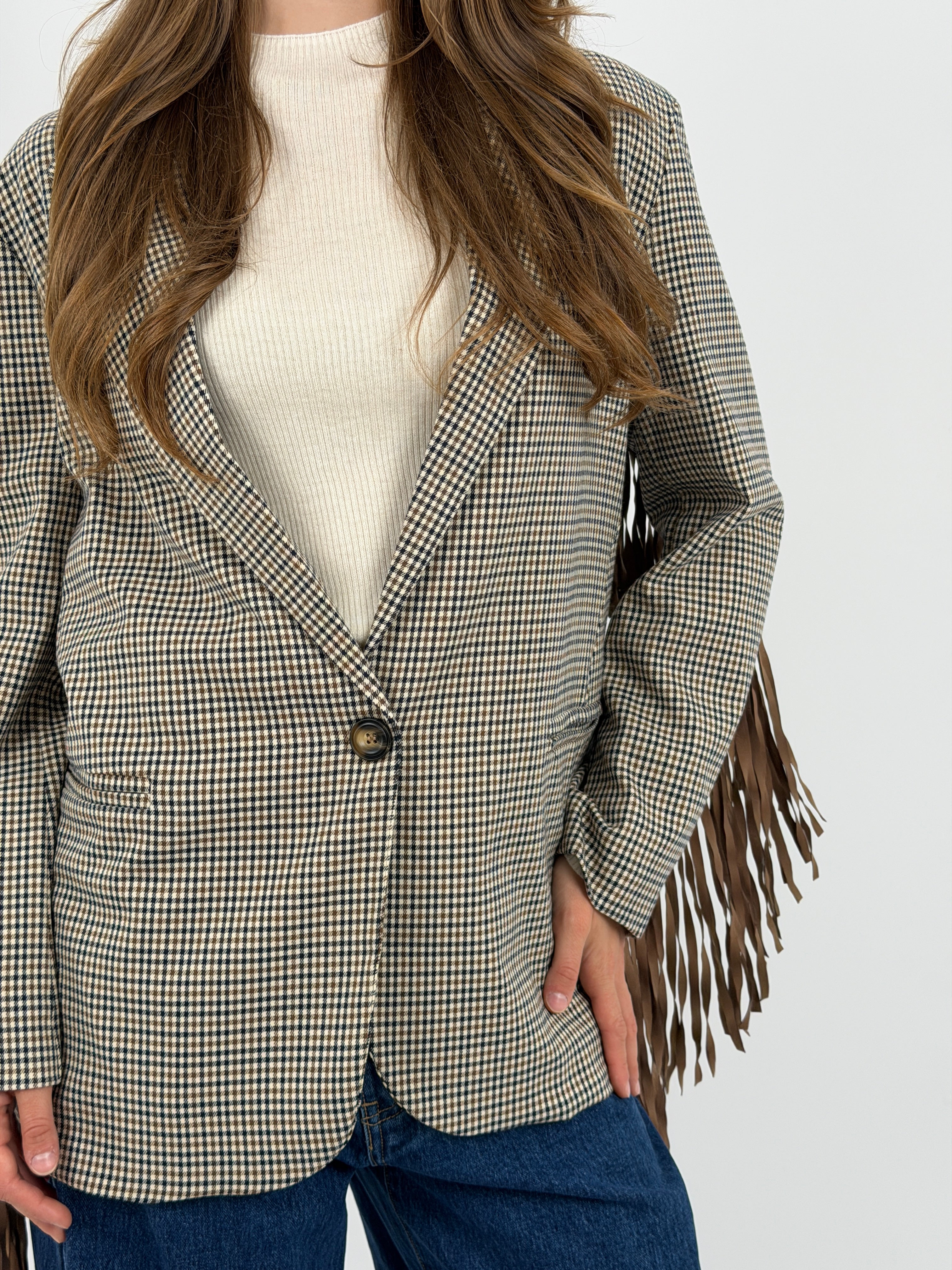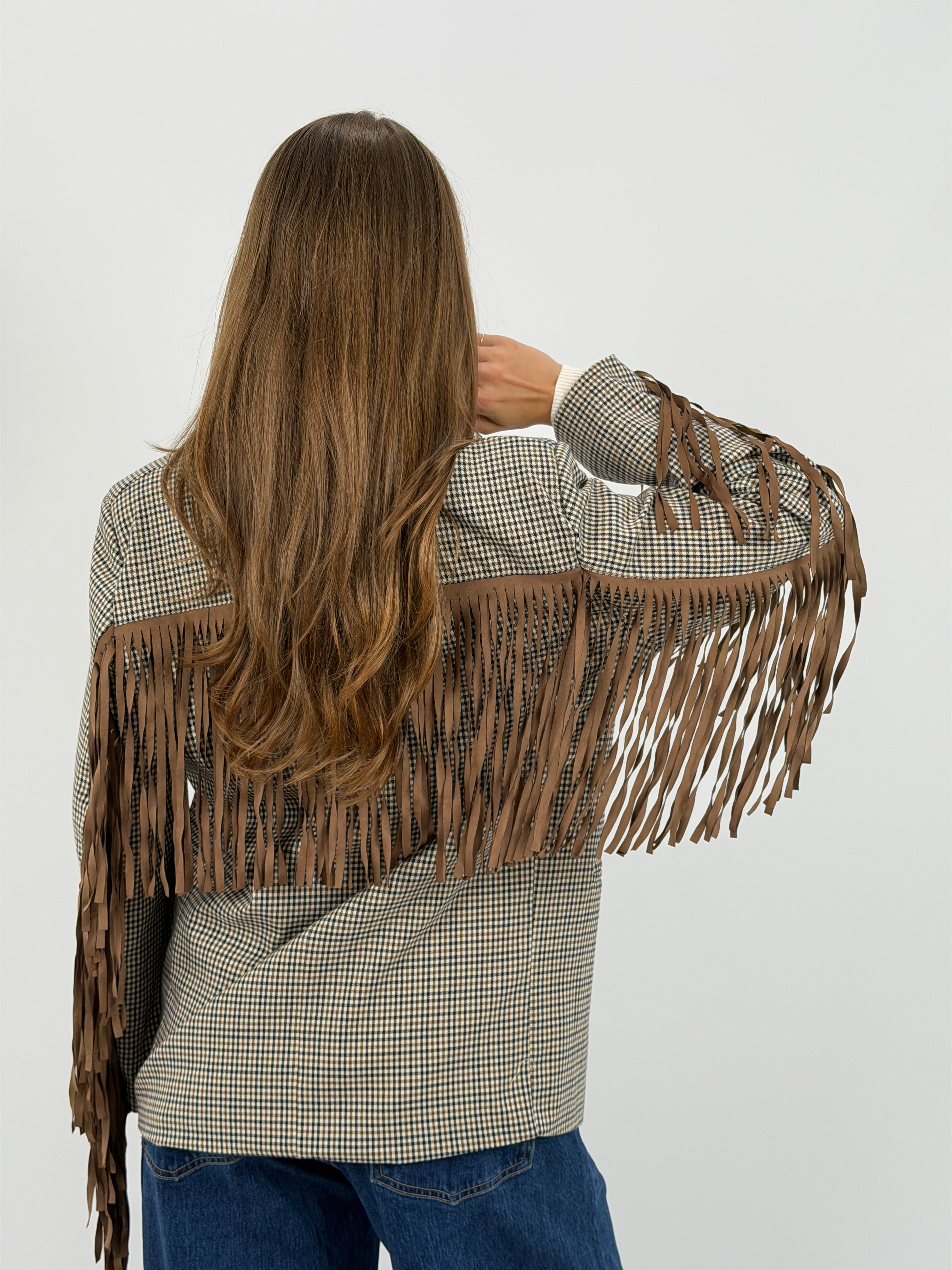 Giacca monopetto a quadretti sui toni del marrone e del blu, con fodera interna e frange sul retro.