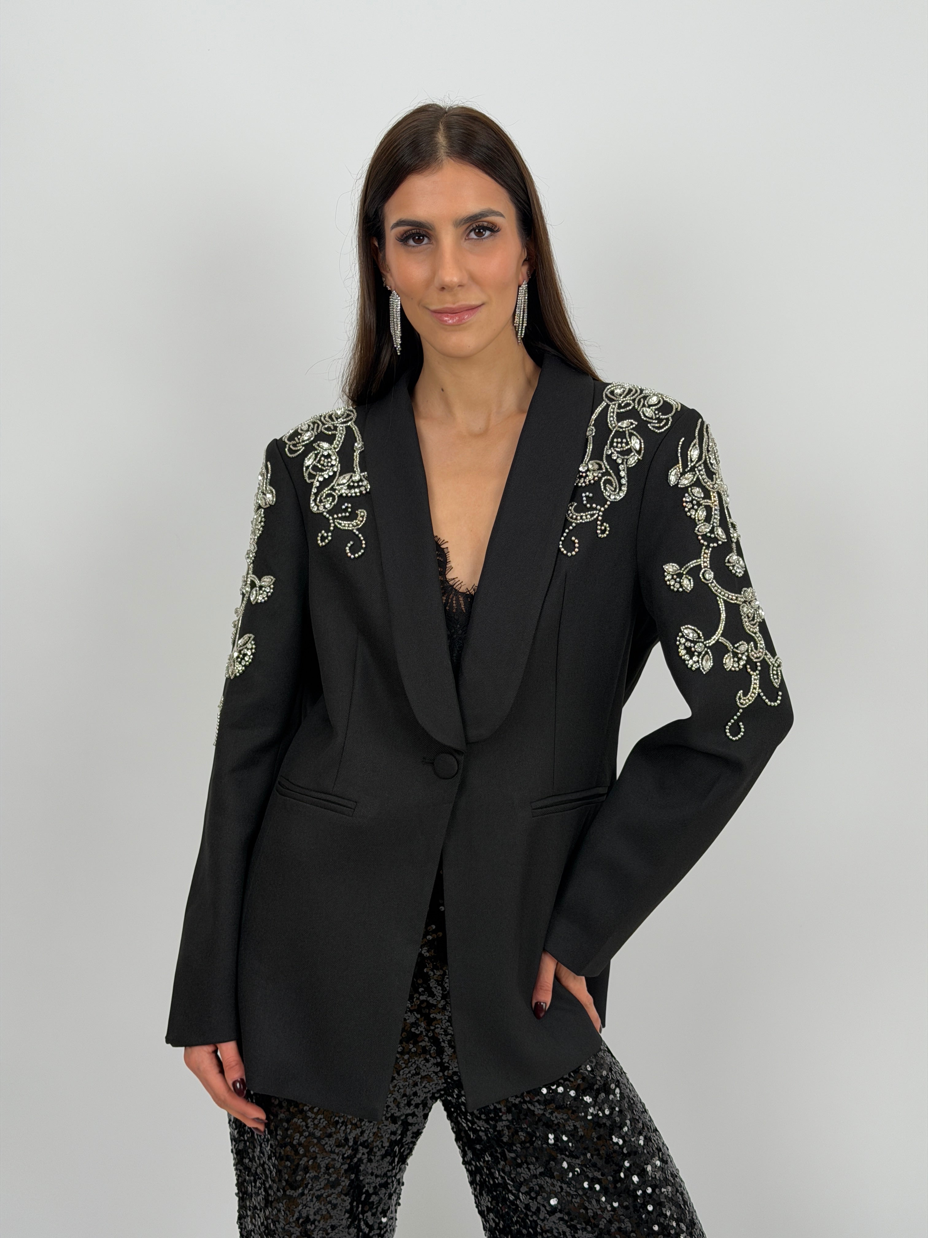 Giacca monopetto nera con bottone singolo e applicazioni gioiello con strass e perline