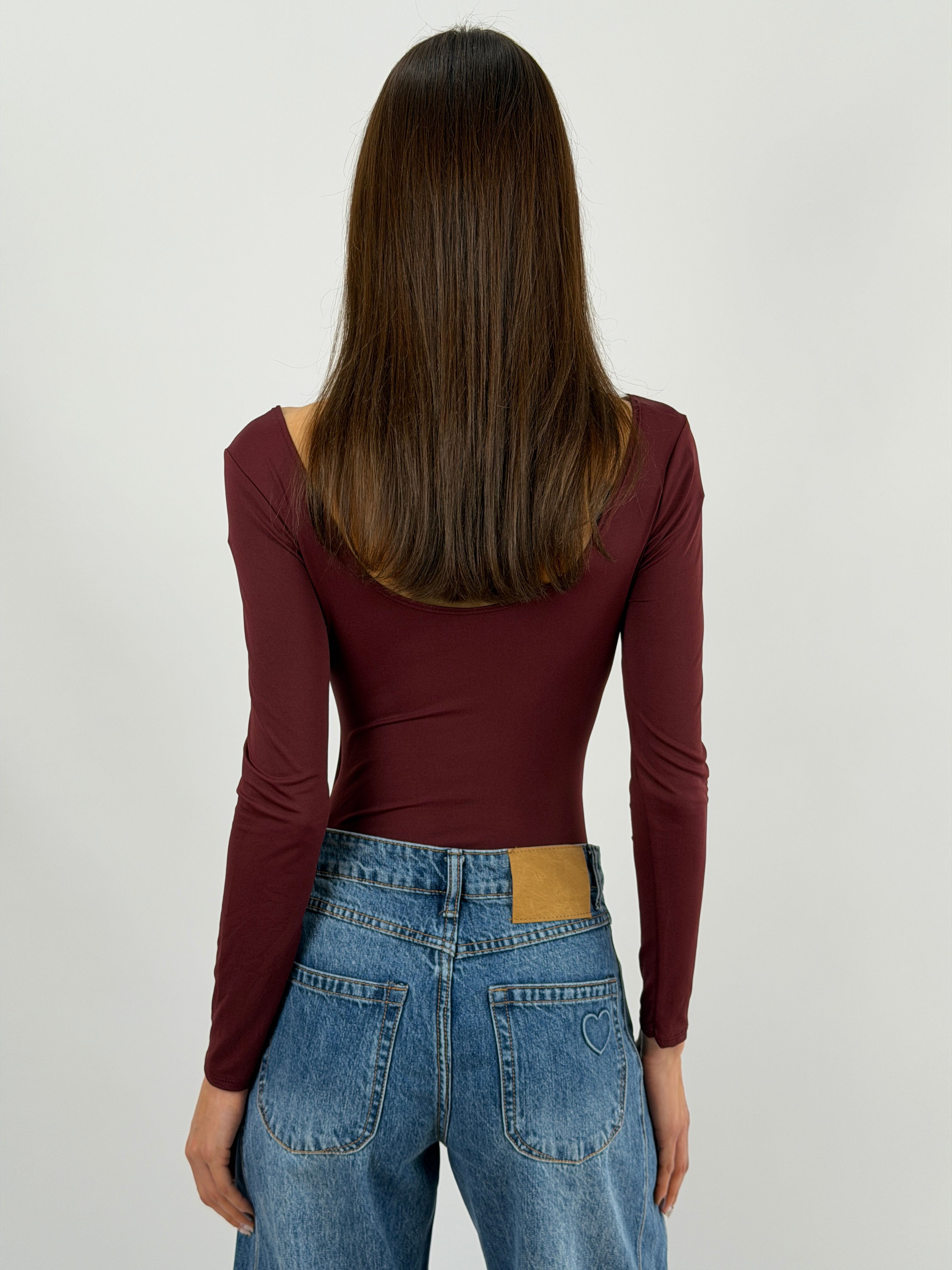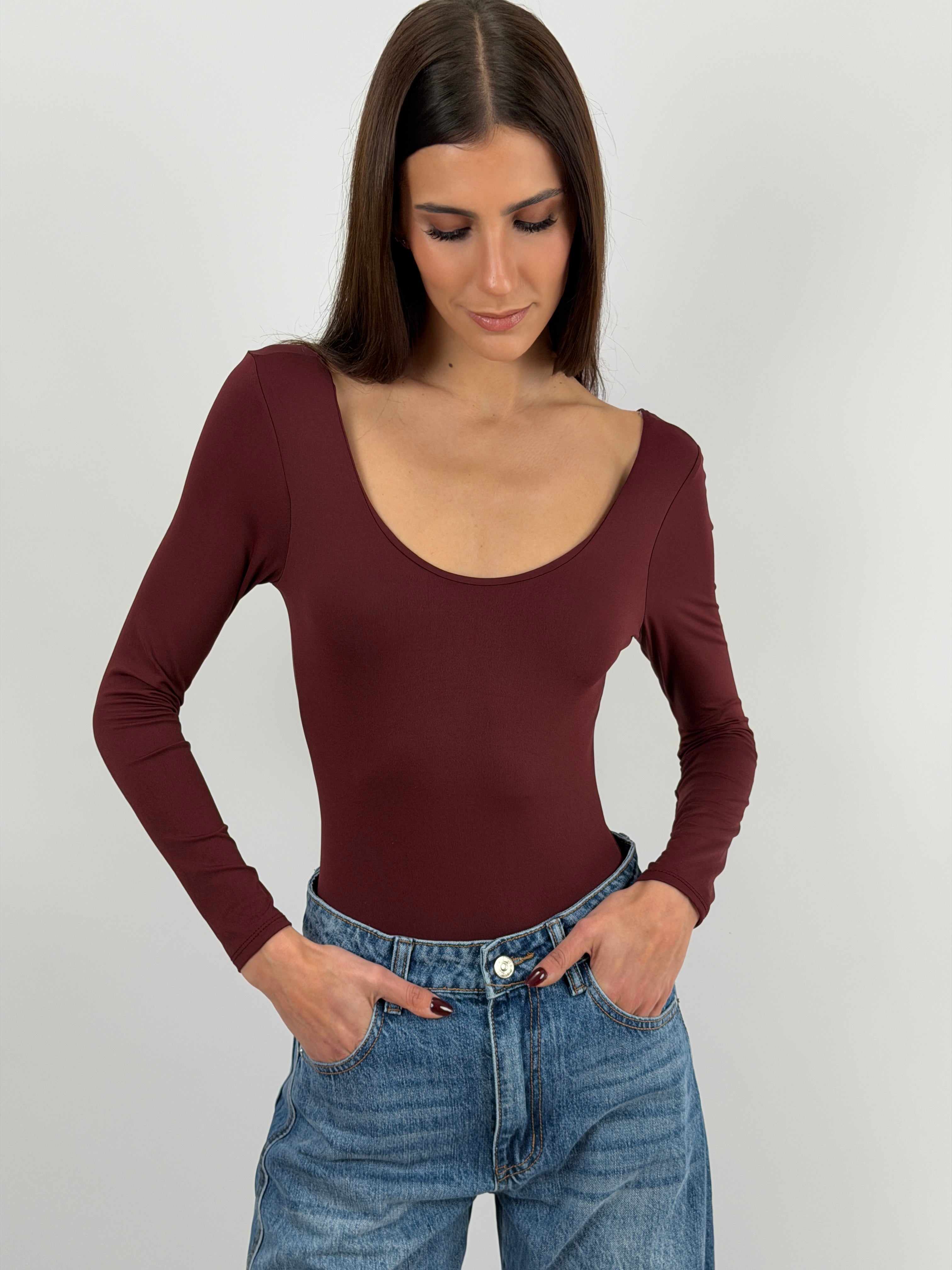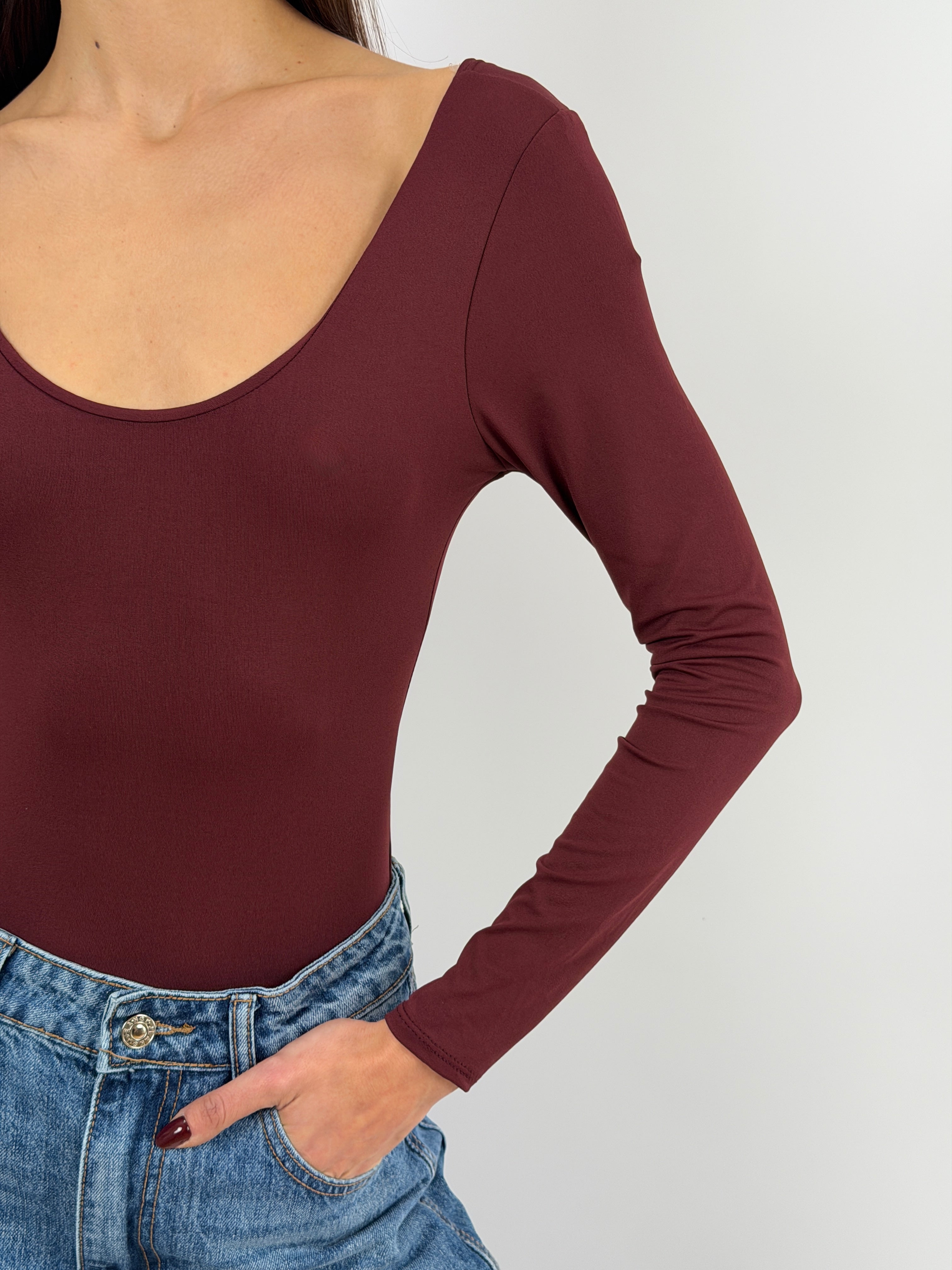 Body skim bordeaux a manica lunga, scollo tondo davanti e dietro, tessuto elasticizzato.