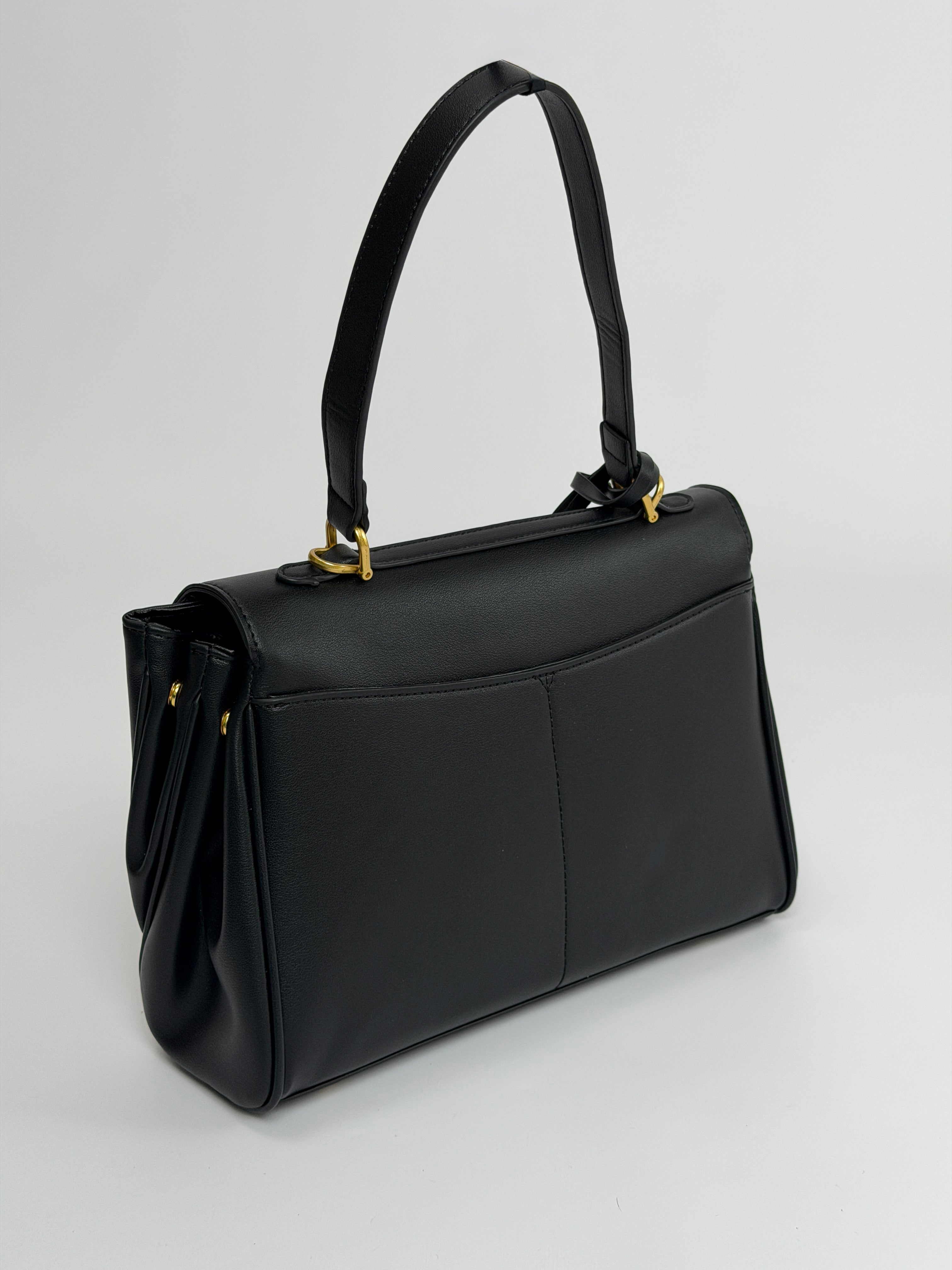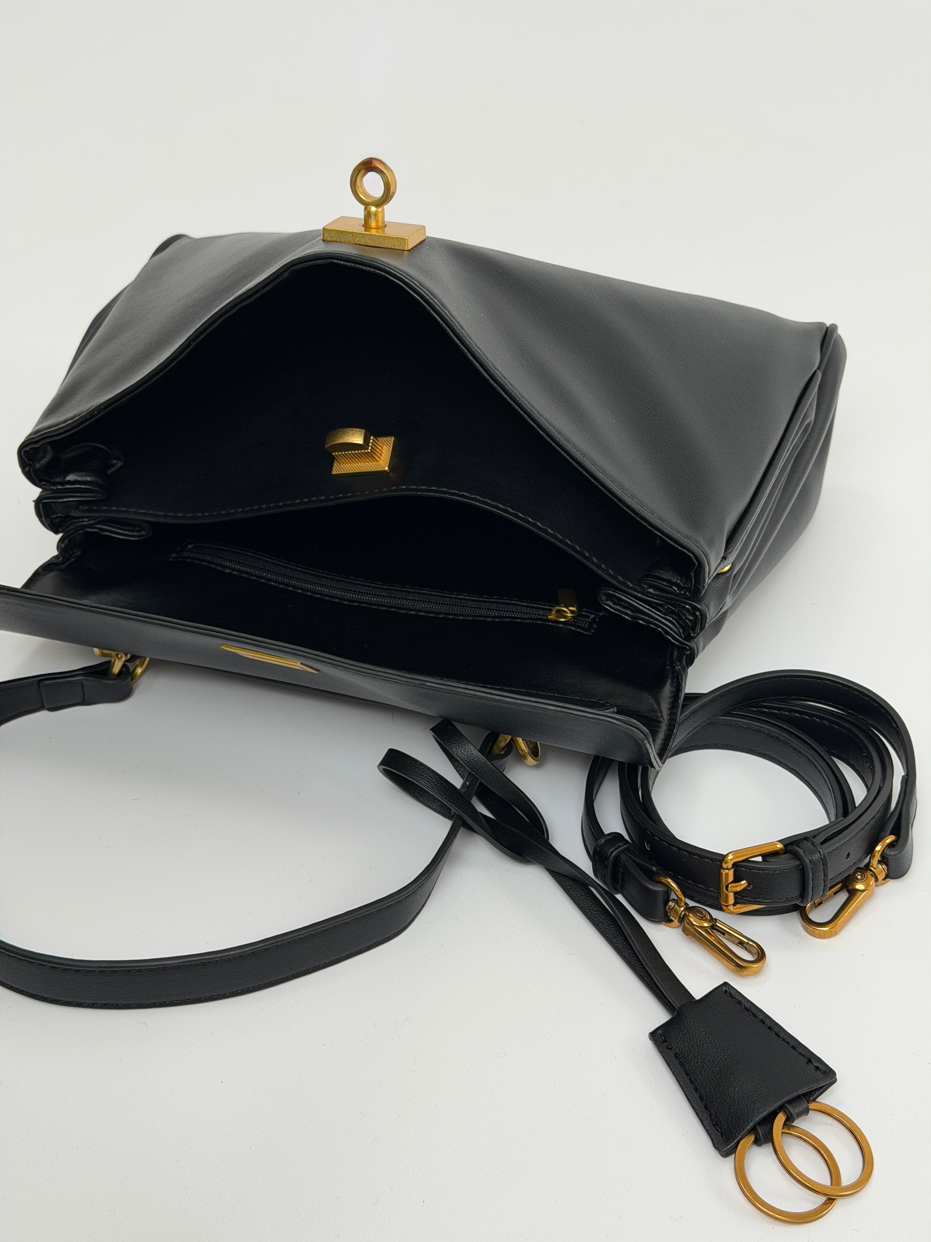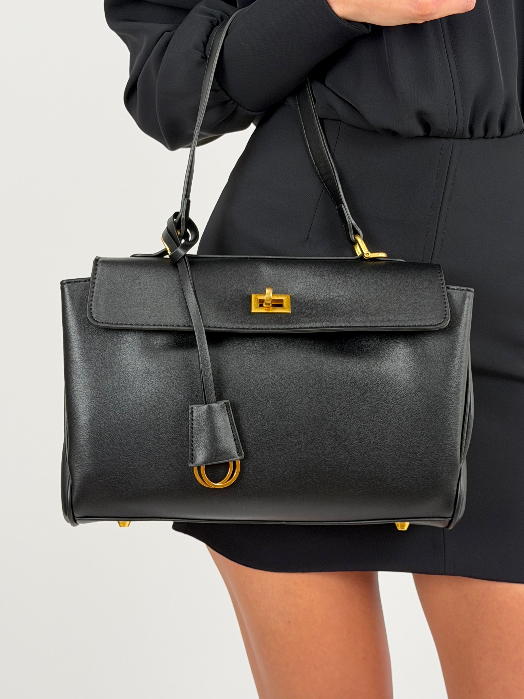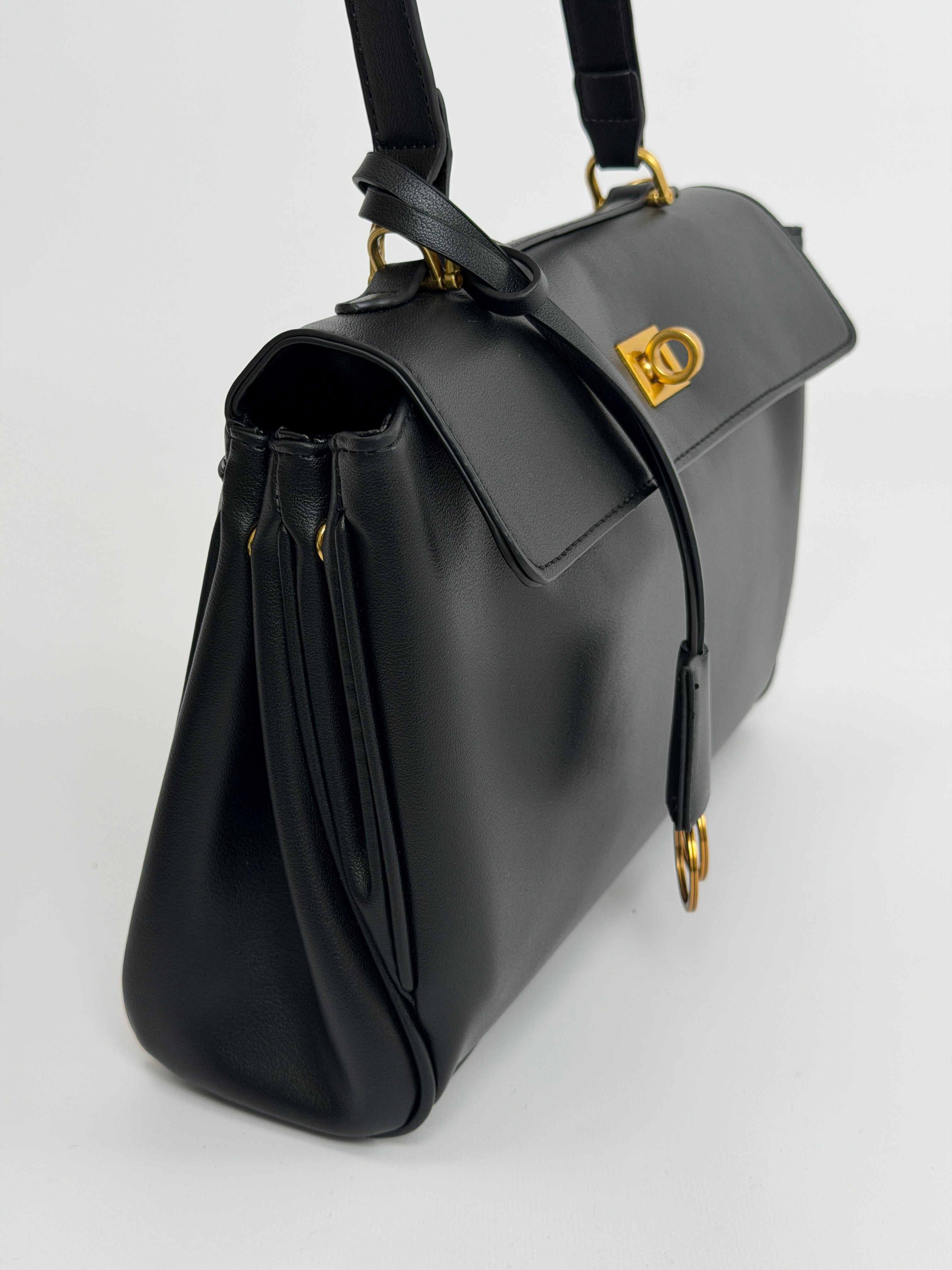 Borsa nera in pelle vegana con doppio scomparto con chiusura, manico e tracolla rimovibile. Tasca interna con zip, due tasche piatte sul retro. Spessore espandibile tramite bottoncini a pressione sui lati.