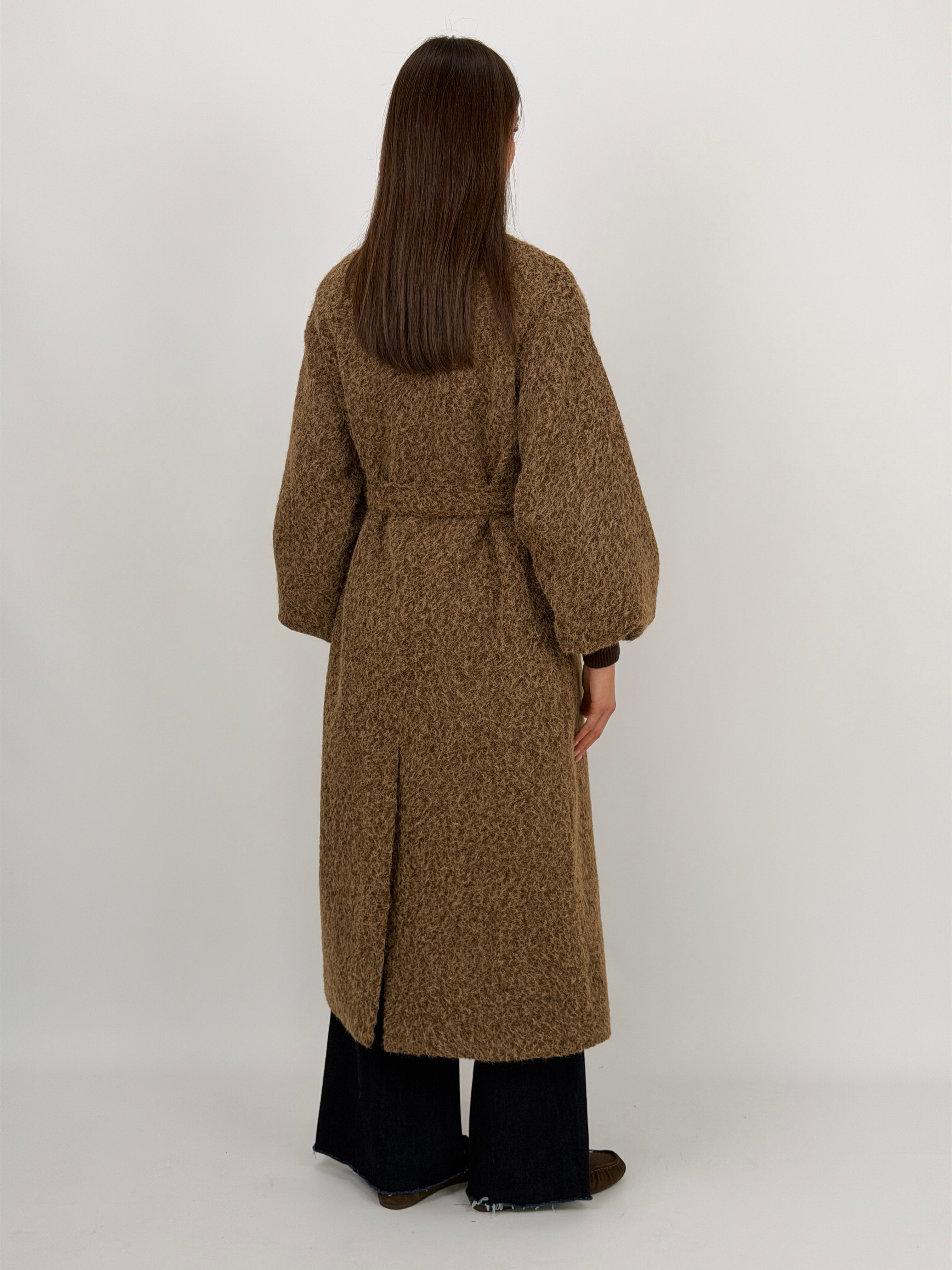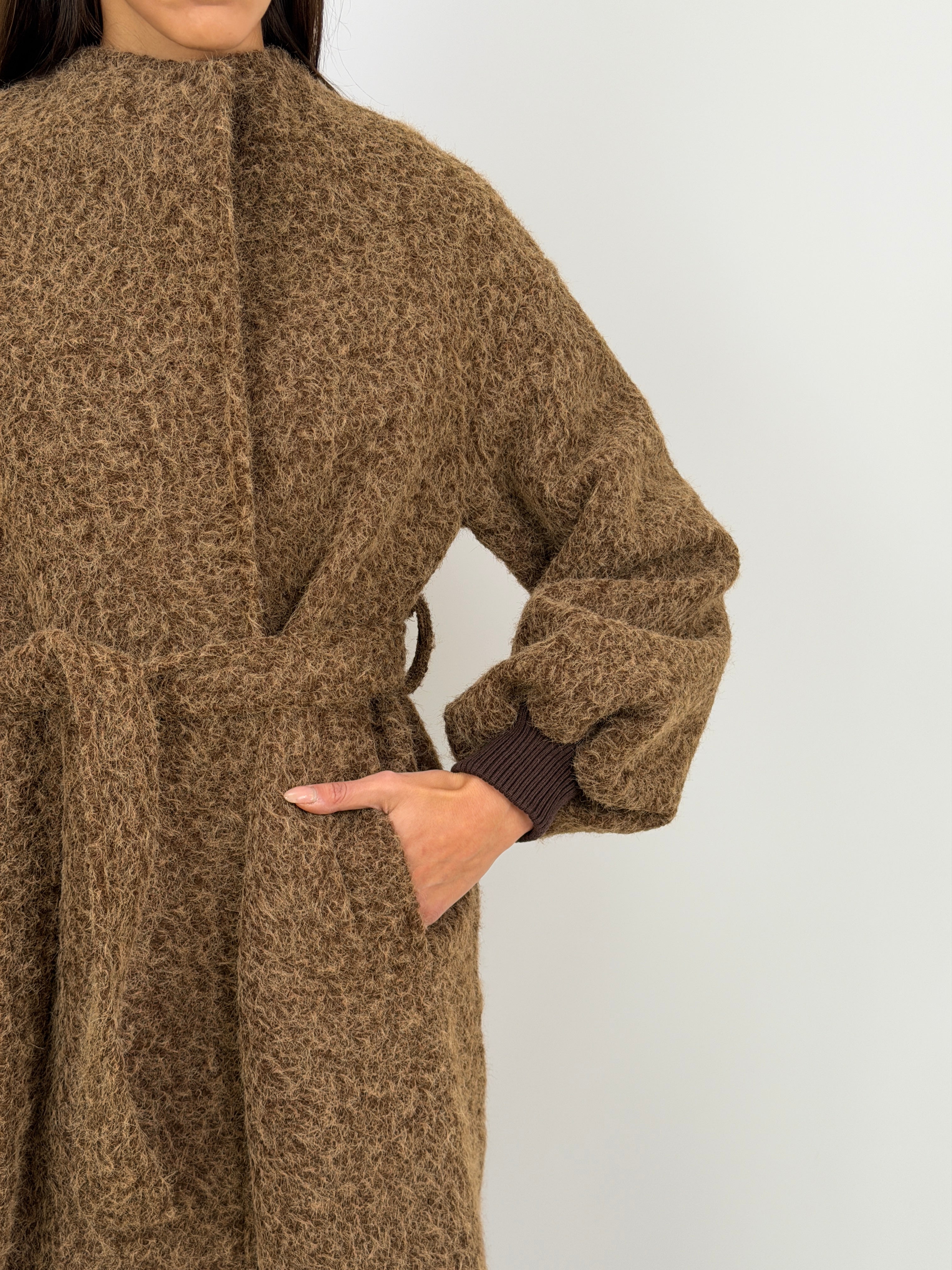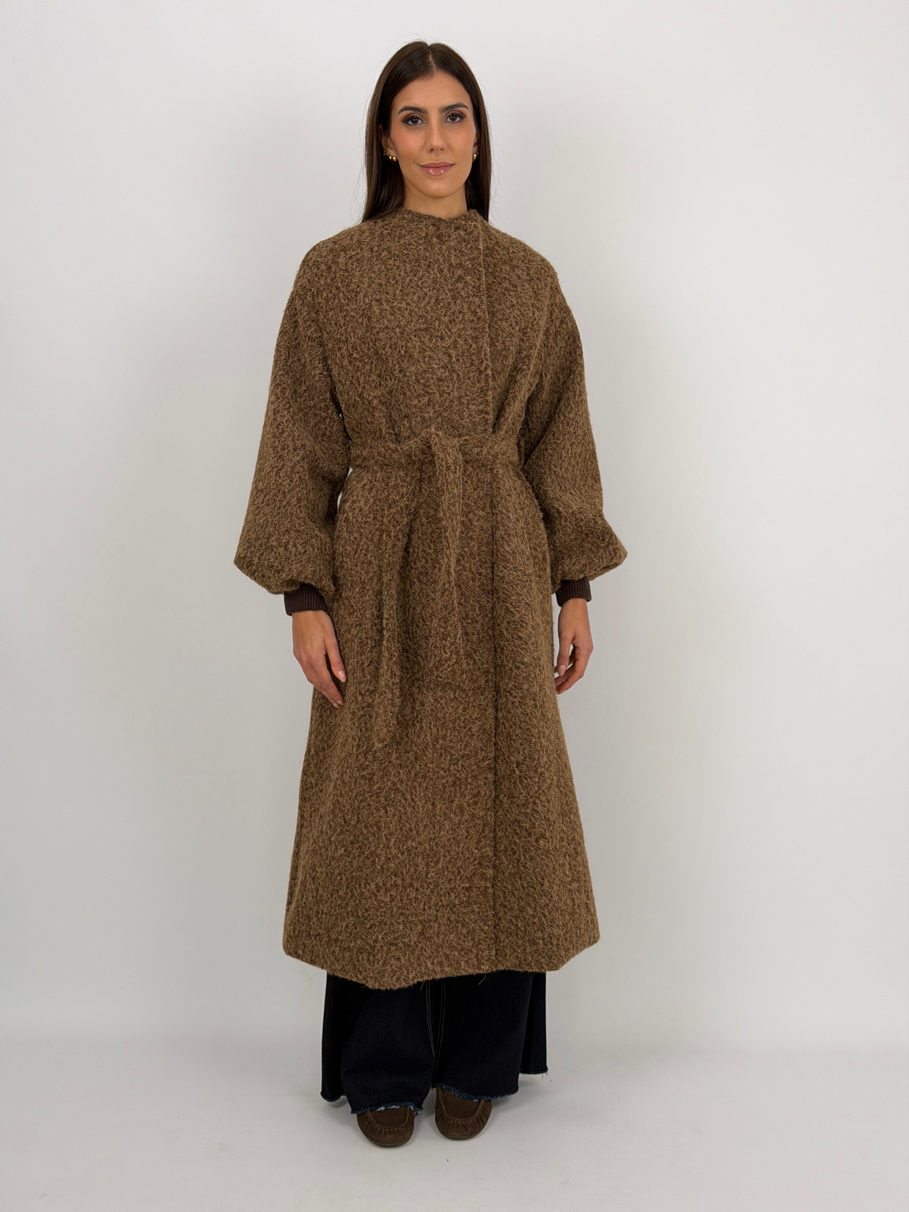 Cappotto Lumina marrone doppiopetto con bottoni interni, cintura in vita, maniche con polsino a coste e fodera interna