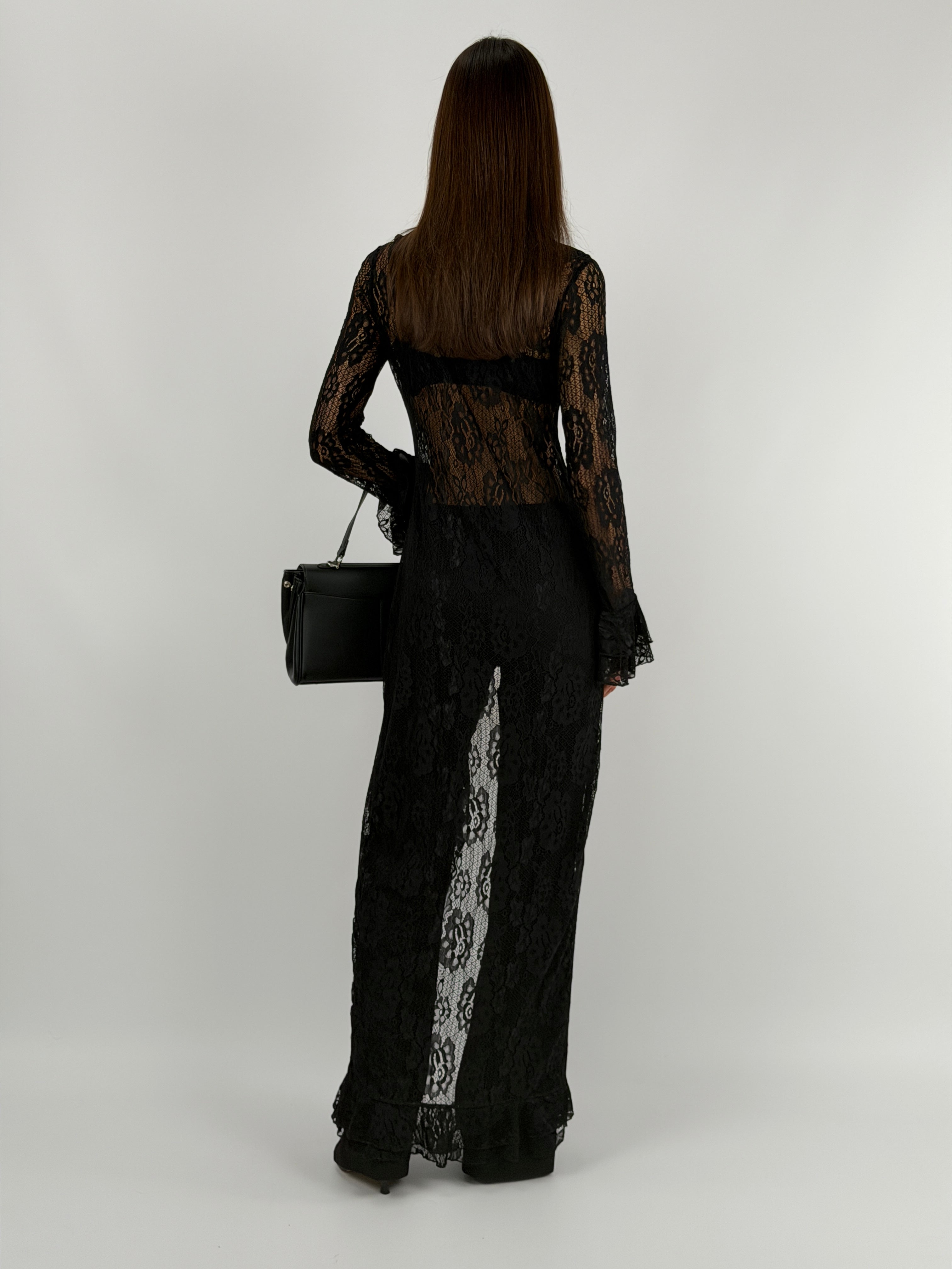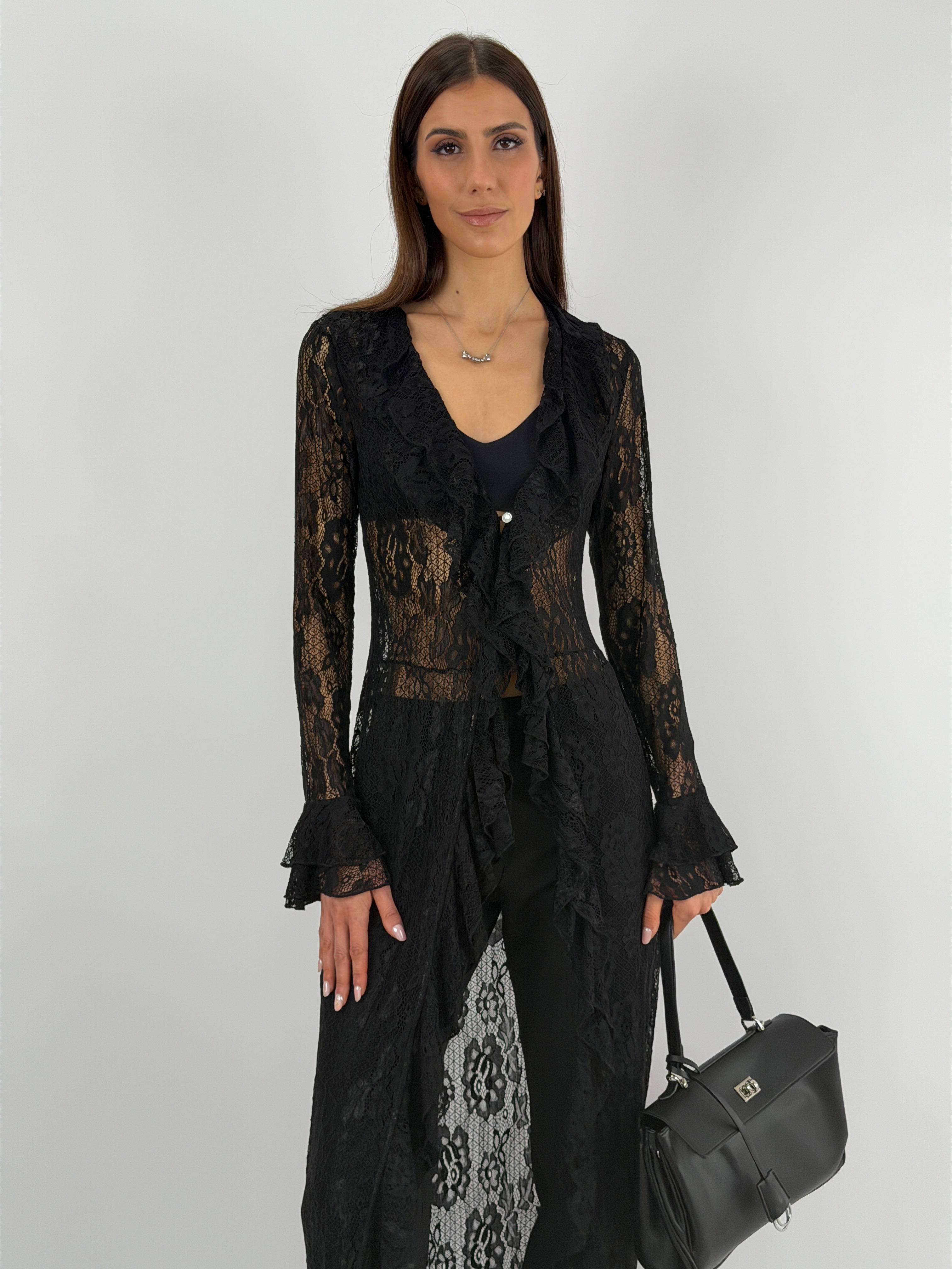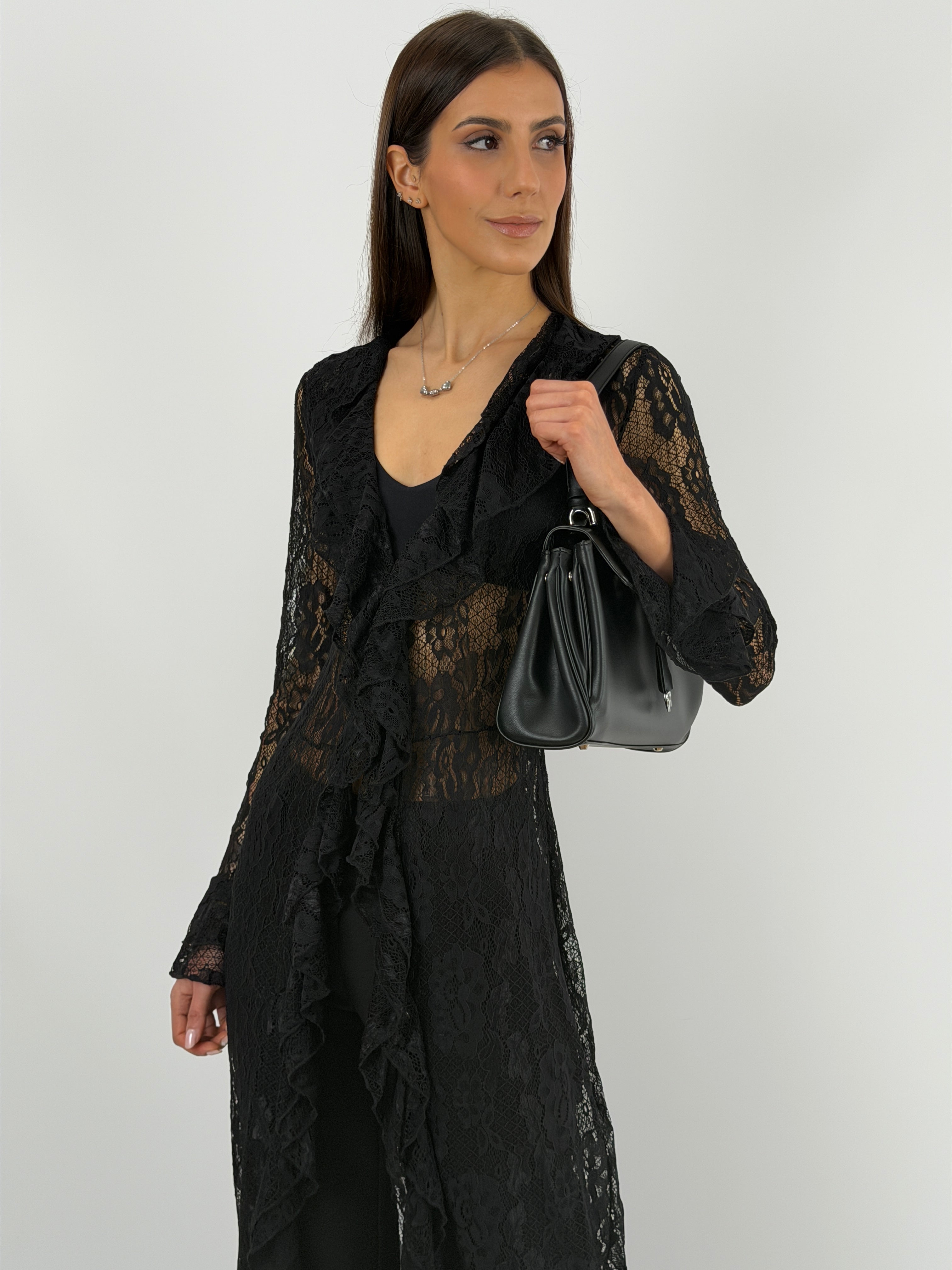 Cardigan lungo nero in pizzo con maniche lunghe e volant frontali e chiusura con bottoncini