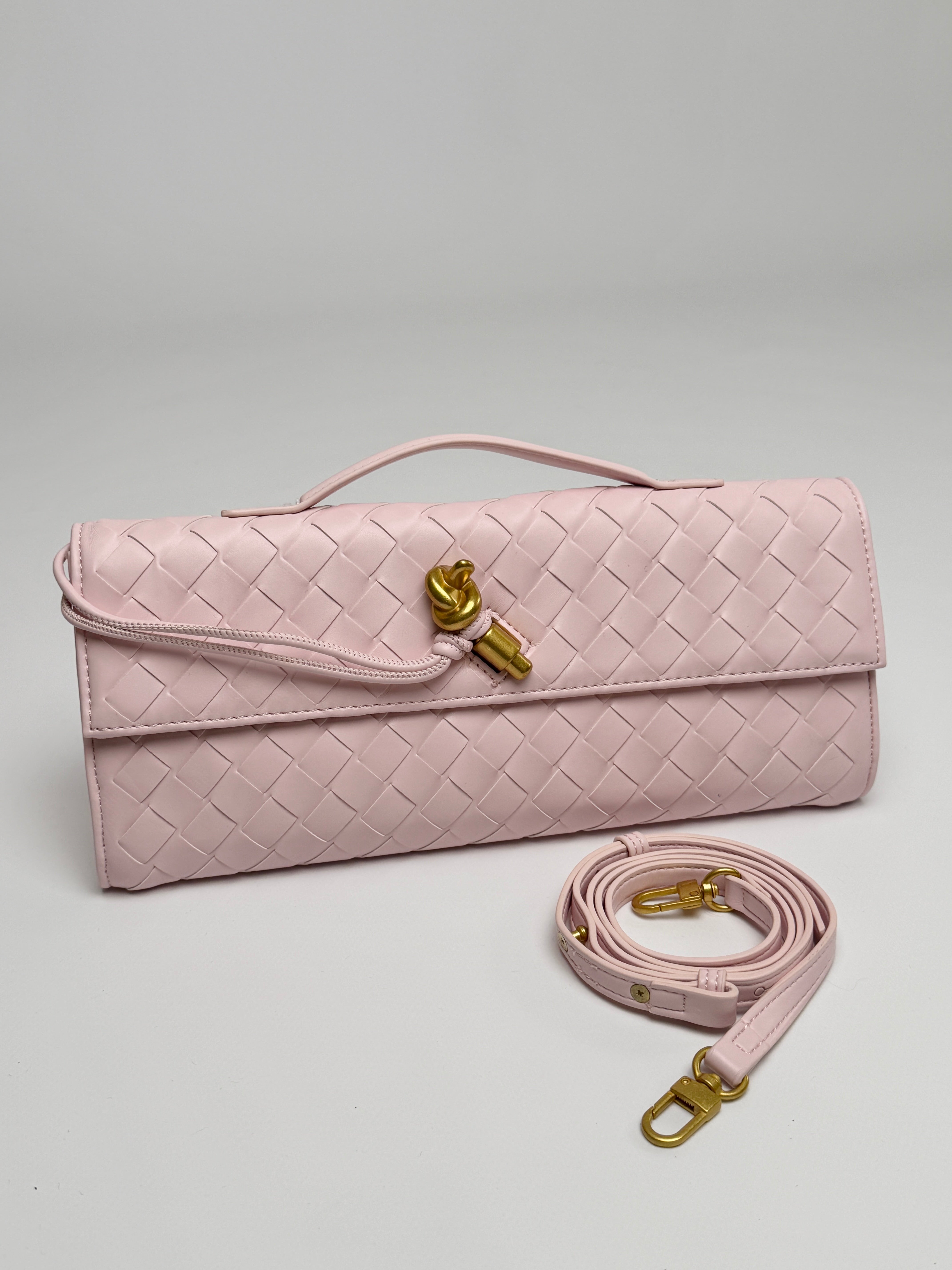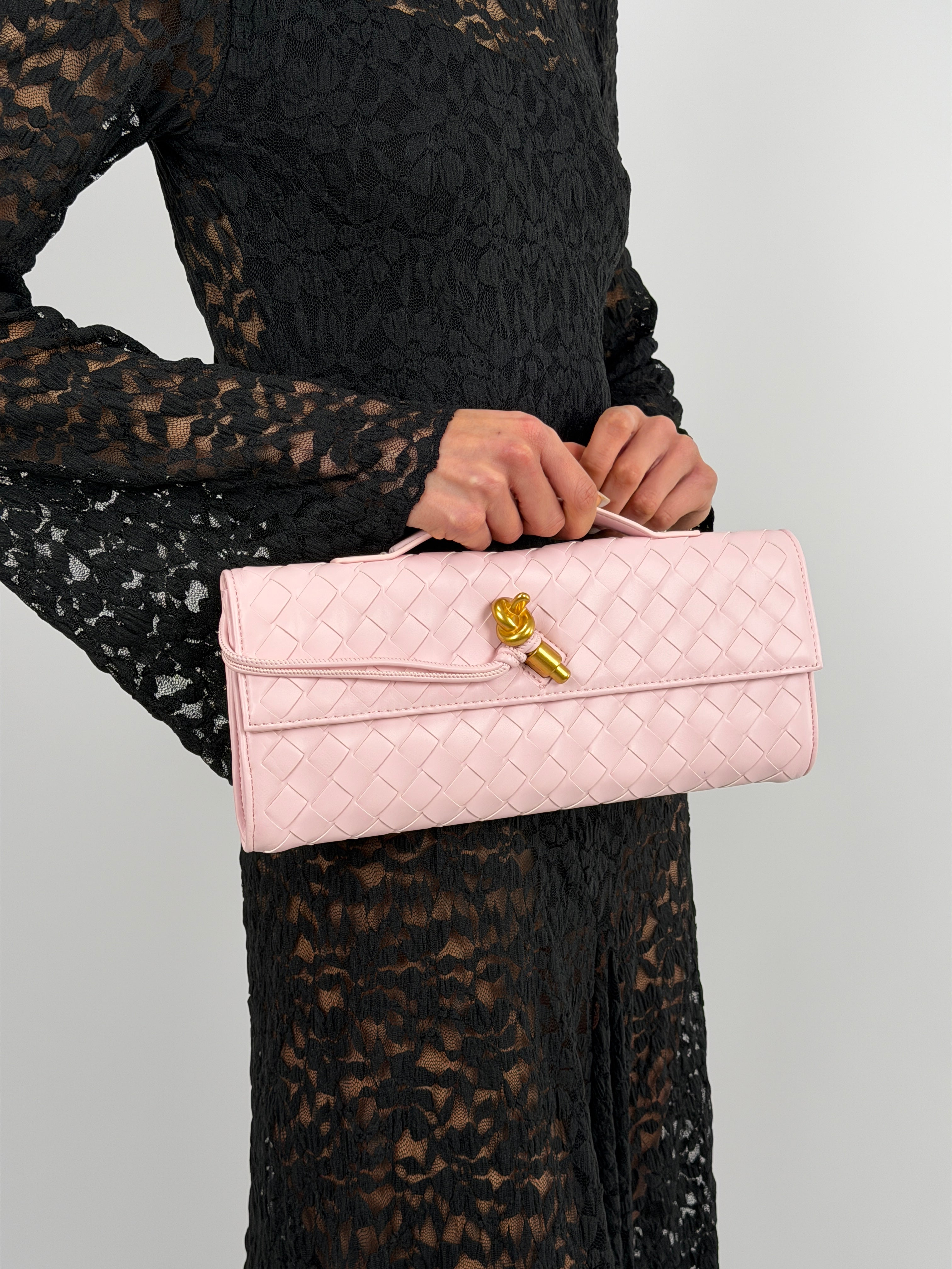 Clutch rosa pastello con manico in eco pelle intrecciata e chiusura Knot in metallo. Due tasche interne, una con zip. Elegante e compatta, perfetta per completare i tuoi look.
