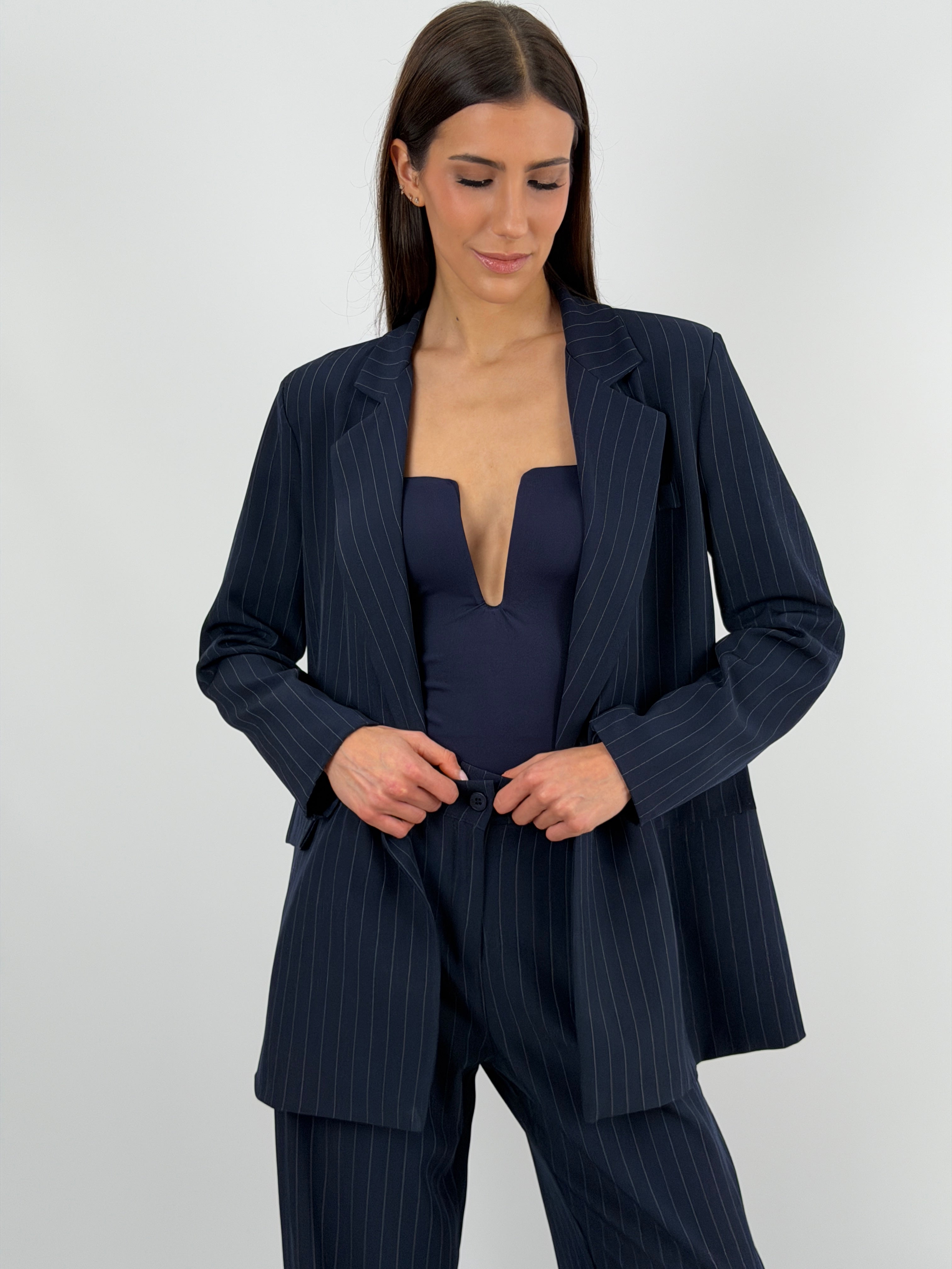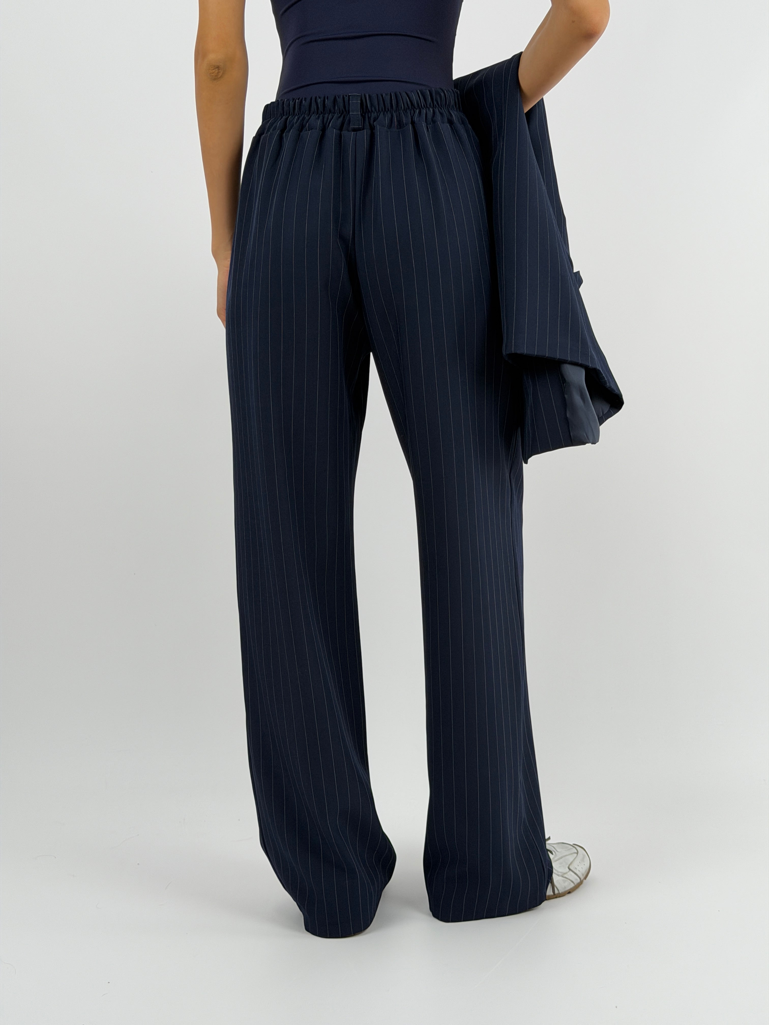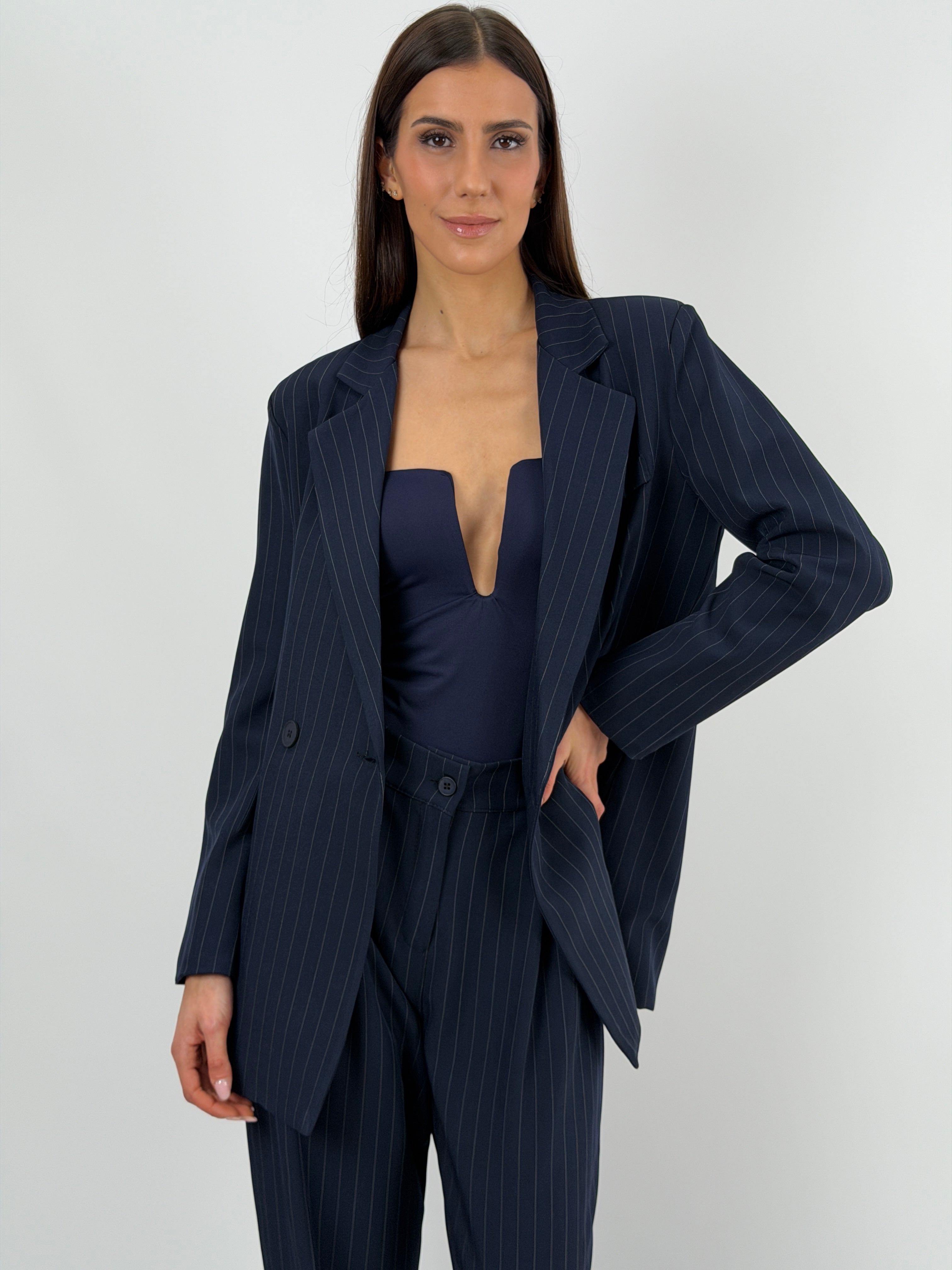 Elegante completo blu gessato light, composto da giacca a doppio petto e pantaloni a palazzo. La giacca ha chiusura con bottoni, mentre il pantalone presenta un elastico in vita.