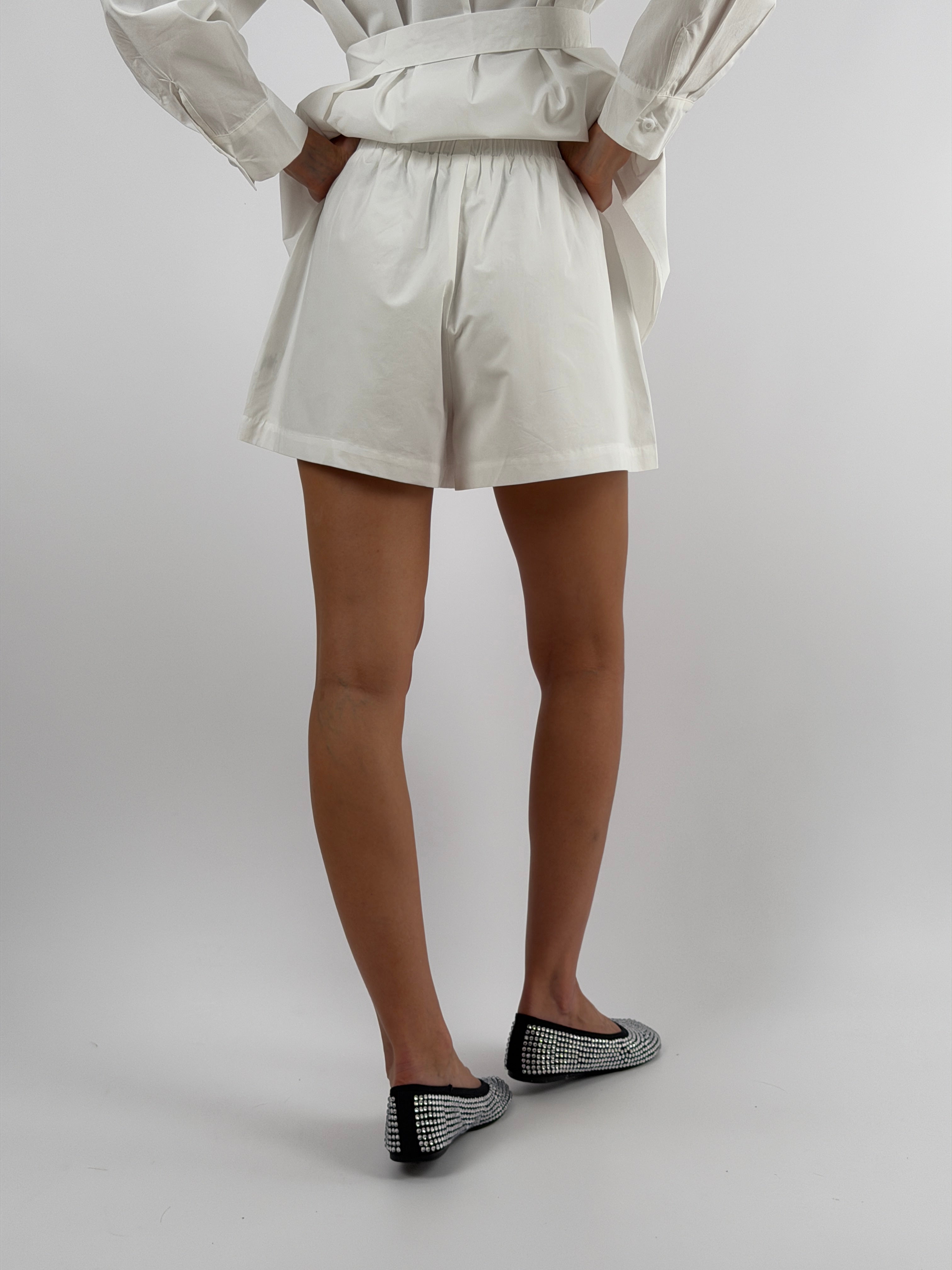 Set coordinato bianco in cotone con camicia e shorts. Camicia over con colletto classico, bottoni e cintura in pizzo integrata con fibbia. Pantaloncino corto con elastico in vita