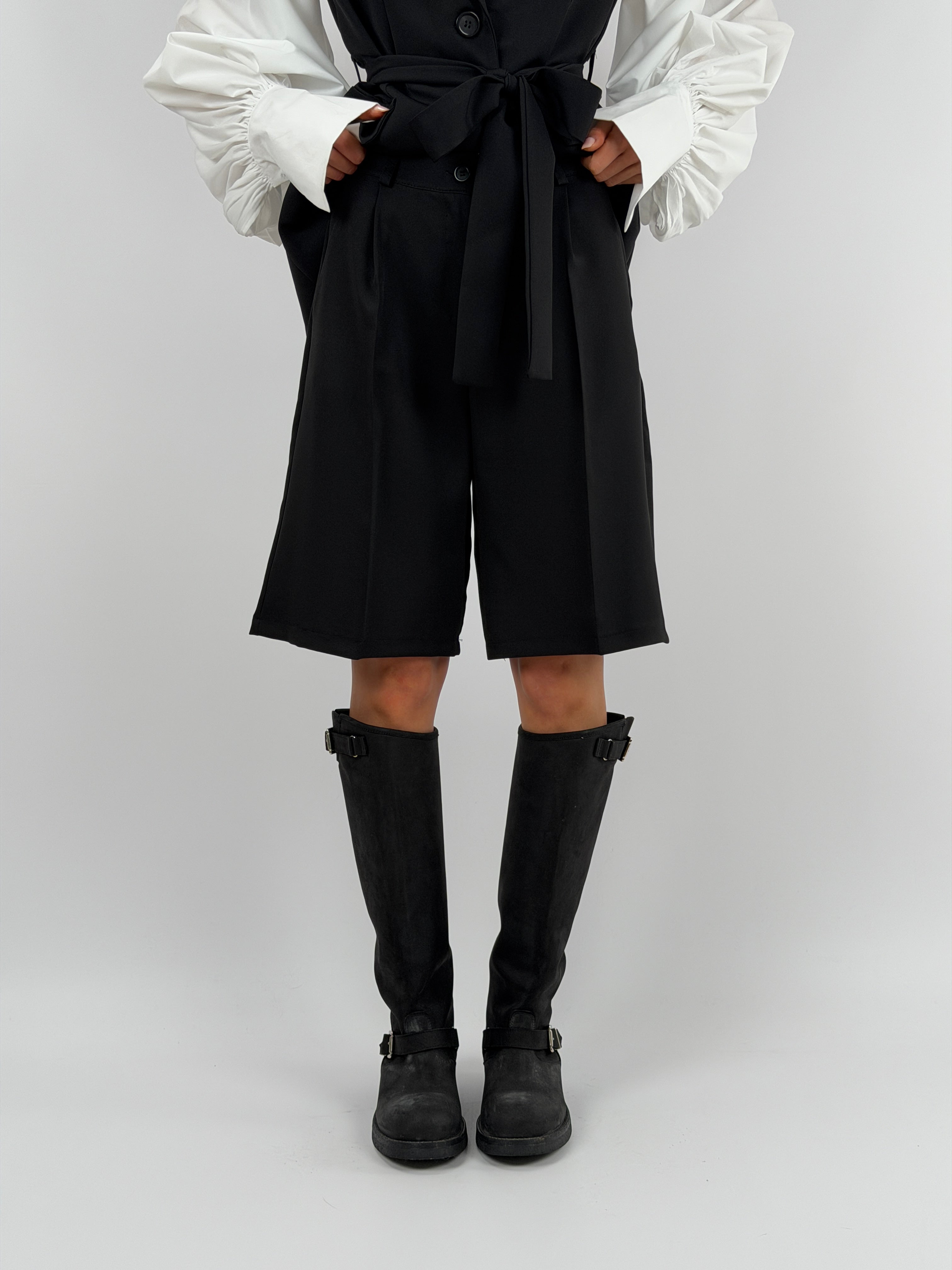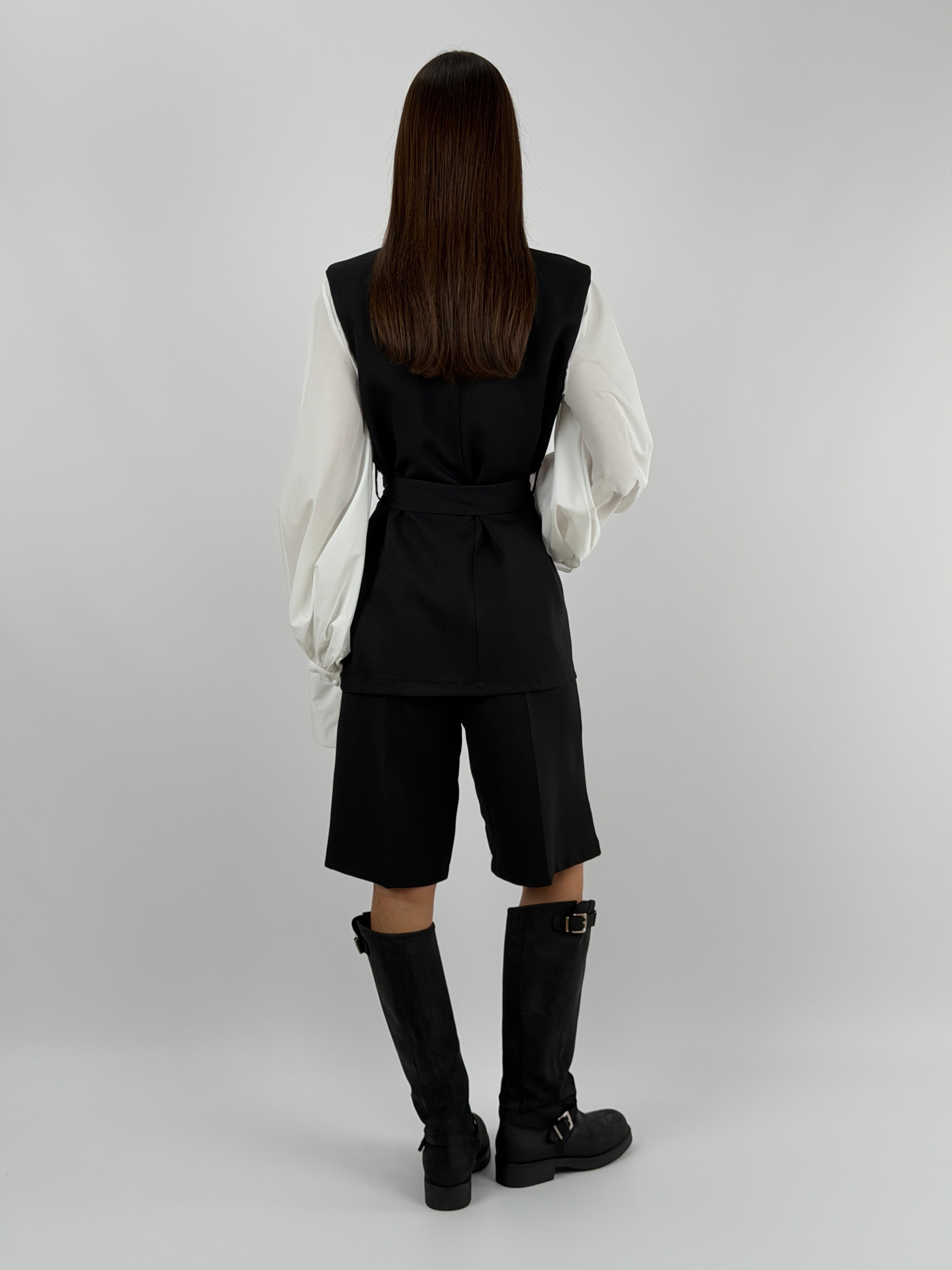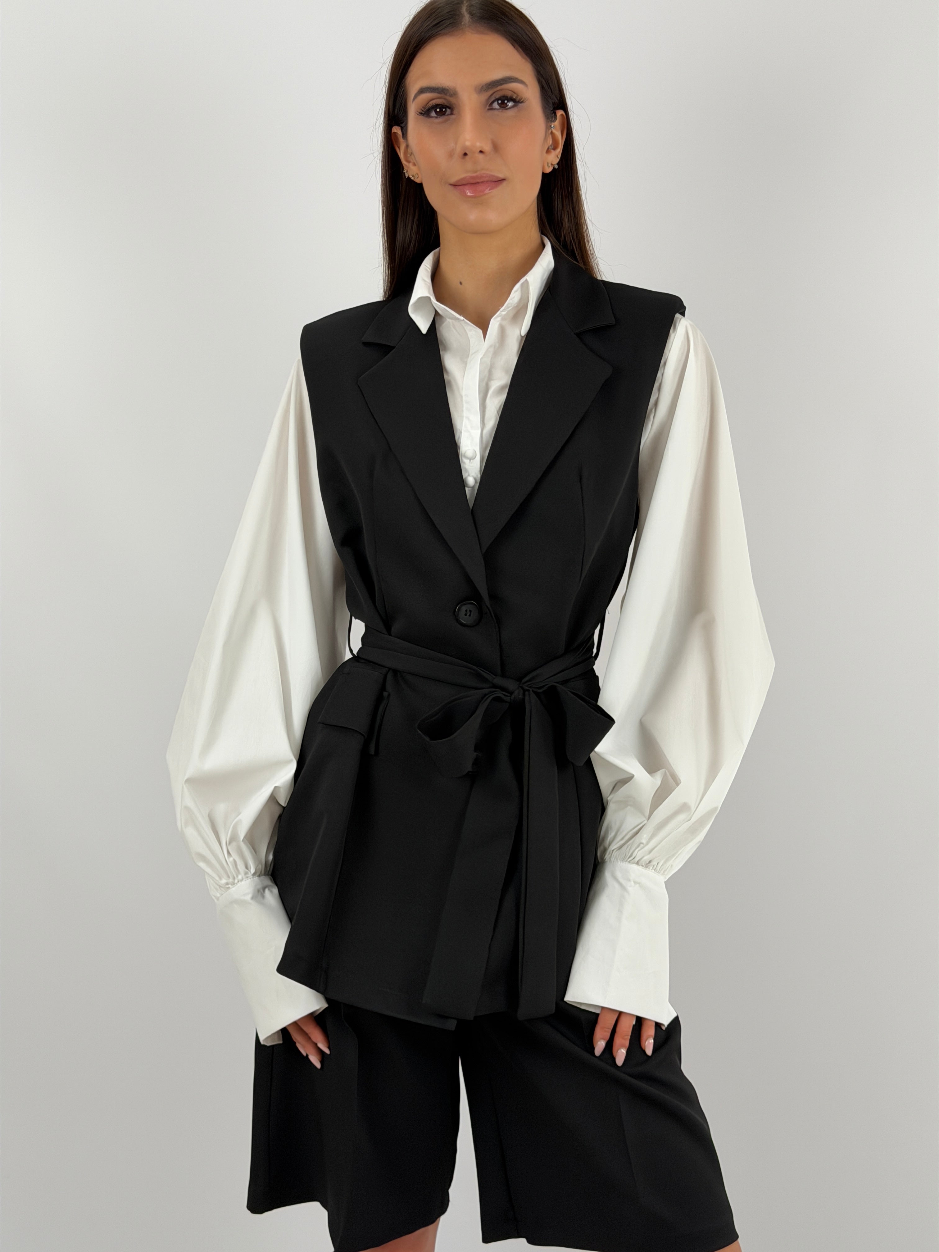 Set coordinato nero con gilet e bermuda.