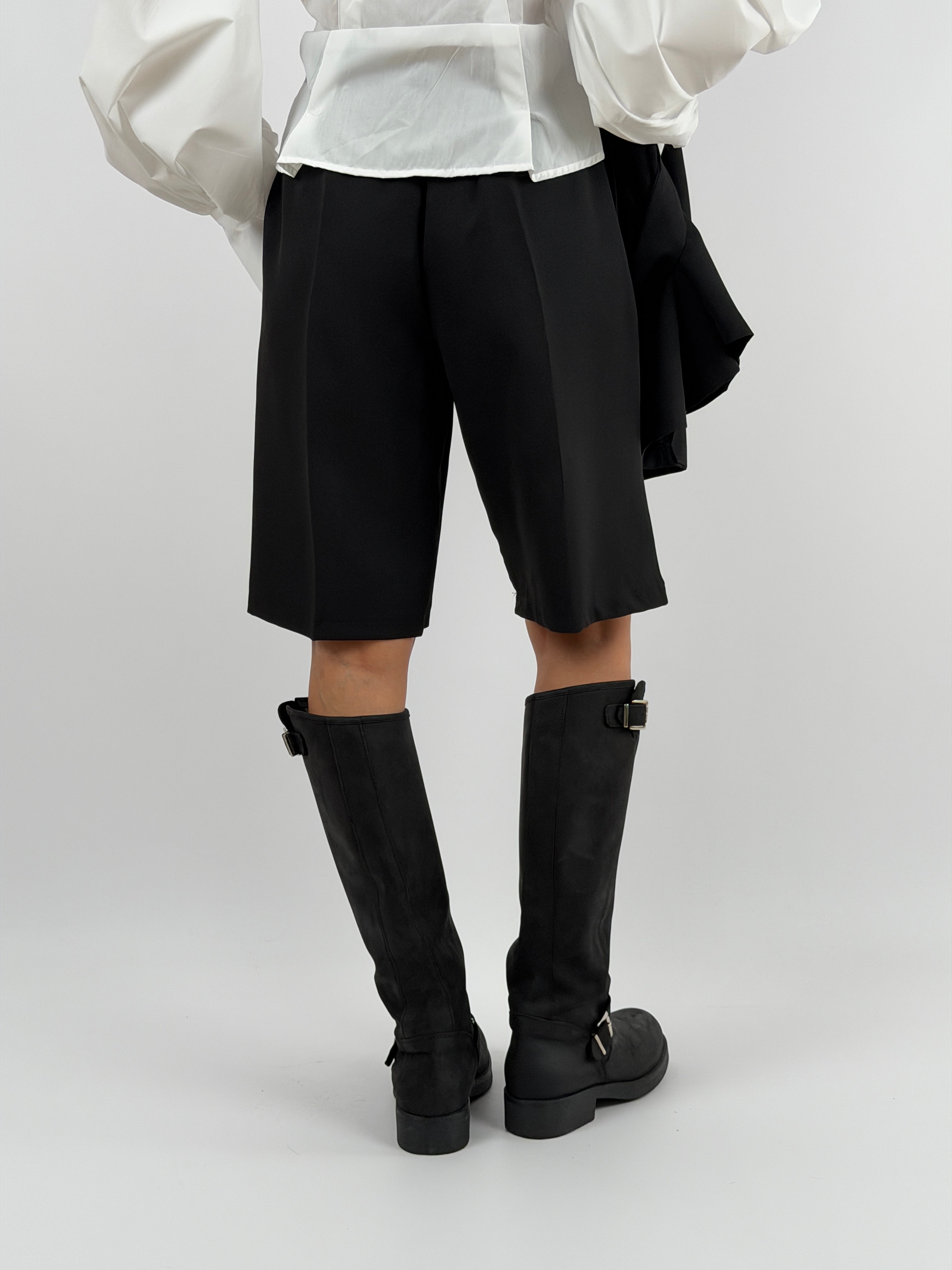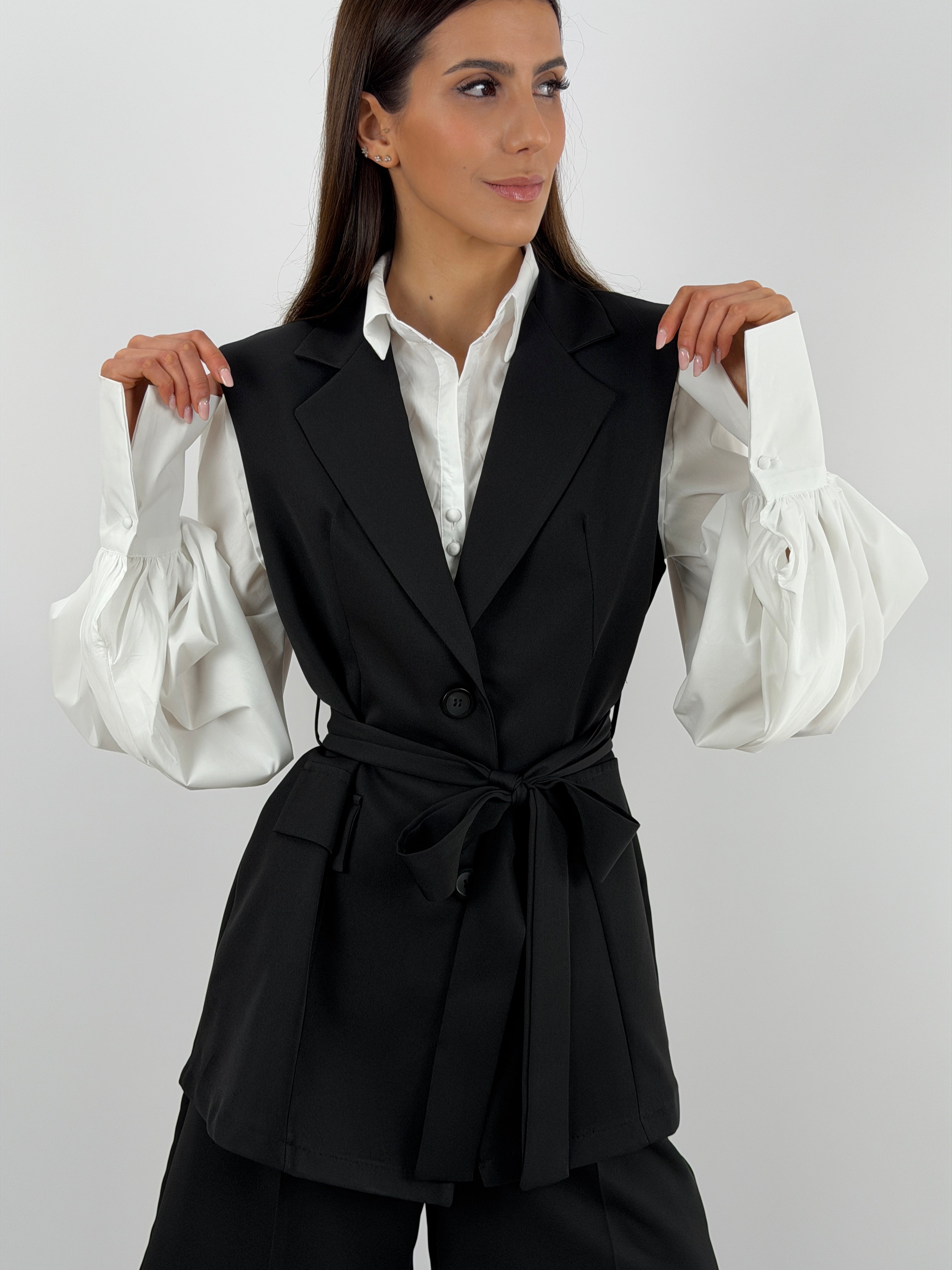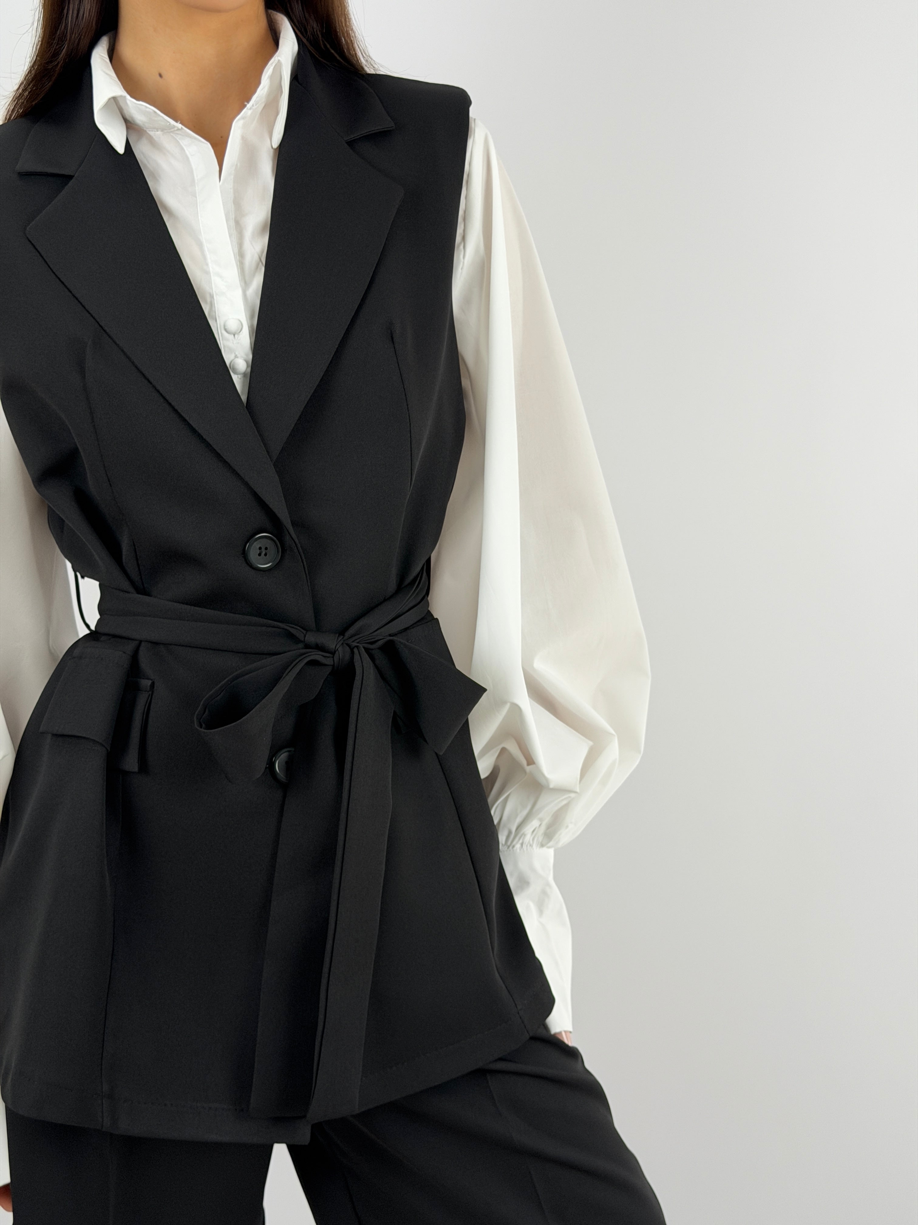Set coordinato nero con gilet e bermuda.