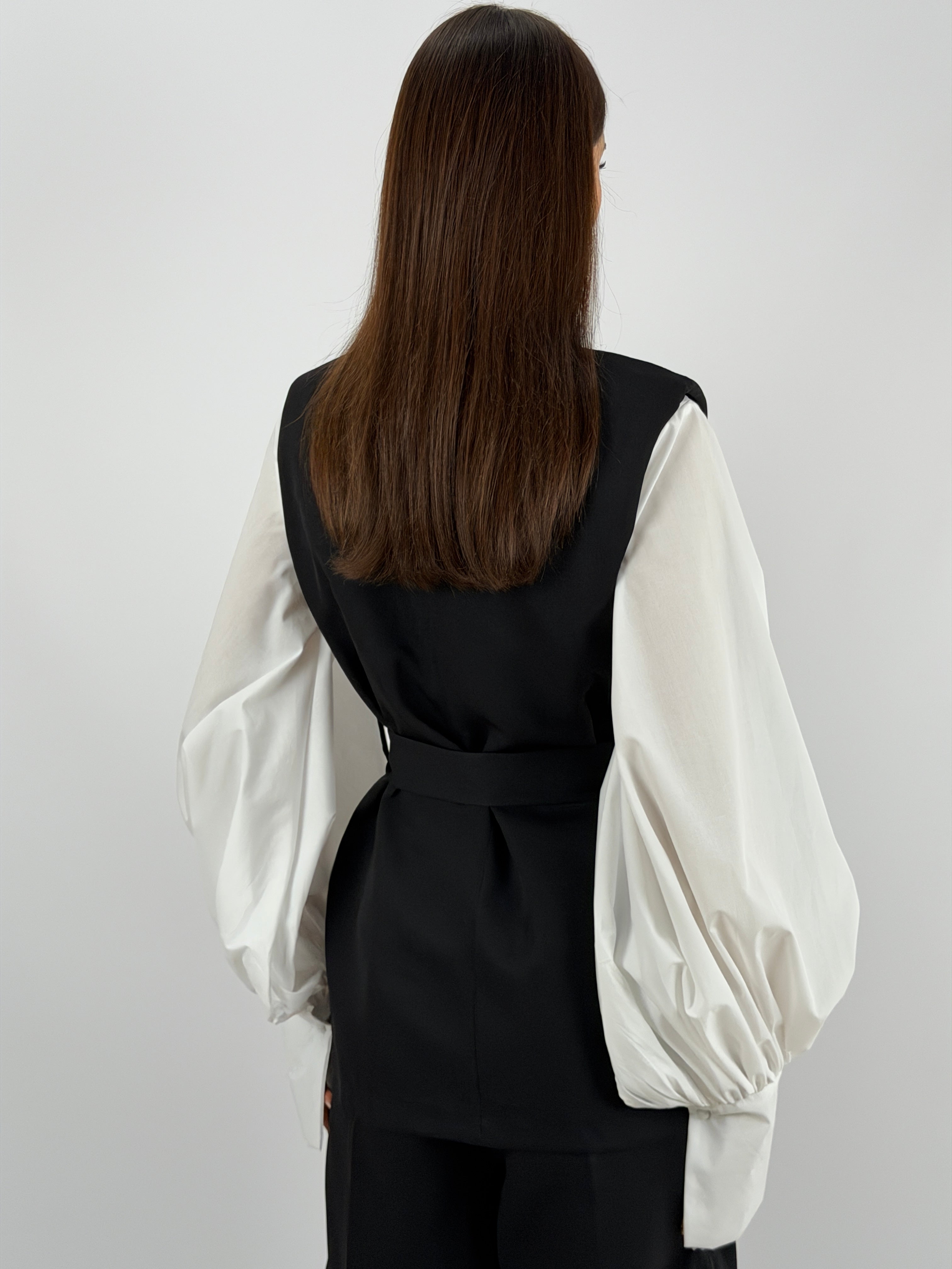 Gilet smanicato a doppiopetto con revers e cintura in vita.
