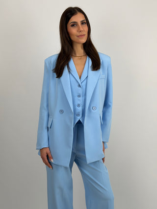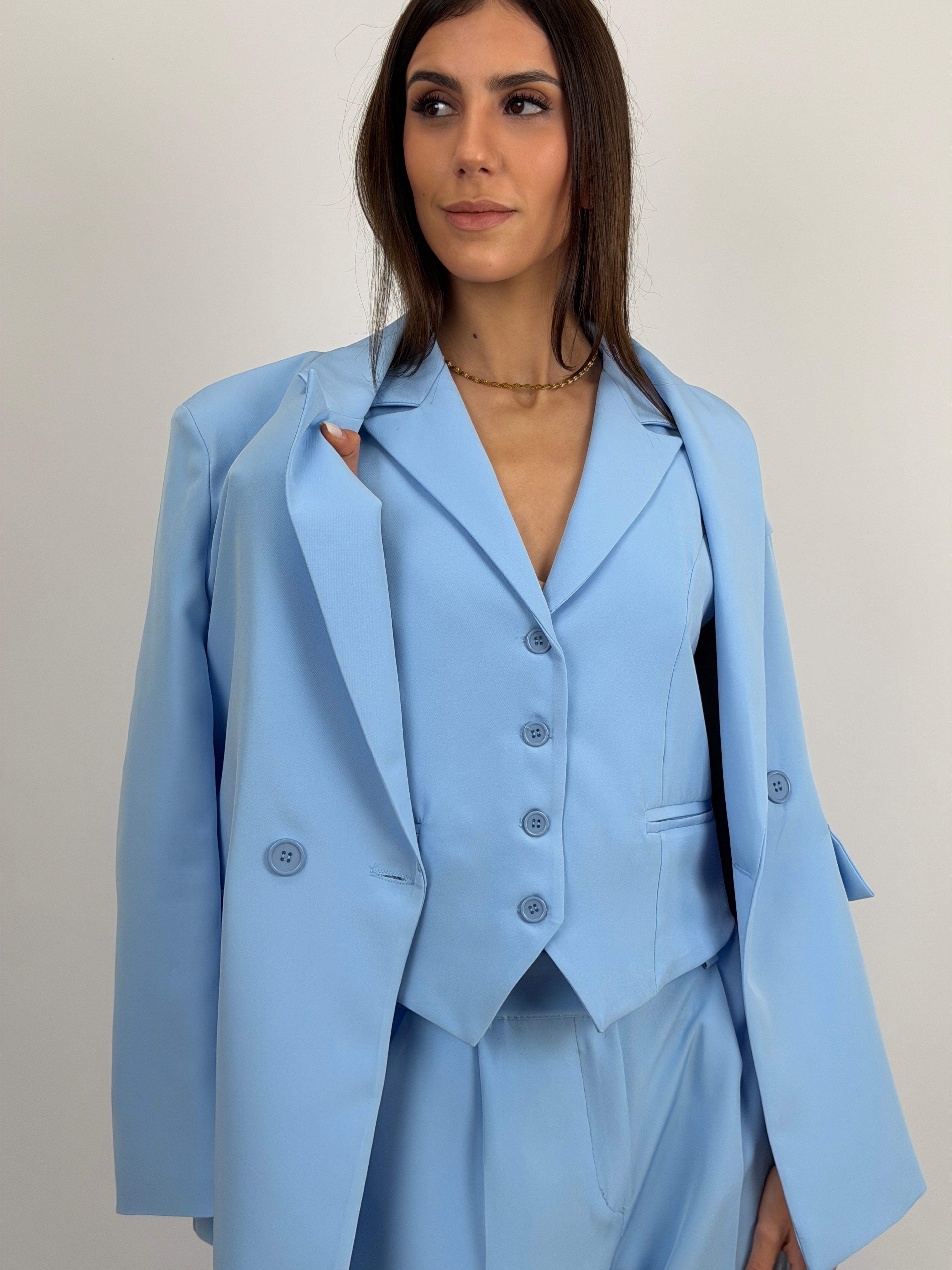Gilet smanicato azzurro con revers, chiusura frontale con bottoni e fodera interna