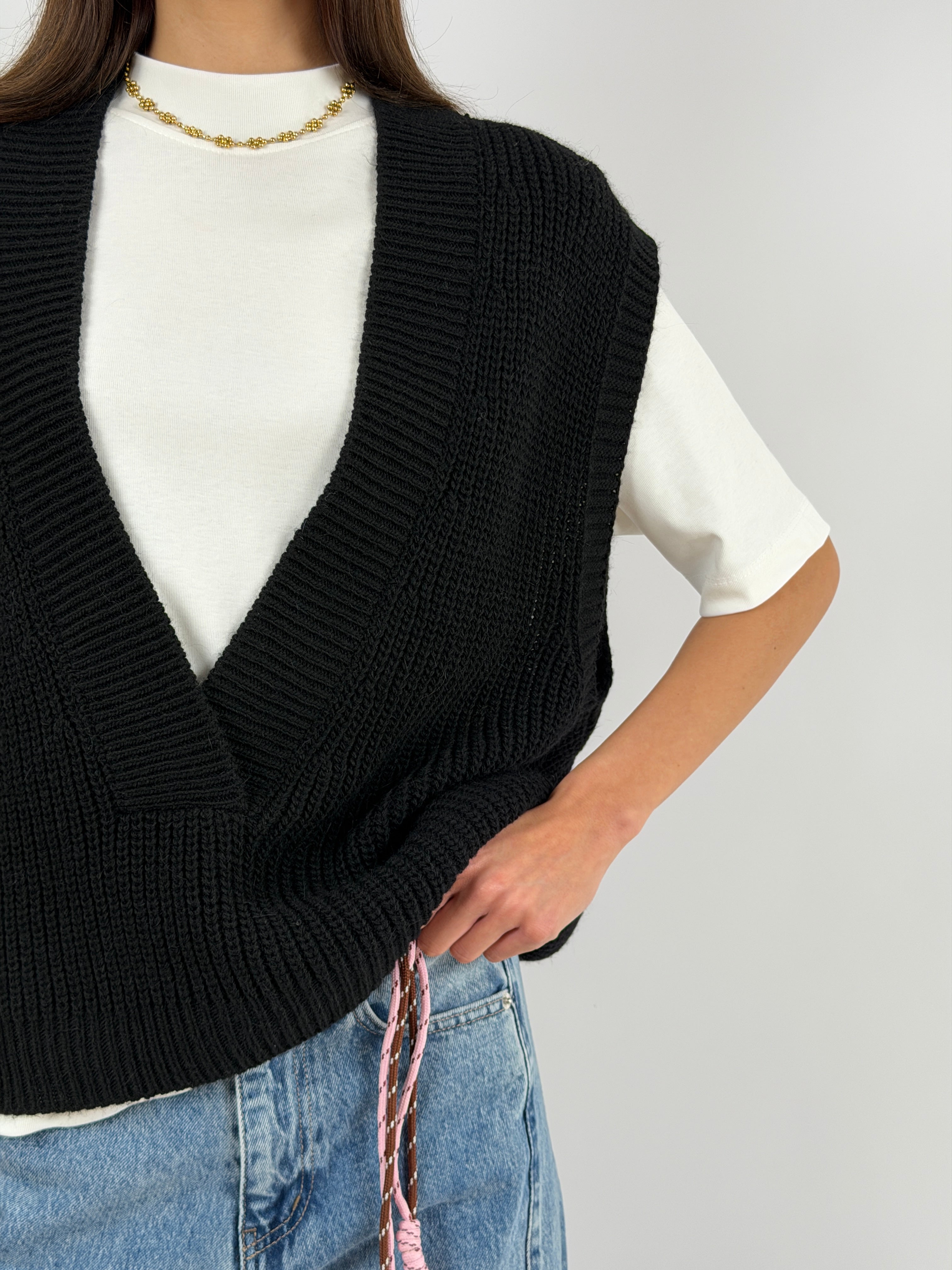 Gilet smanicato nero oversize in maglia a coste con scollo a V profondo