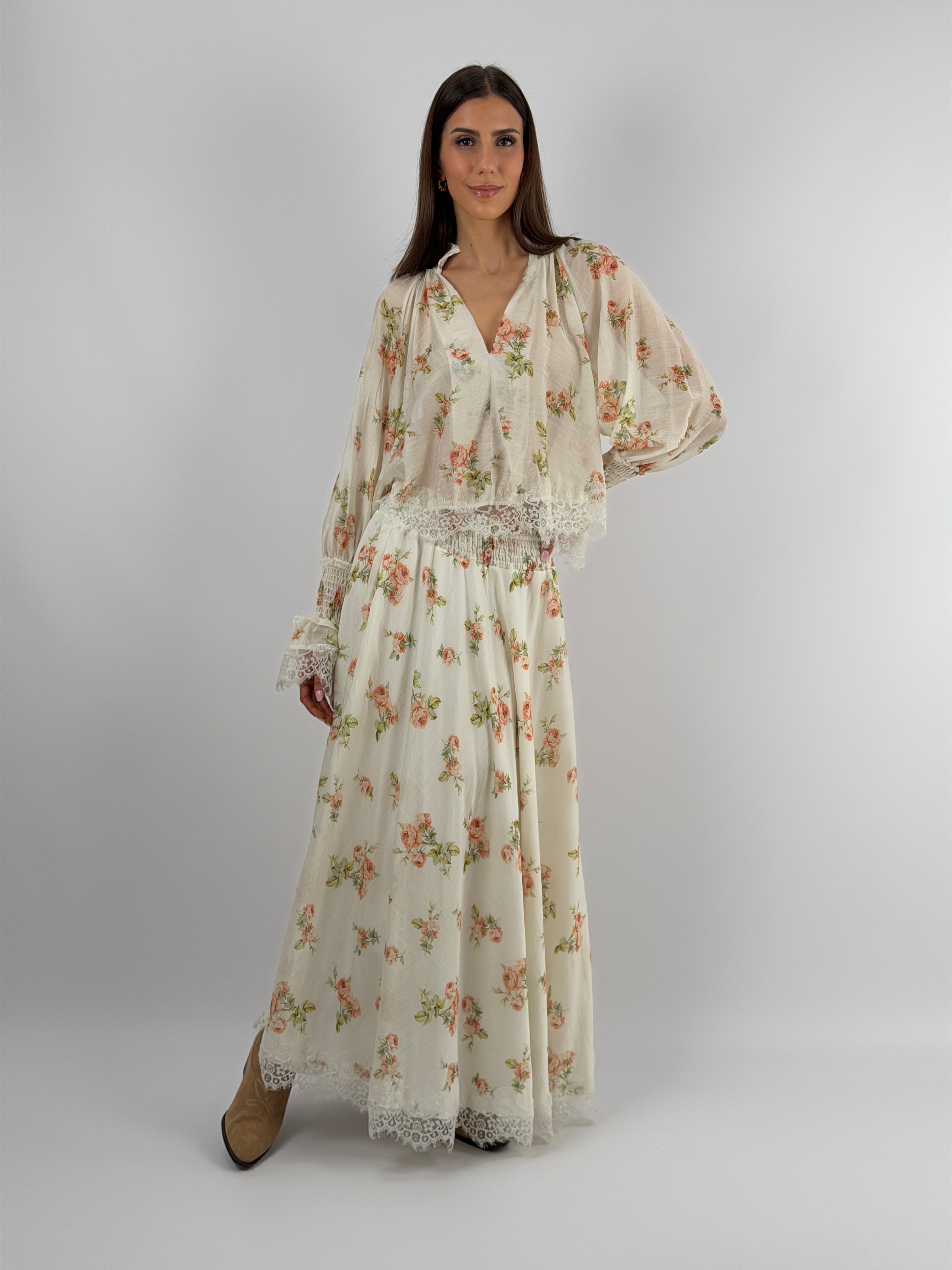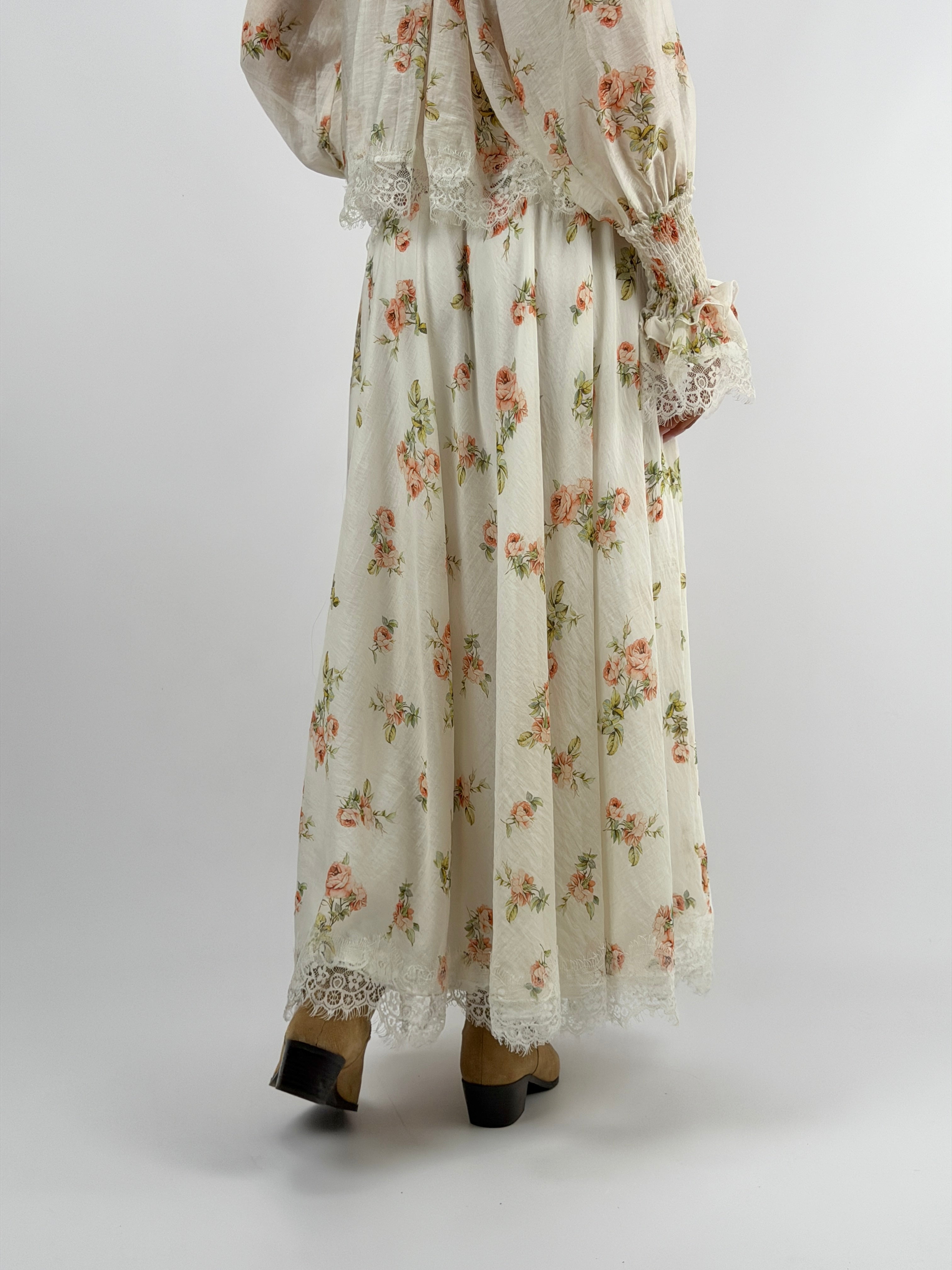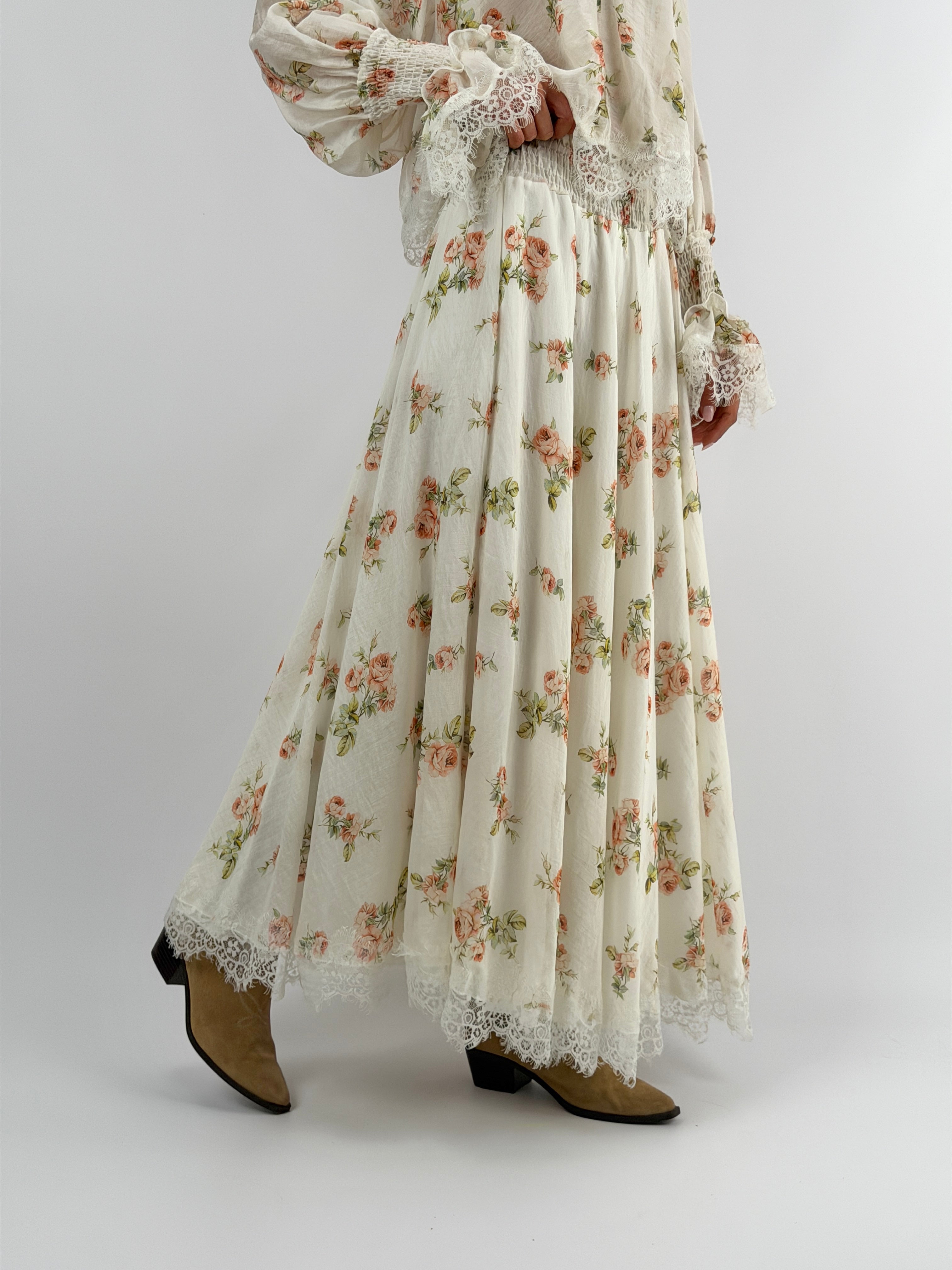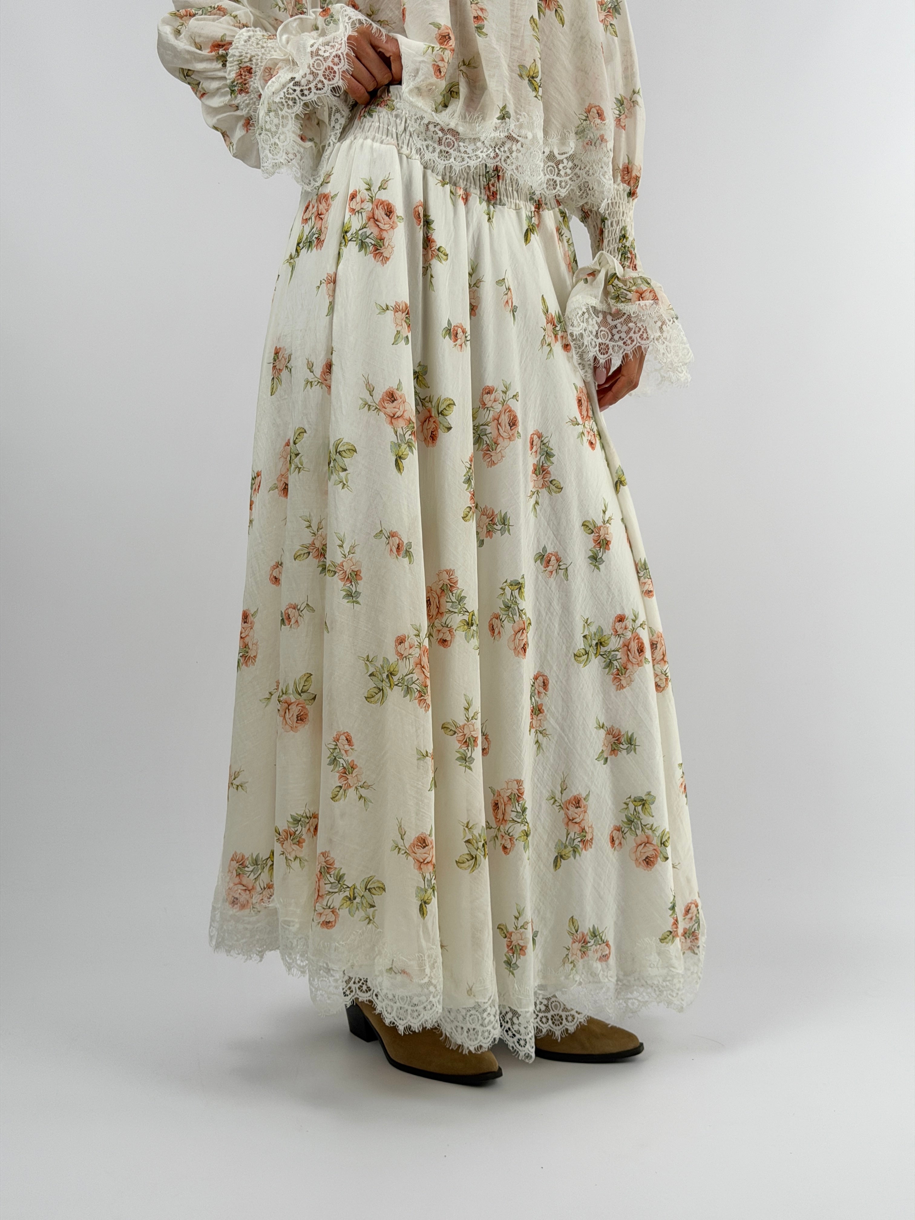 Gonna lunga Lumina con fantasia floreale su sfondo bianco, elastico in vita e sottogonna integrata. Bordo in pizzo sul fondo