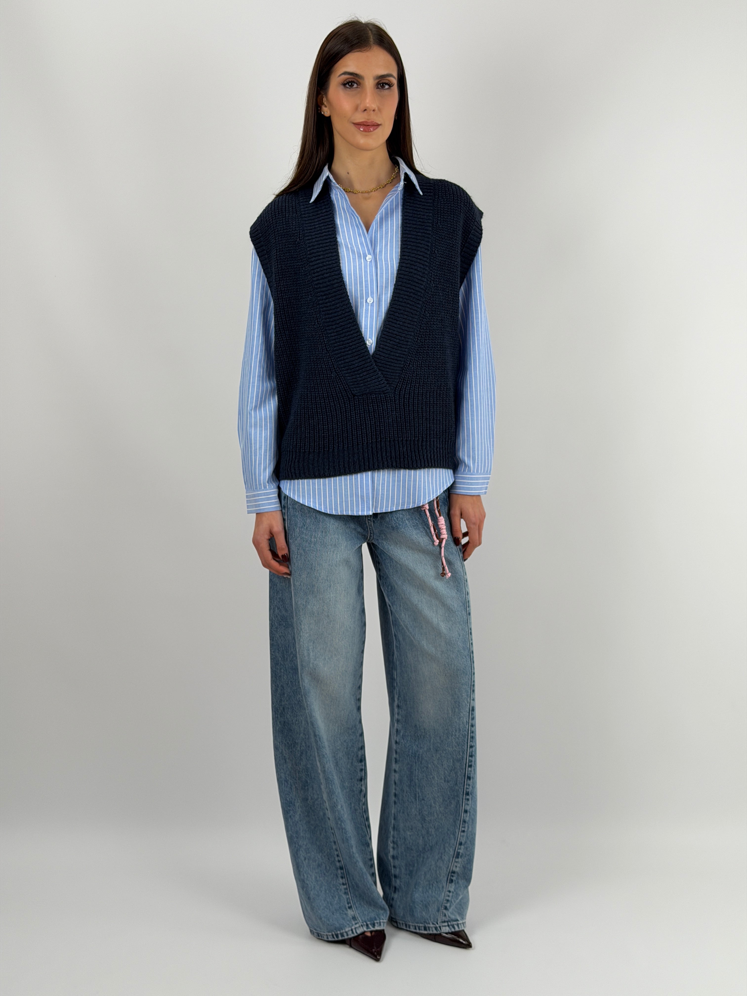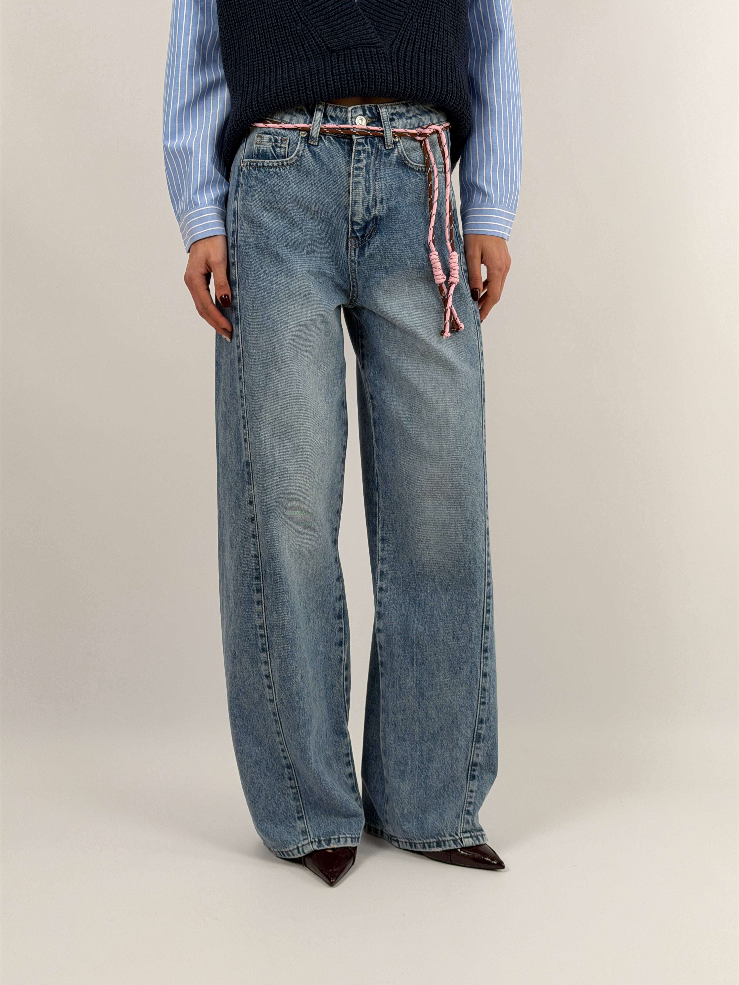 Jeans modello wide leg in lavaggio chiaro con chiusura con zip e bottone, cordini in vita e cinque tasche.