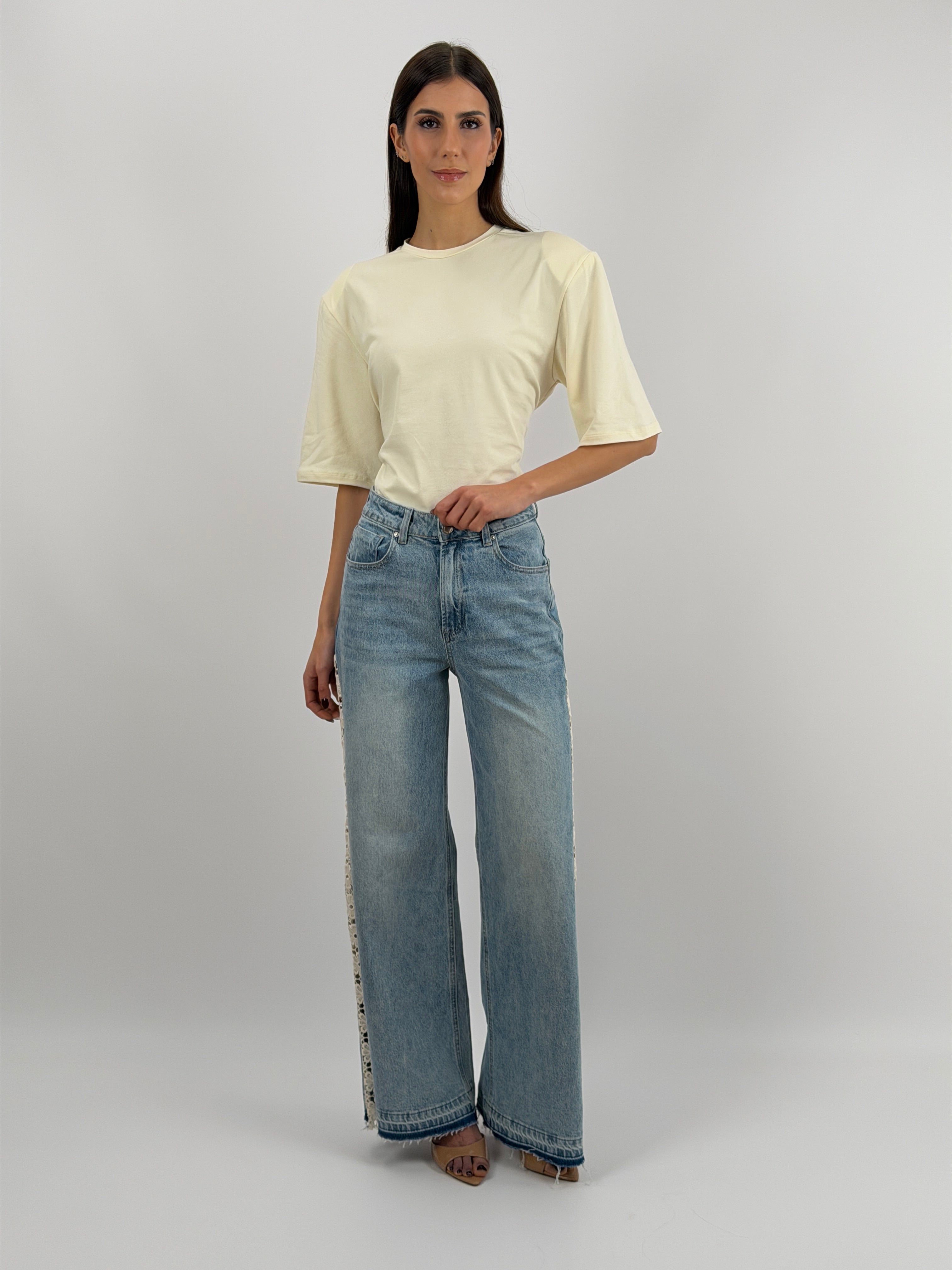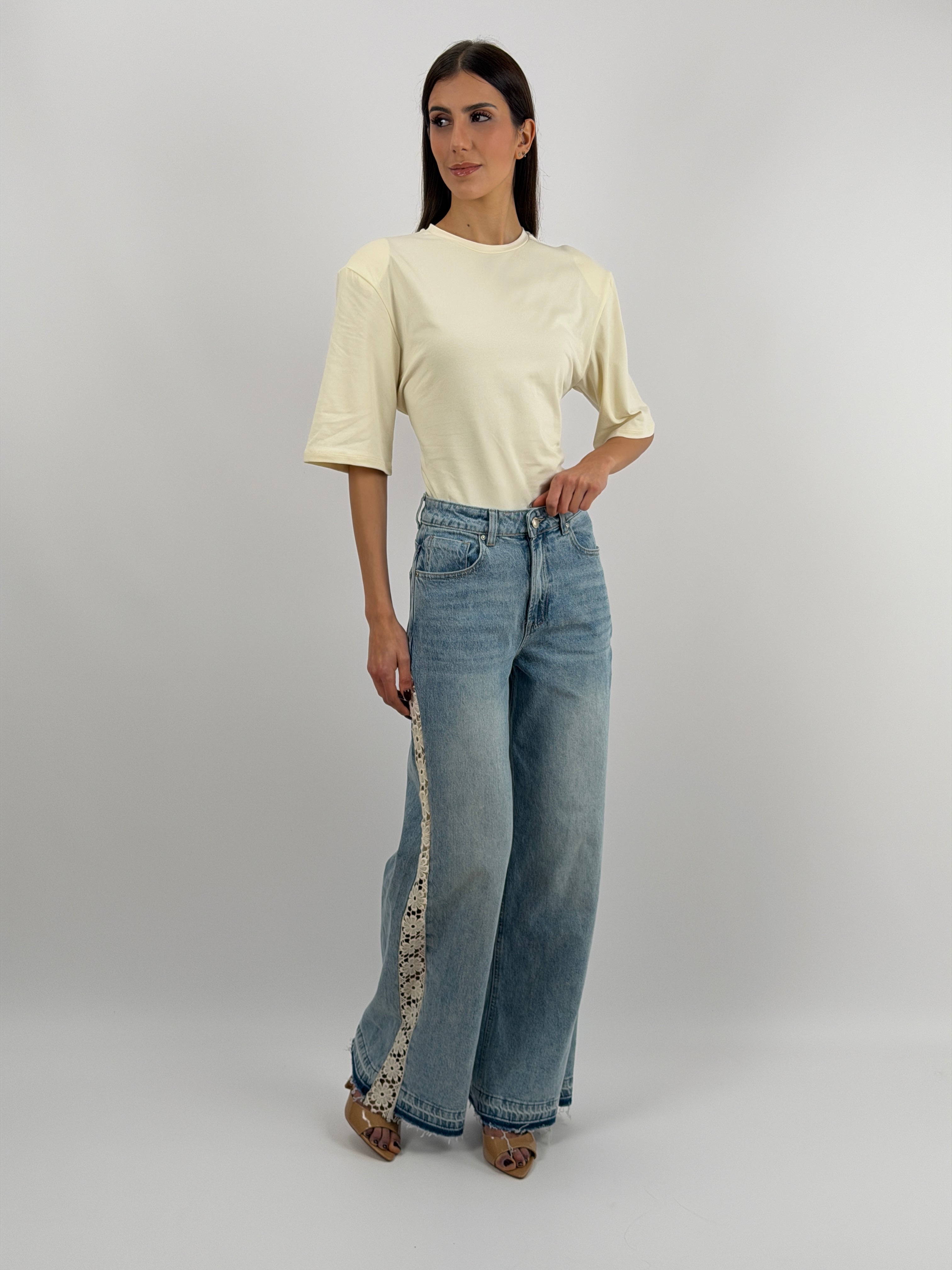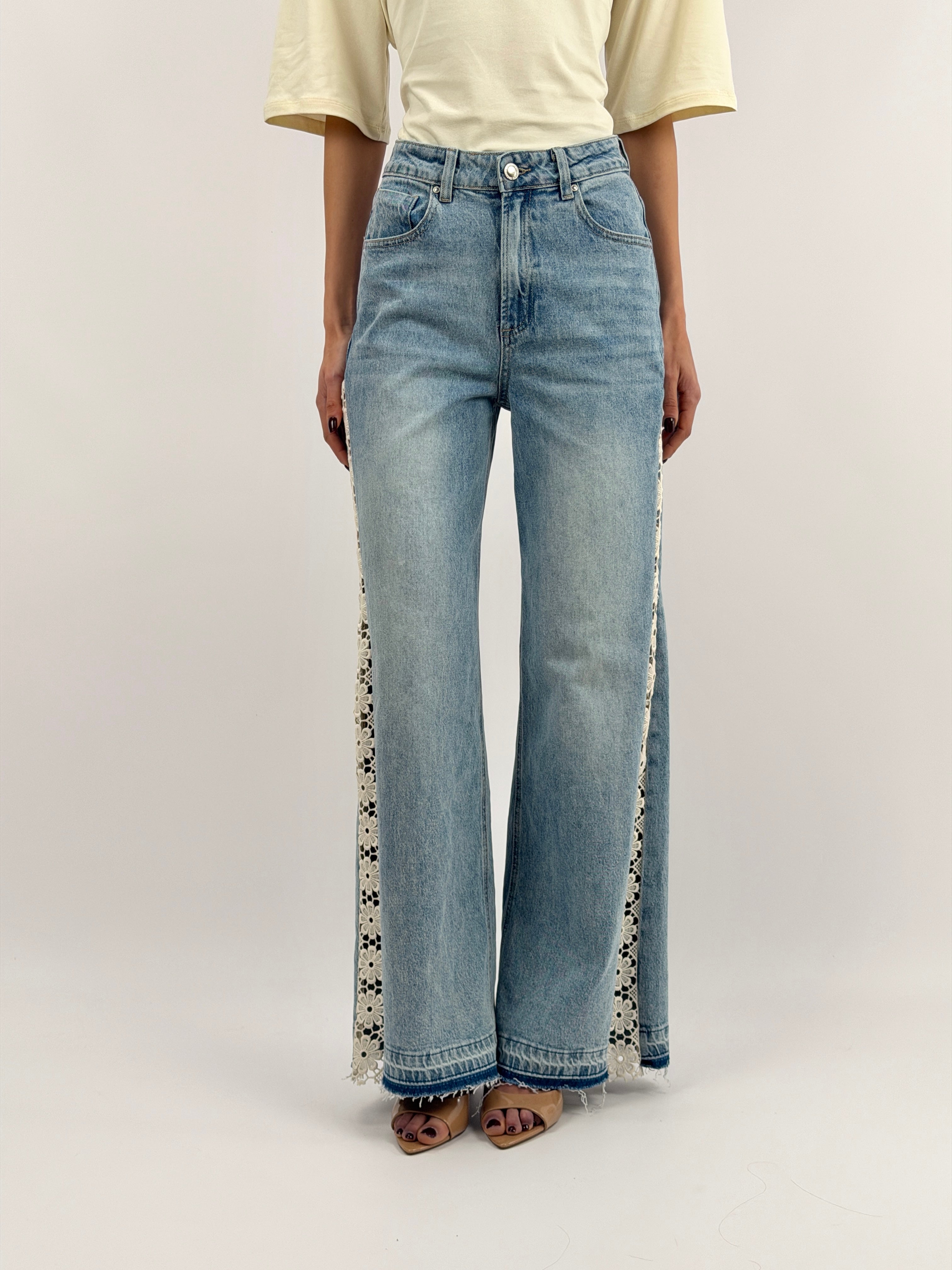 Jeans wide leg in lavaggio chiaro con inserti laterali in pizzo sangallo a motivo floreale. Cinque tasche e chiusura con zip e bottone